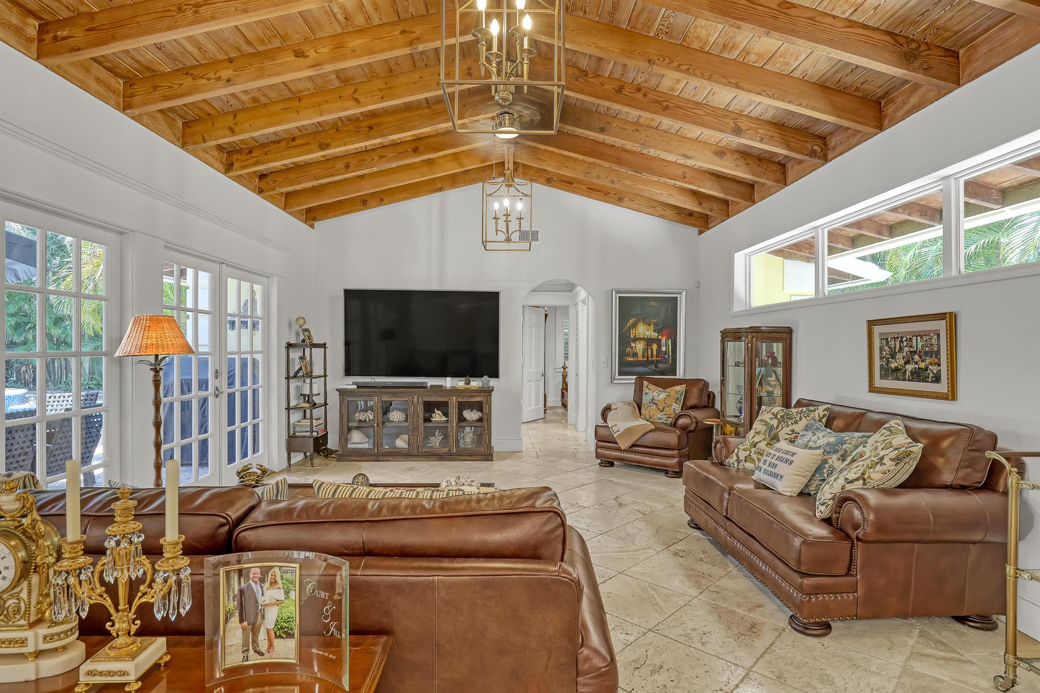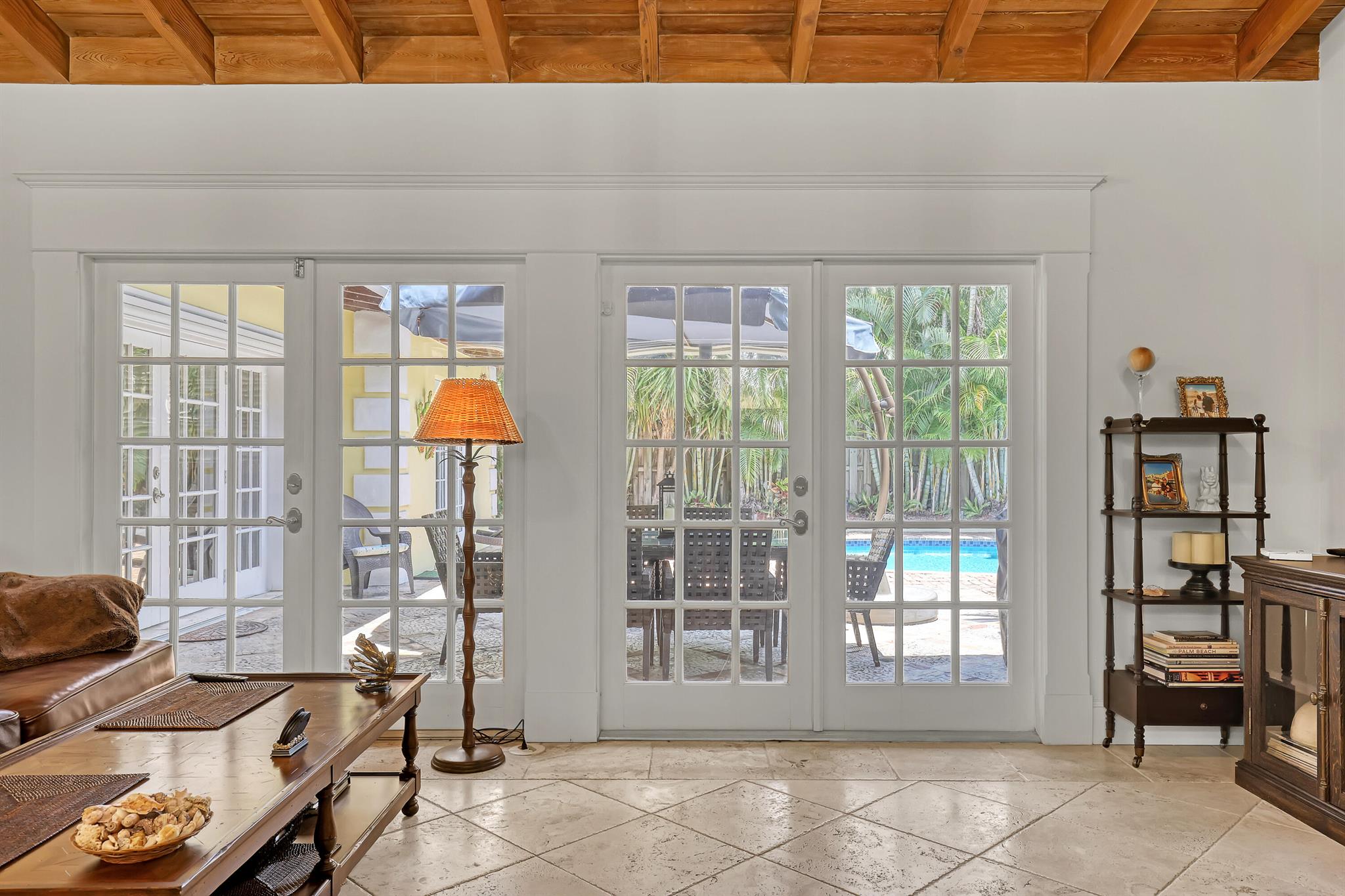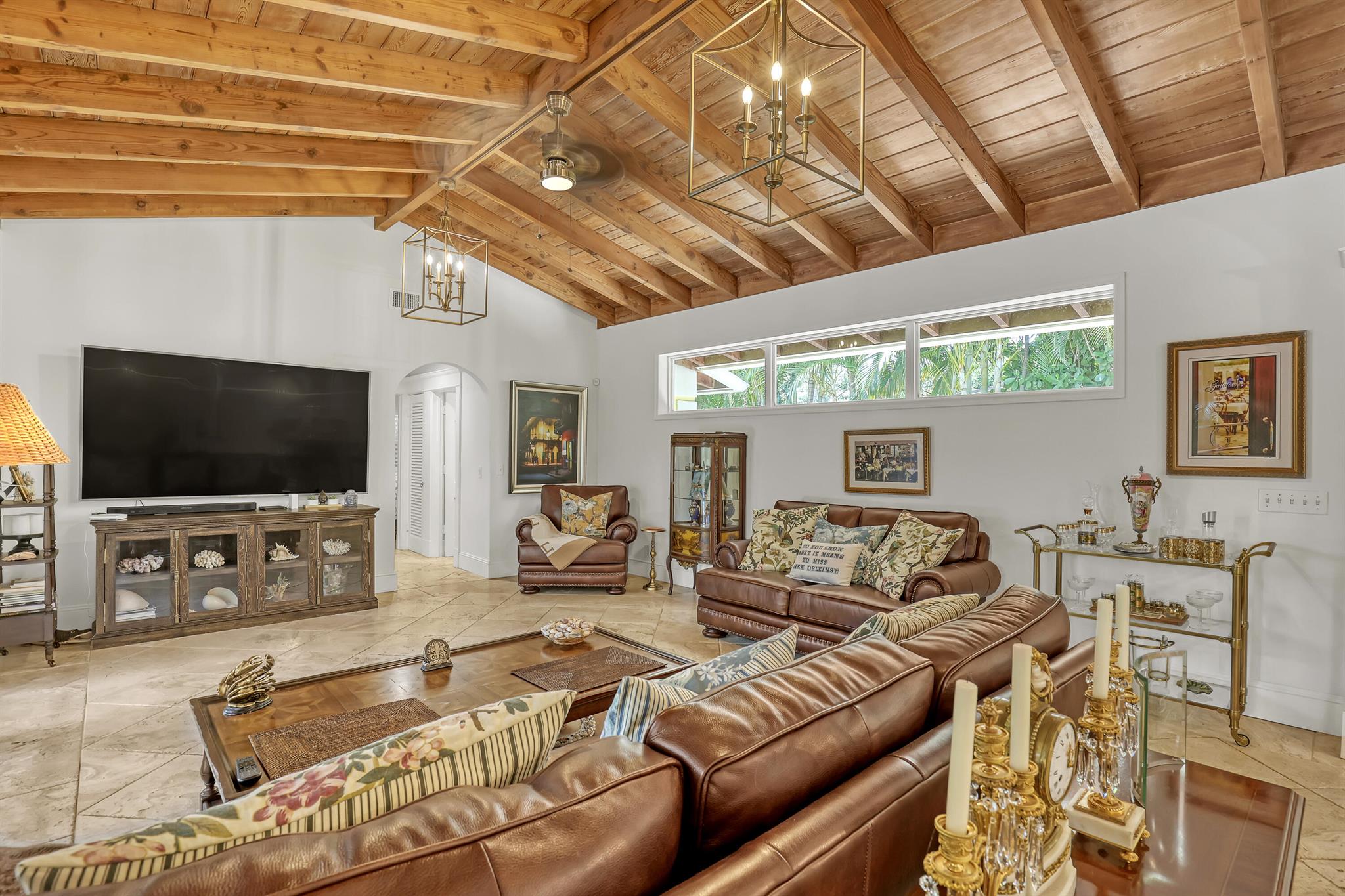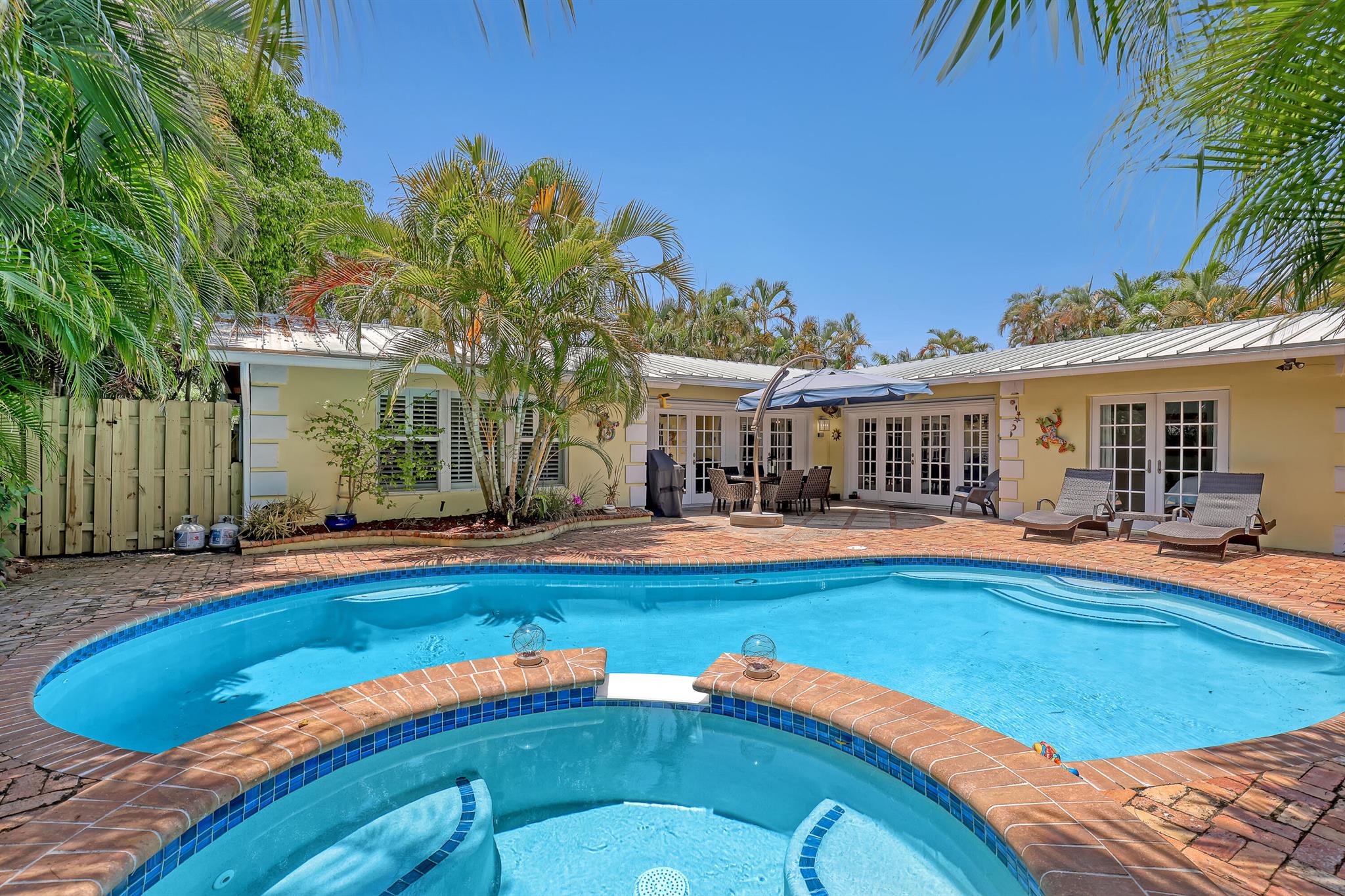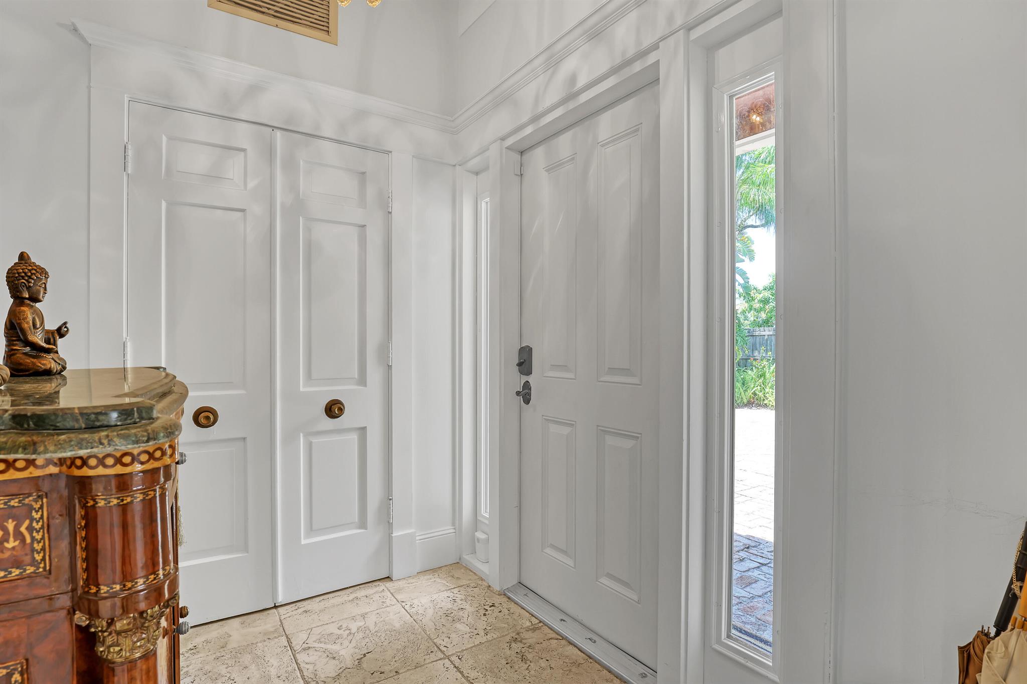 This CBS three bedroom, two bath, mid-century home with a gorgeous back yard and pool area is the epitome of charm. Featuring over two thousand feet of air-conditioned living space and an impressively large lot, just three houses from Flagler drive in SOSO. This premier location is the center of the high-end lifestyle that makes West Palm Beach so desirable. The property is situated just one block from the Intracoastal Waterway and providing easy access to downtown West Palm Beach, Mar-a-Lago, Worth Avenue, and Palm Beach International Airport. The home features an open concept design with a chef's kitchen, Quartz counter tops, custom backsplash, high end stainless appliances and gas range. The neutral stone flooring seamlessly blends warm tones throughout the home.