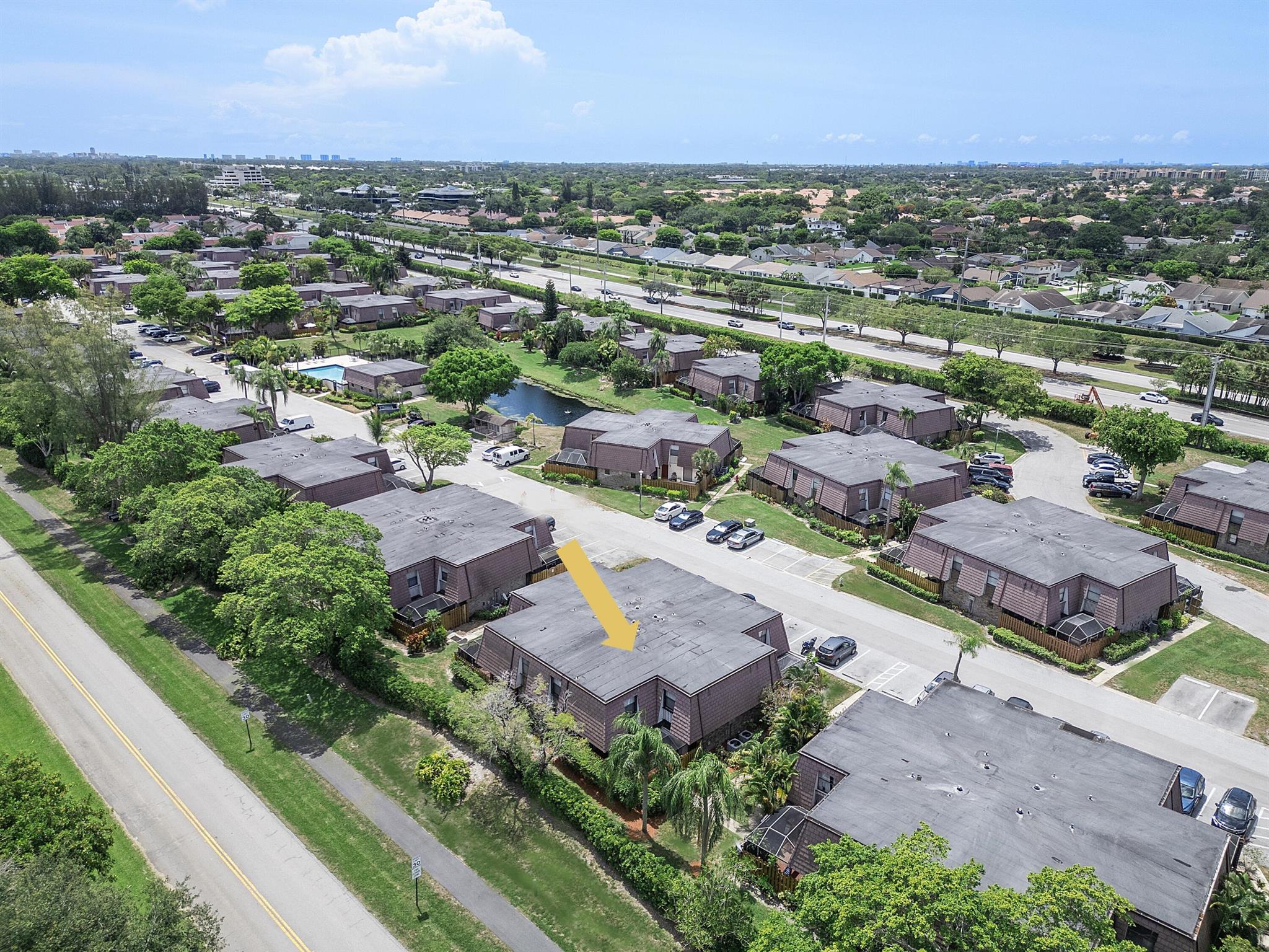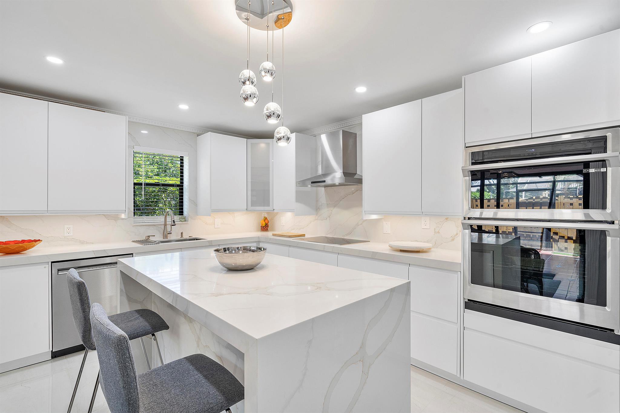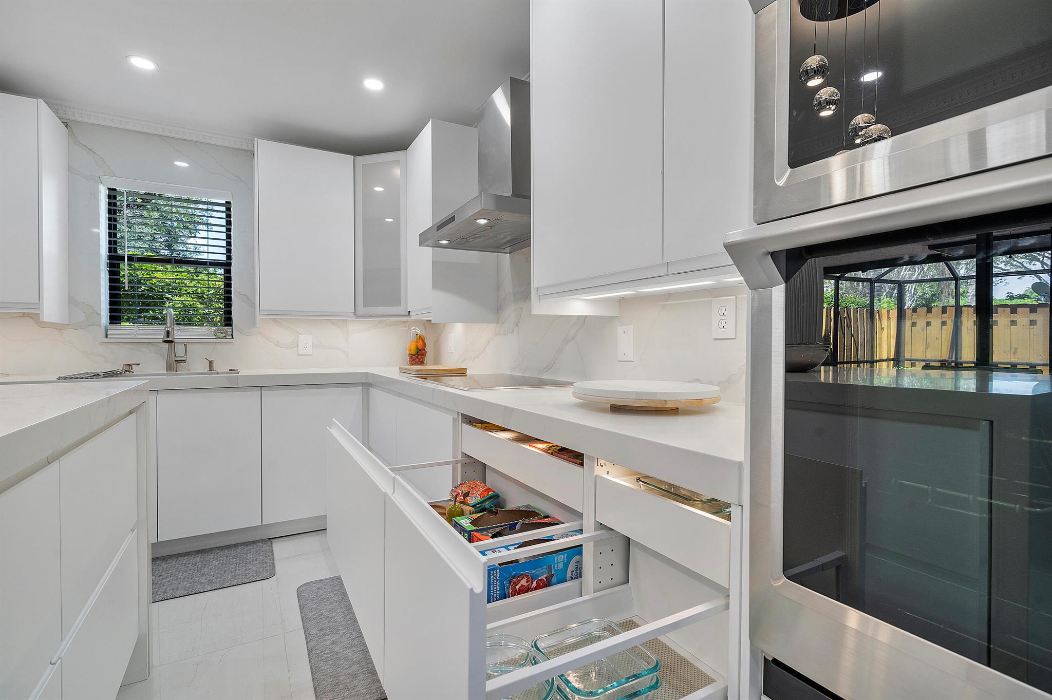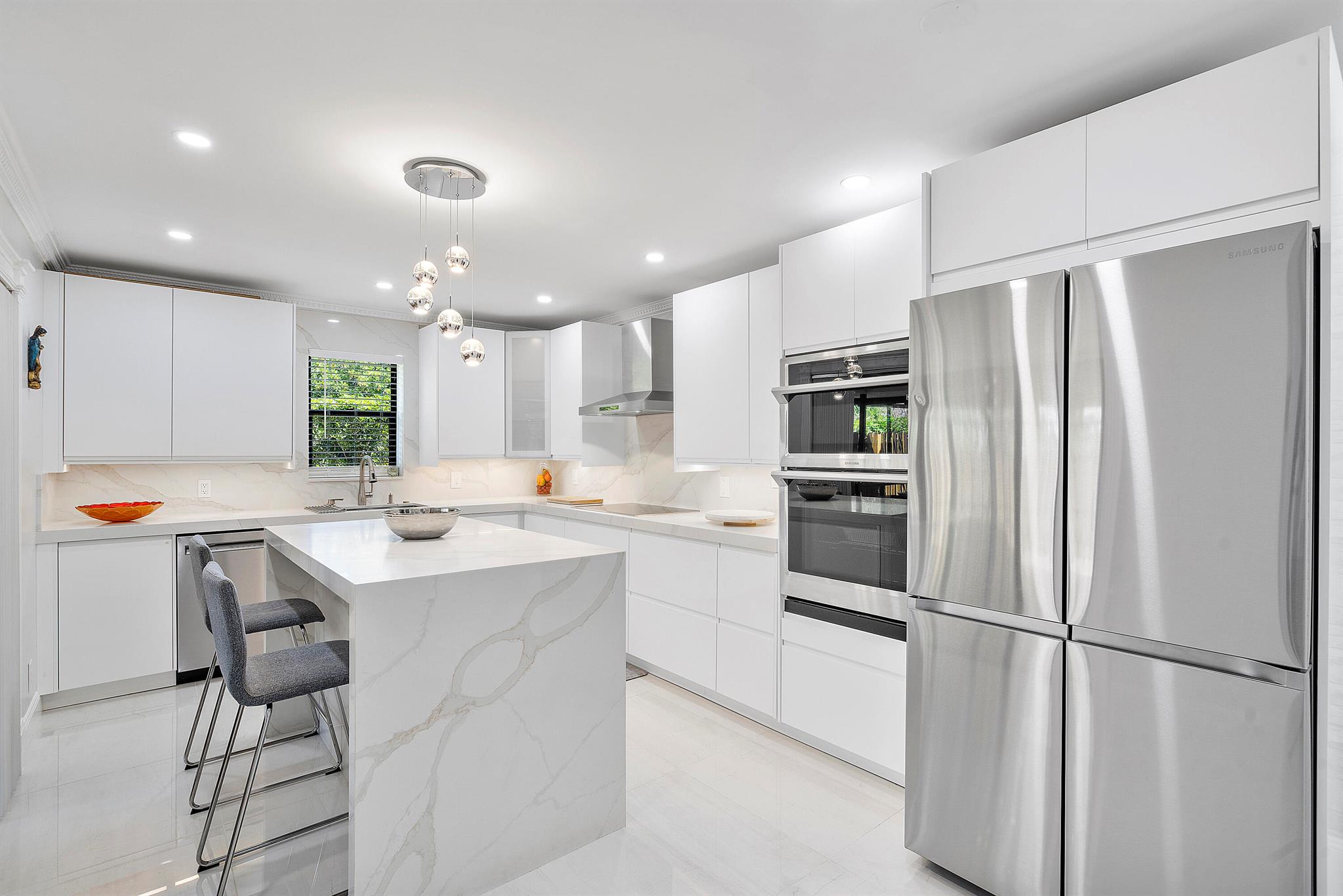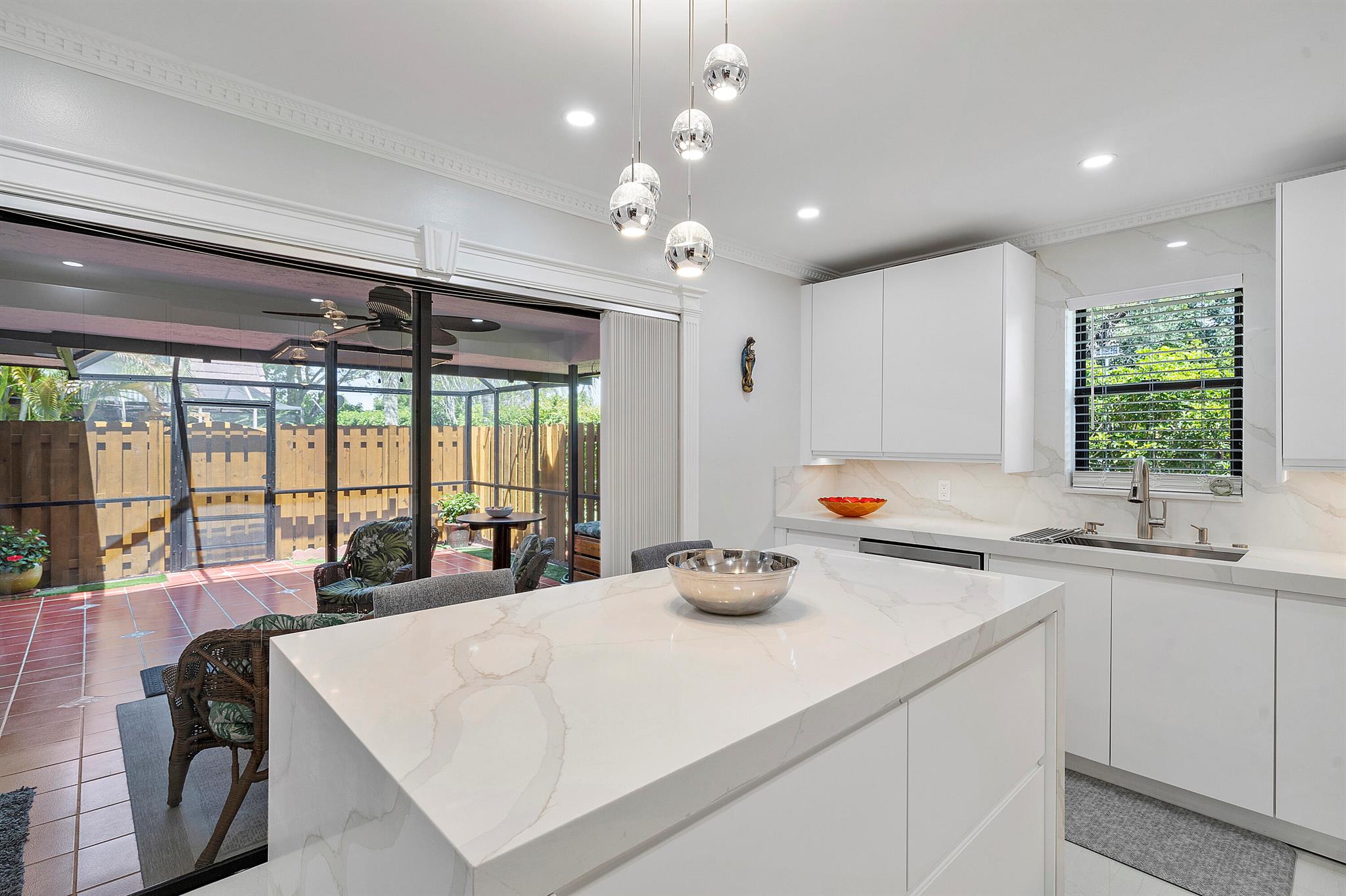 Lovely, move-in ready 3 bedrooms & 2.1 bathrooms Townhouse. New porcelain tile flooring & flat ceiling w/embedded LED lights throughout the 1st flr. Kitchen thoughtfully renovated w/SS appliances *Quartz countertops, backsplash & Island *LED lighting around countertops *Cabinets & drawers w/soft close hardware *Corner floor cabinet w/removable swivel hardware. Living room has decorative fireplace w/heating feature. Bathrooms are upgraded. Half bath & W/D on 1st flr. Bedrooms & full bathrooms on 2nd flr. Accordion shutters on windows. Screened courtyard w/tile floor & new wood fencing perfect for enjoyment & entertainment. Ideal assigned parking space. Property is in a pet-friendly community w/pool, close to A rated schools, shopping, dining, and houses of worship. This is a must see!