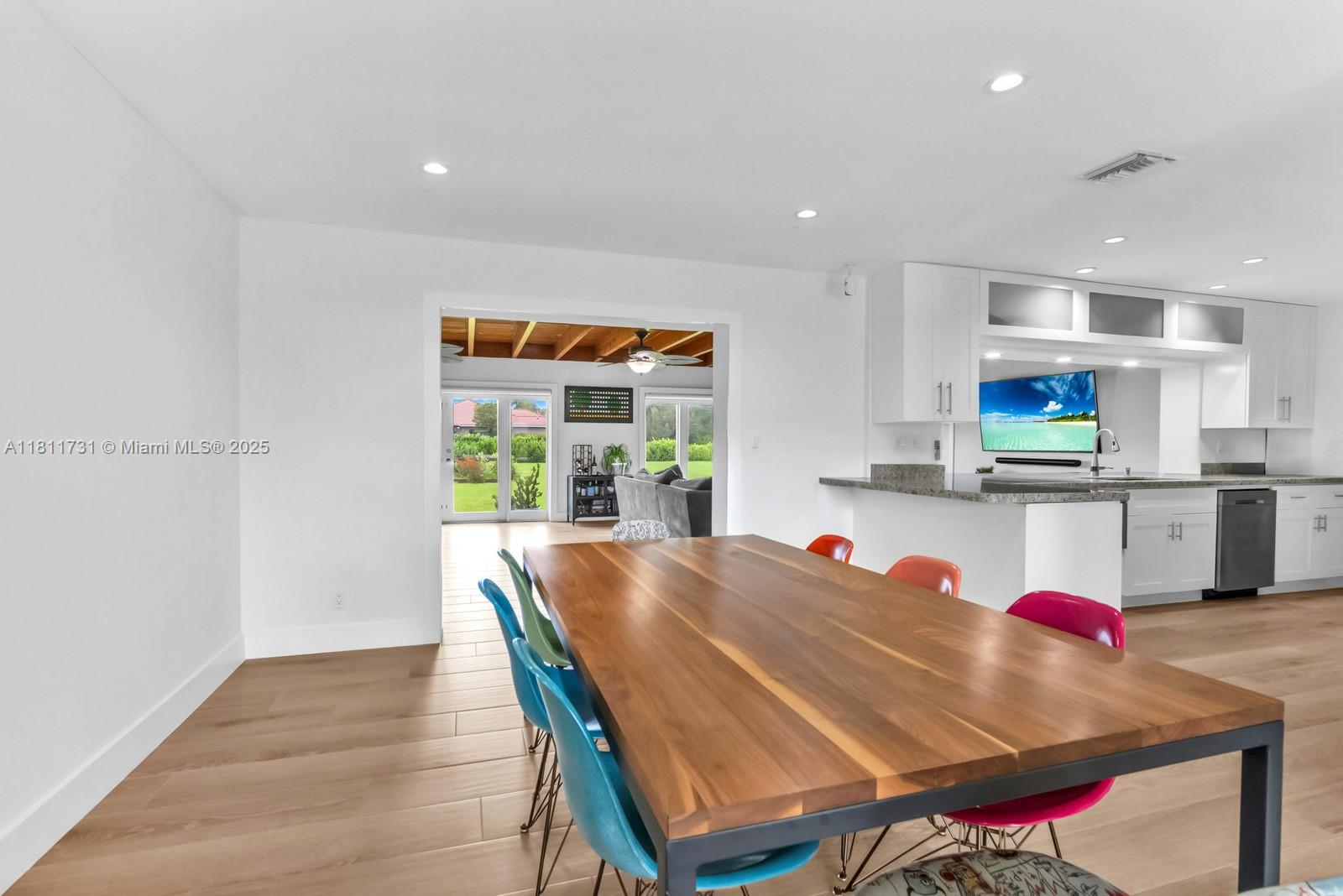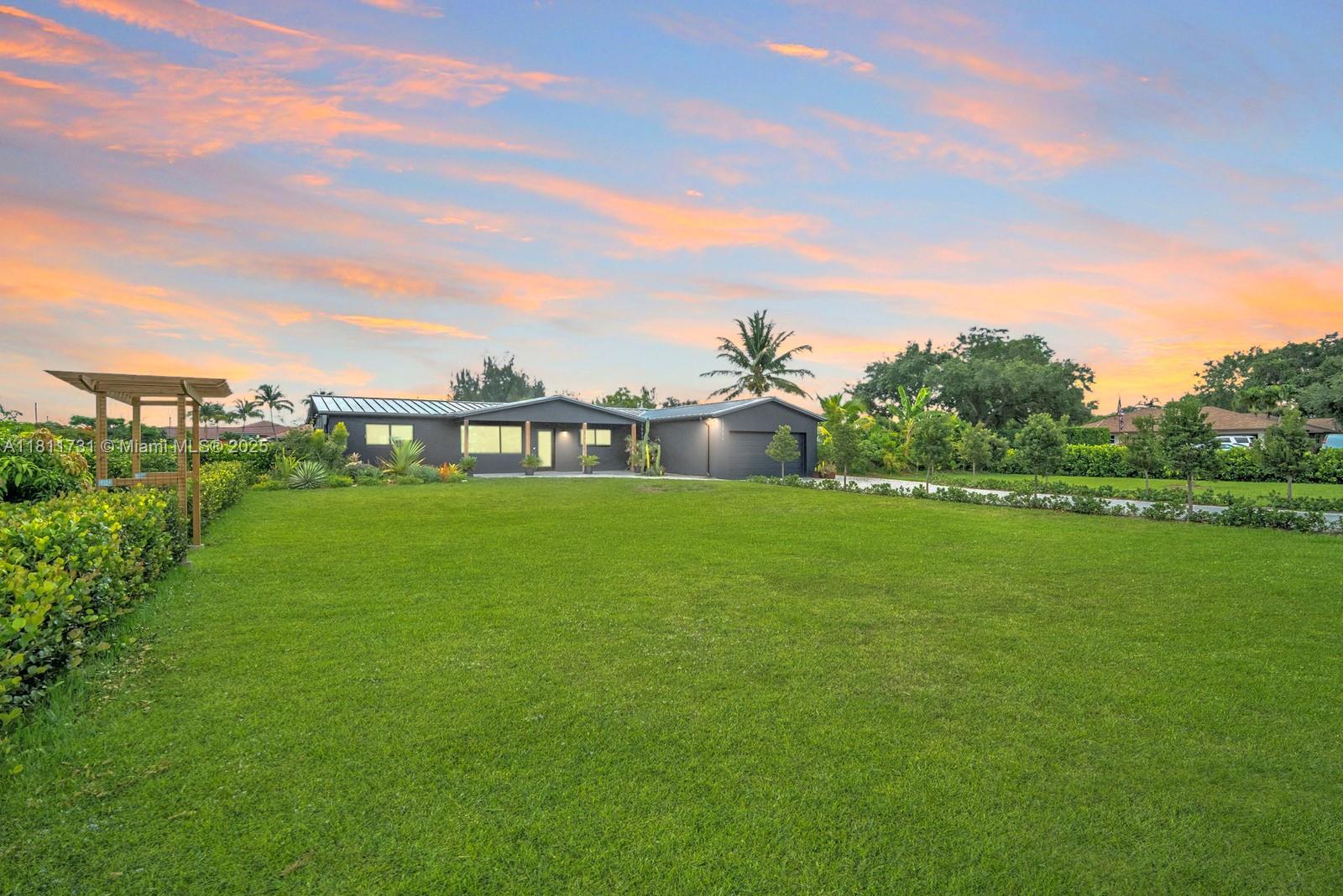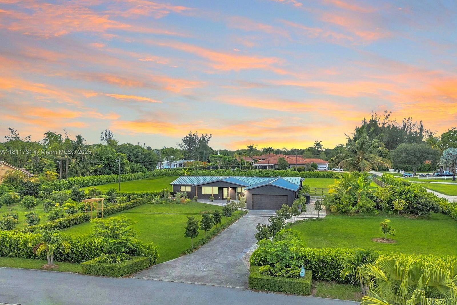 Gorgeous 4 bed 2.5 bath one-of-a-kind home nestled on spectacular 2 acre premium lot on charming street in the heart of equestrian friendly city of Davie. Tastefully updated home features new floors throughout. Kitchen has sleek cabinets w glass accent doors, stainless appliances & range hood. Spacious living room and family room that showcases a wood beam ceiling w 2 sets of french doors to an expansive fully fenced backyard. Triple split floor plan is desirable & versatile. Large primary bedroom w en-suite & view of the grounds. Freshly painted inside & stylish paint outside. Welcoming curb appeal, landscaping is so pretty, including private grove w a variety of fruit trees. Additional highlights: large laundry room, impact doors & windows, metal roof, new ac and water heater.