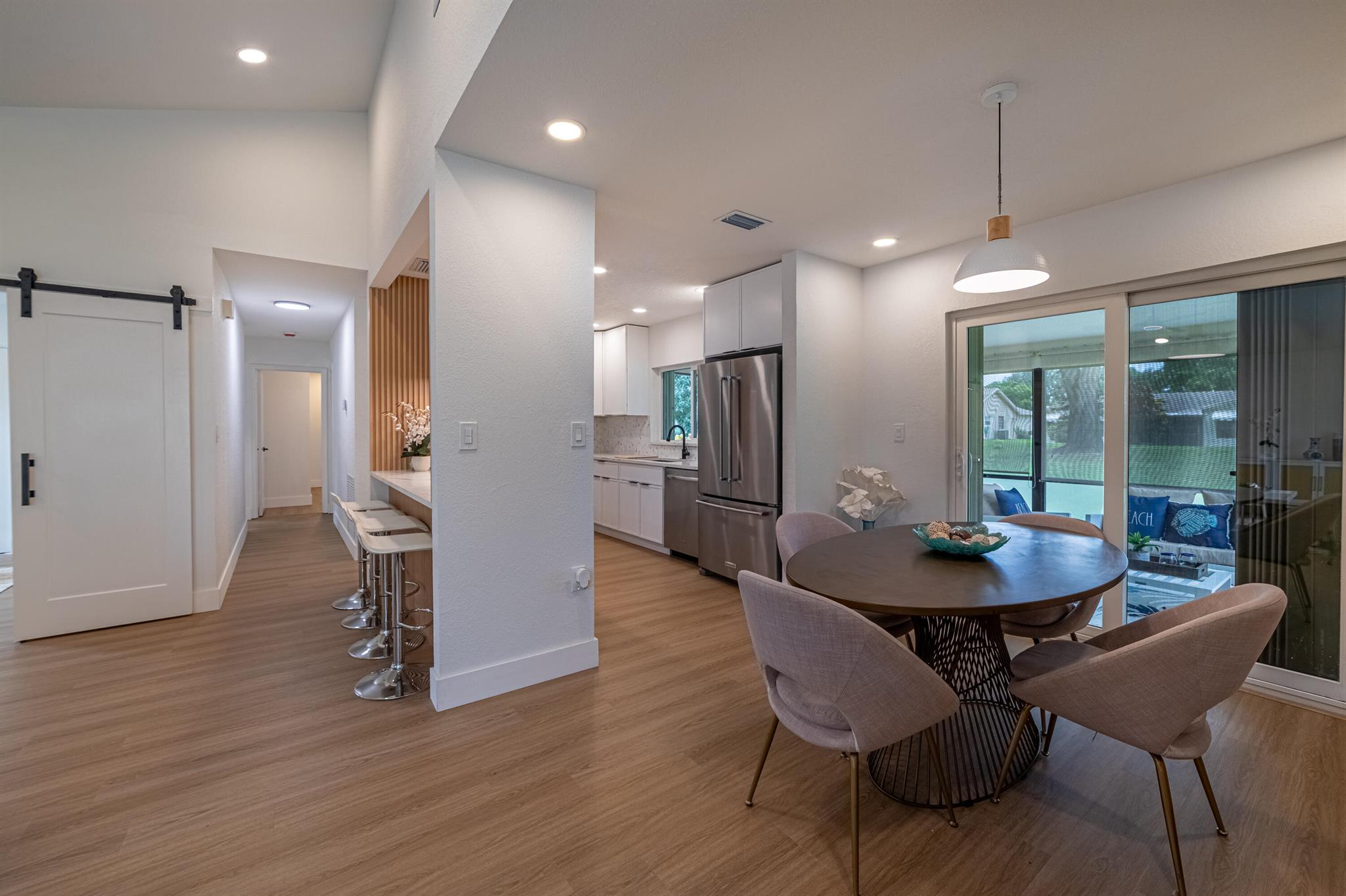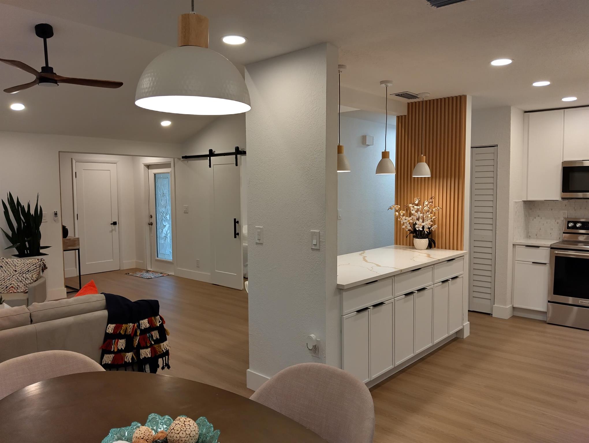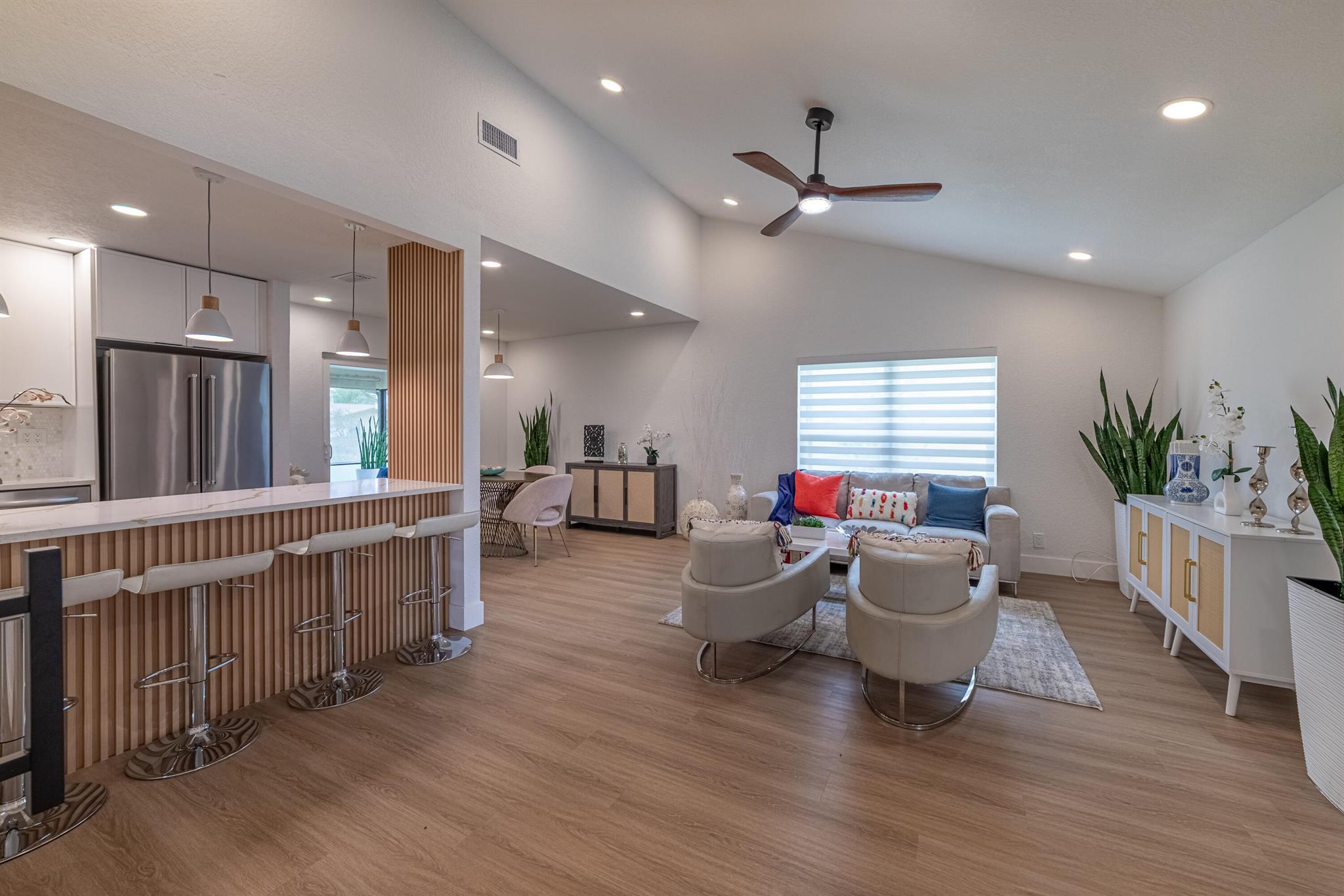 *+55 *. All is top of the line in this designer house! first the location, +8000 SFT lot on a very quiet cul de sac with well maintained houses around. Second the roof was installed in 2021, the windows were installed in 2012 with permit, including the sliders leading to a beautiful large patio. A new Trane AC system. The main living area has an open concept kitchen with Kitchen Aid appliances! A snack bar and a gorgeous white quartz counter top. Waterproof vinyl flooring looking like real wood. Recessed ceiling lights in all rooms, 3 good size bedrooms, 2 new bathrooms, one of the bedroom opens on the living area through a large barn door There is a covered patio with a peaceful nature view. A large one car garage with a washer and a dryer dedicated area completes this perfect home
