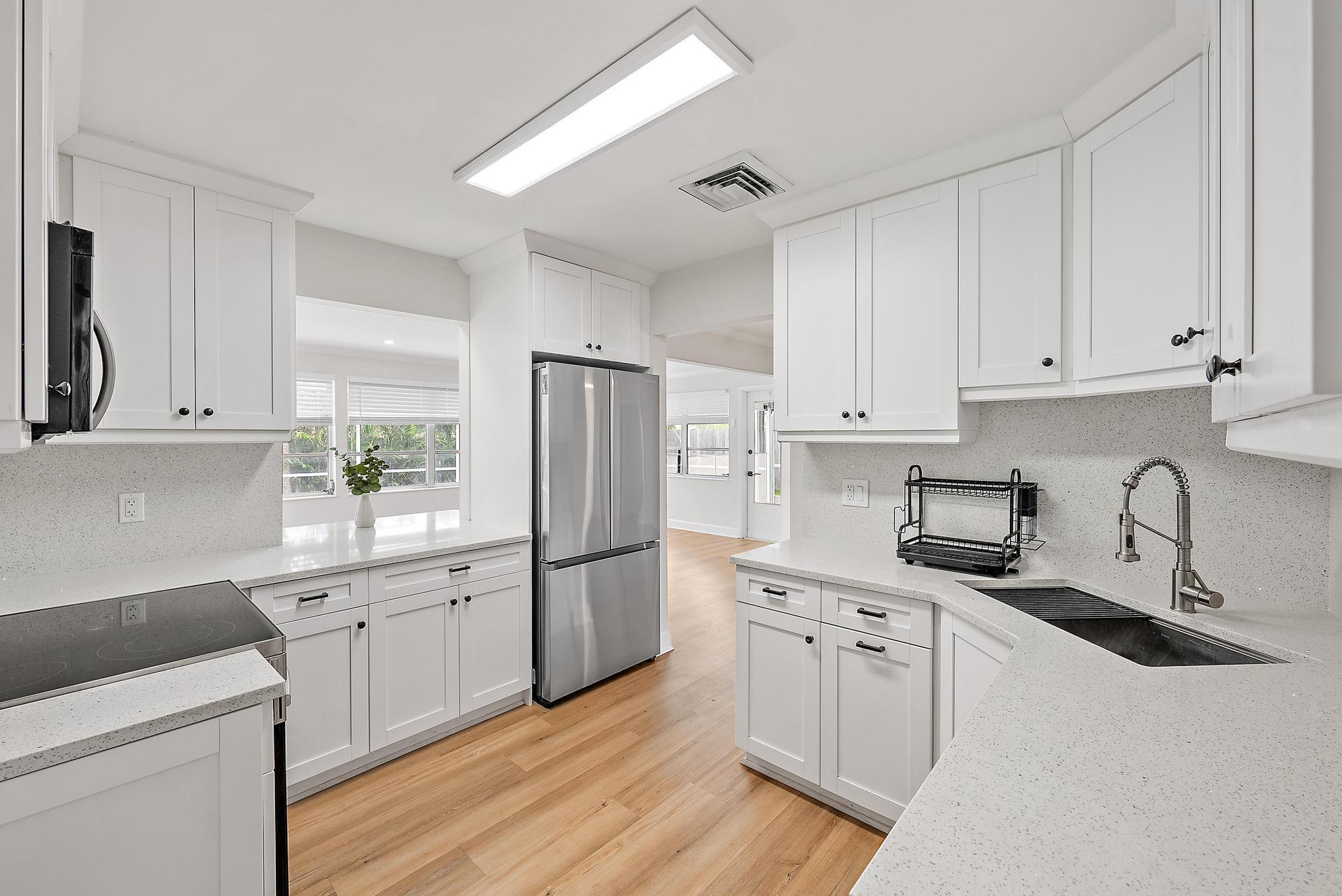 Welcome to your new home in the Palm BeachesThis sunlit renovated bungalow is ready to welcome you with no detail overlooked and totally move in ready. Brand new roof! Located near popular amenities and desirable schools, this 4 BR 2 BA features a 2 way split floorplan and amazing upgrades such as stainless appliances, white shaker cabinetry, pantry, quartz countertops and beautiful flooring throughout, spacious garage with plenty of storage. Enjoy the outdoors with a screened patio and salt water pool all within sight from the house. Brand new ac, ductwork and insulation. New recessed lighting and turf in the yard, motion lights , and security system! Located near fabulous beaches, you'll enjoy room for all of your toys with no restrictions. Schedule your tour today