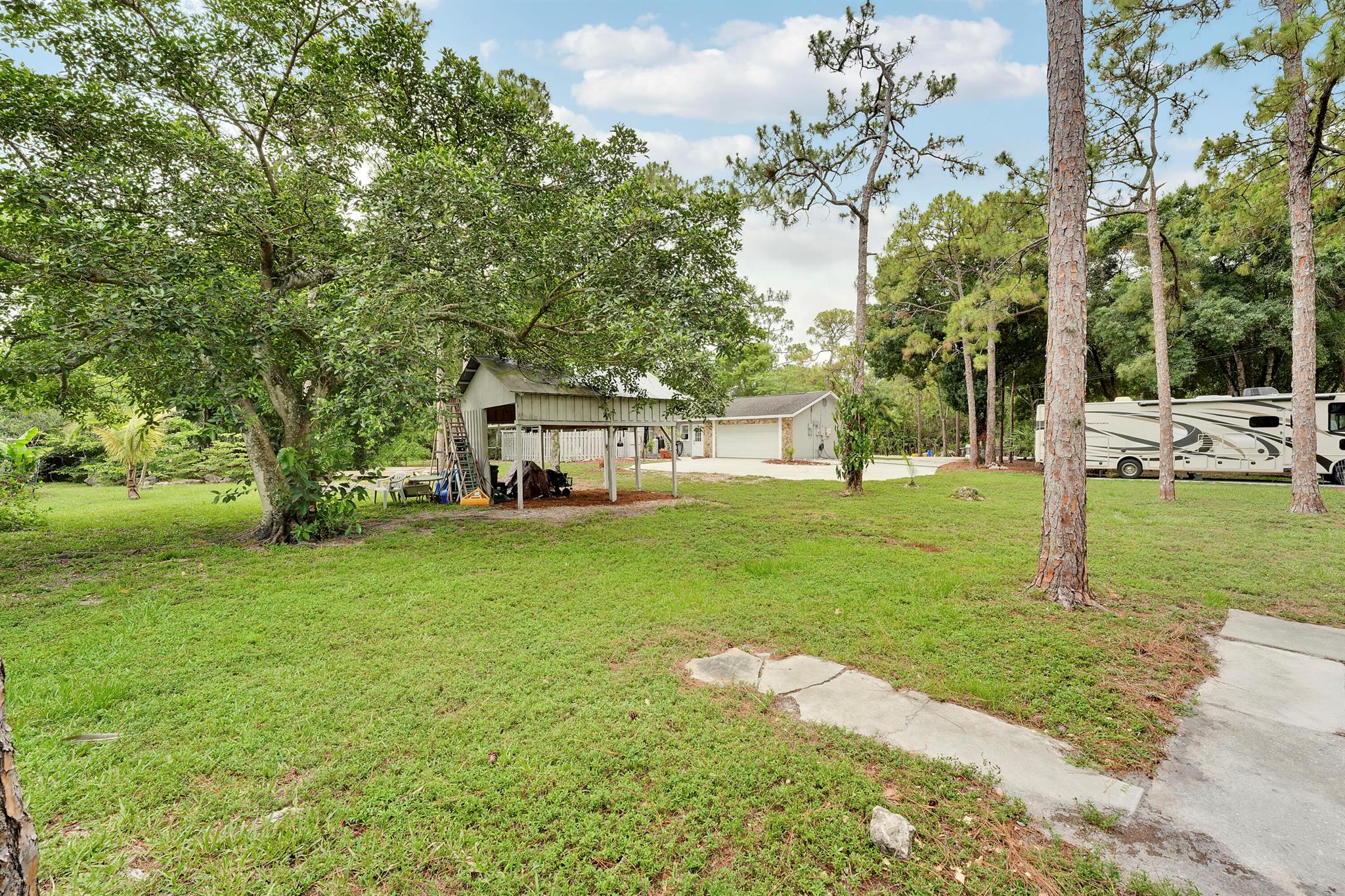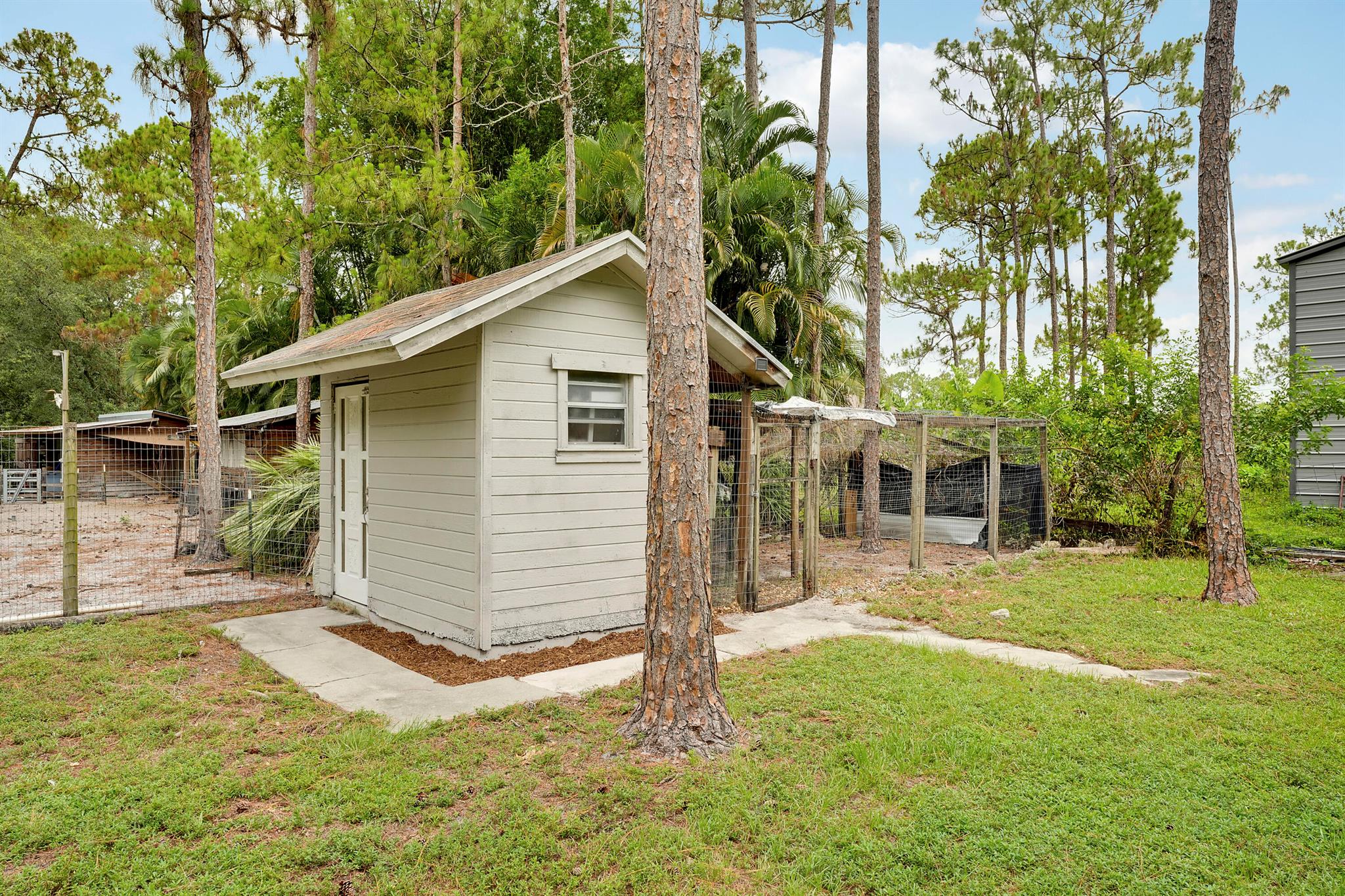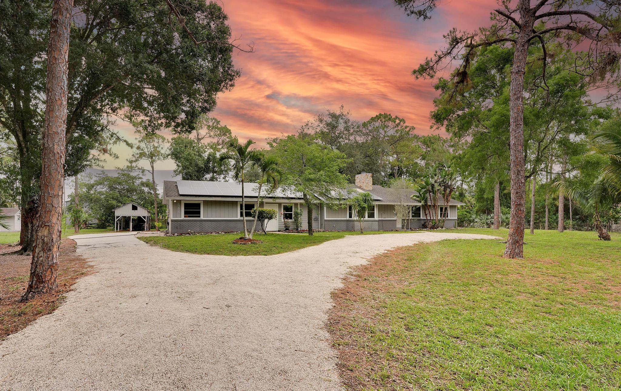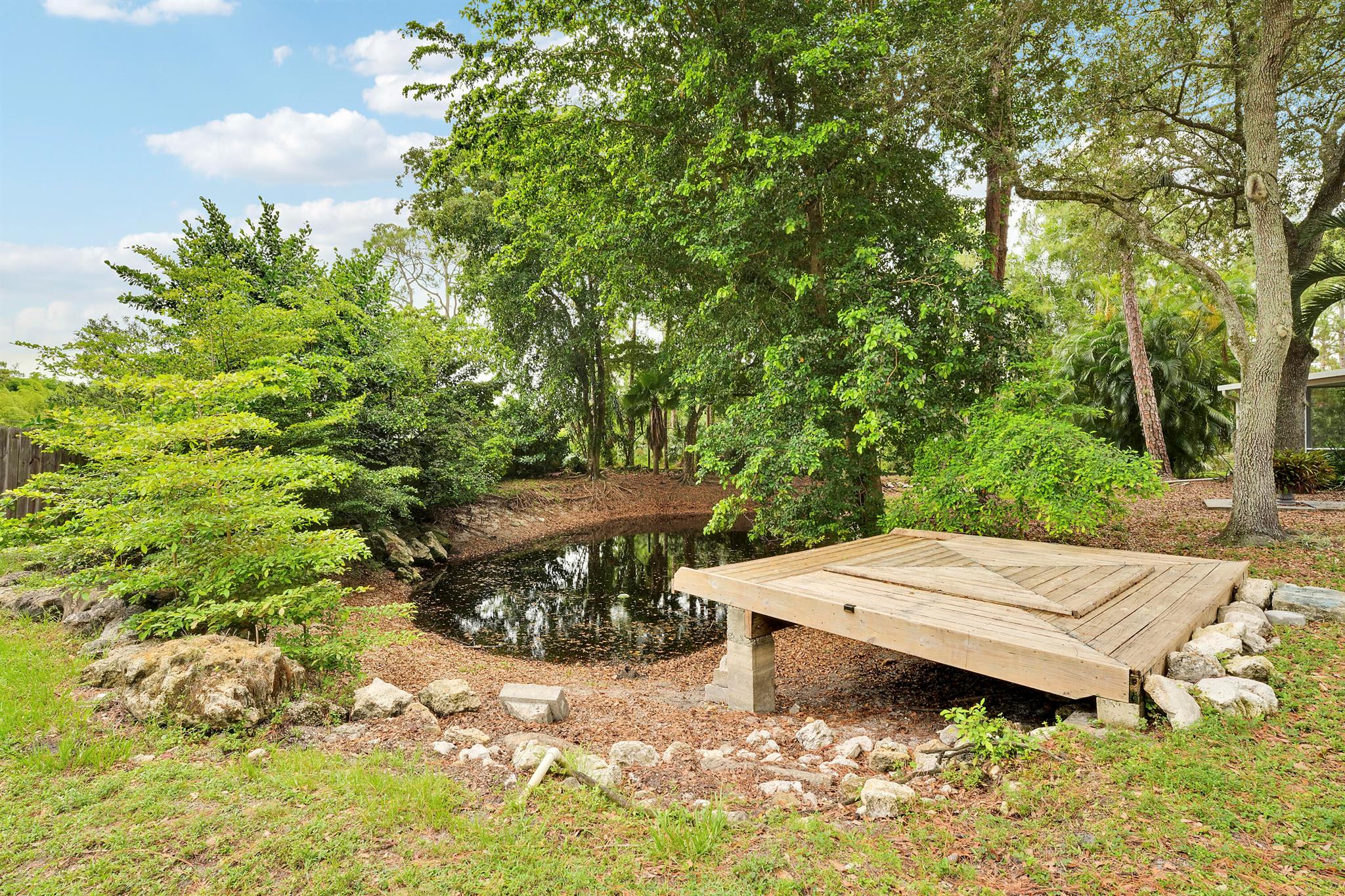 The sellers loves this home, property, and community so much and will be sad to leave it, only moving away to be closer to to their parents/grandparents. You will love the peacocks, ducks and chickens roaming around the neighborhood. You'll love relaxing on the deck next to the pond and hanging out with the turtles and fish. You want tranquility? Here it is. Plus brand new vinyl plank flooring, newer AC, paid for solar panels, as well as newly painted walls and cabinets to give an extra feeling of space and light. Add in the safety of the impact windows and skylights and you'll feel safe and secure inside and out. Huge office, extra large garage, barn, and shed. A gem of a property, the best value in the Acreage, and priced to sell ''UNDER THE APPRAISED VALUE. Make this loved home yours.