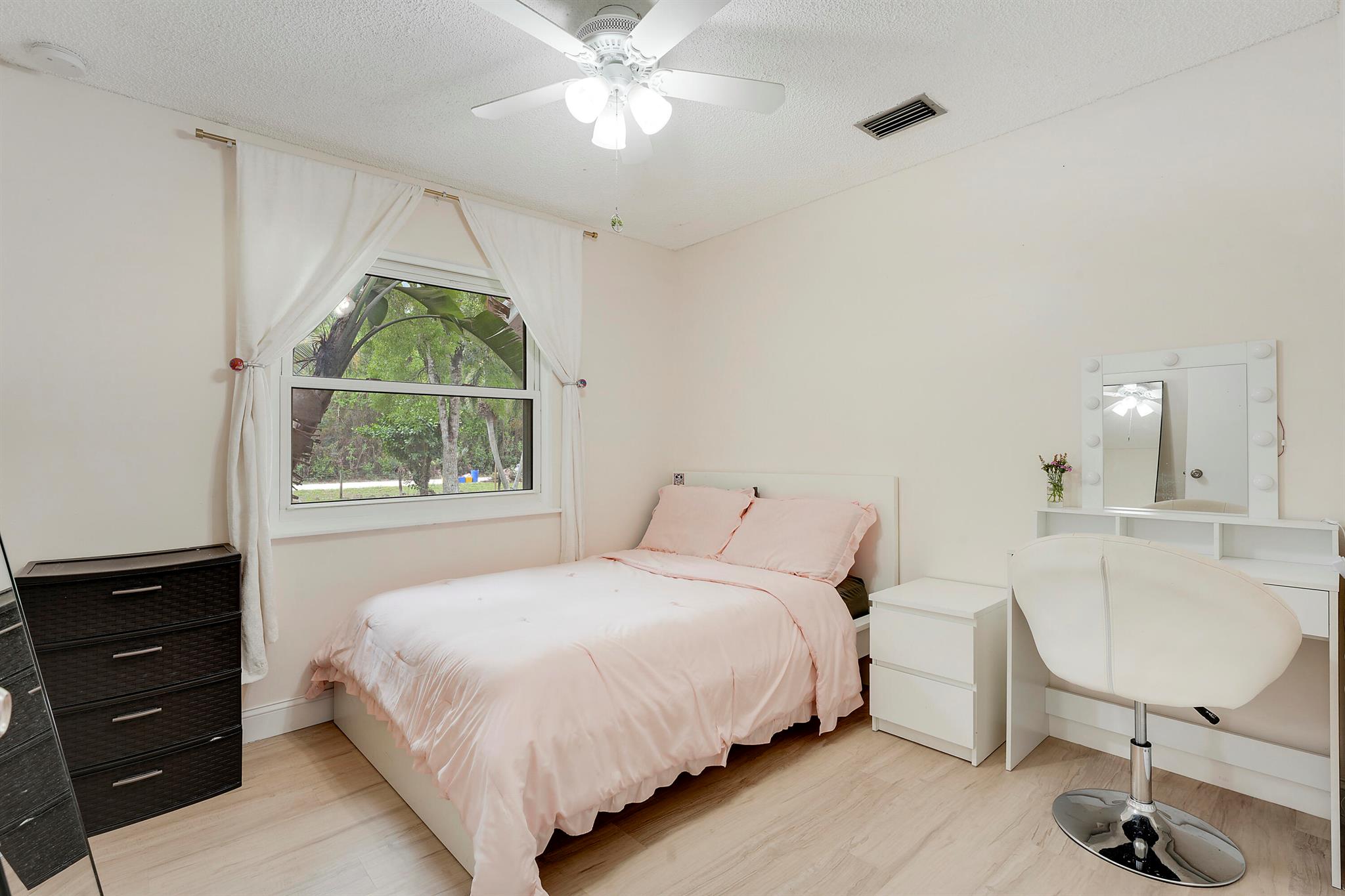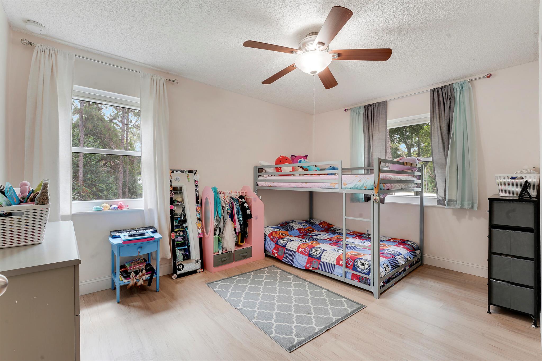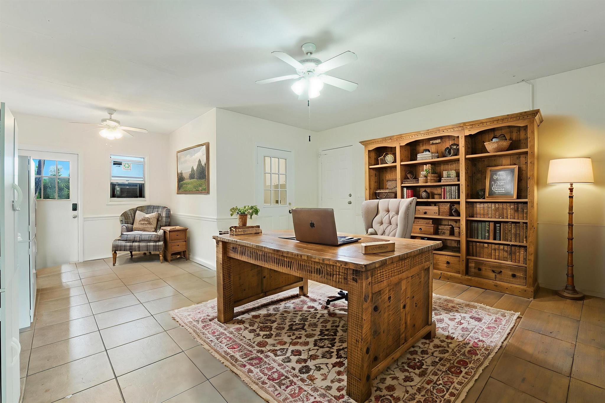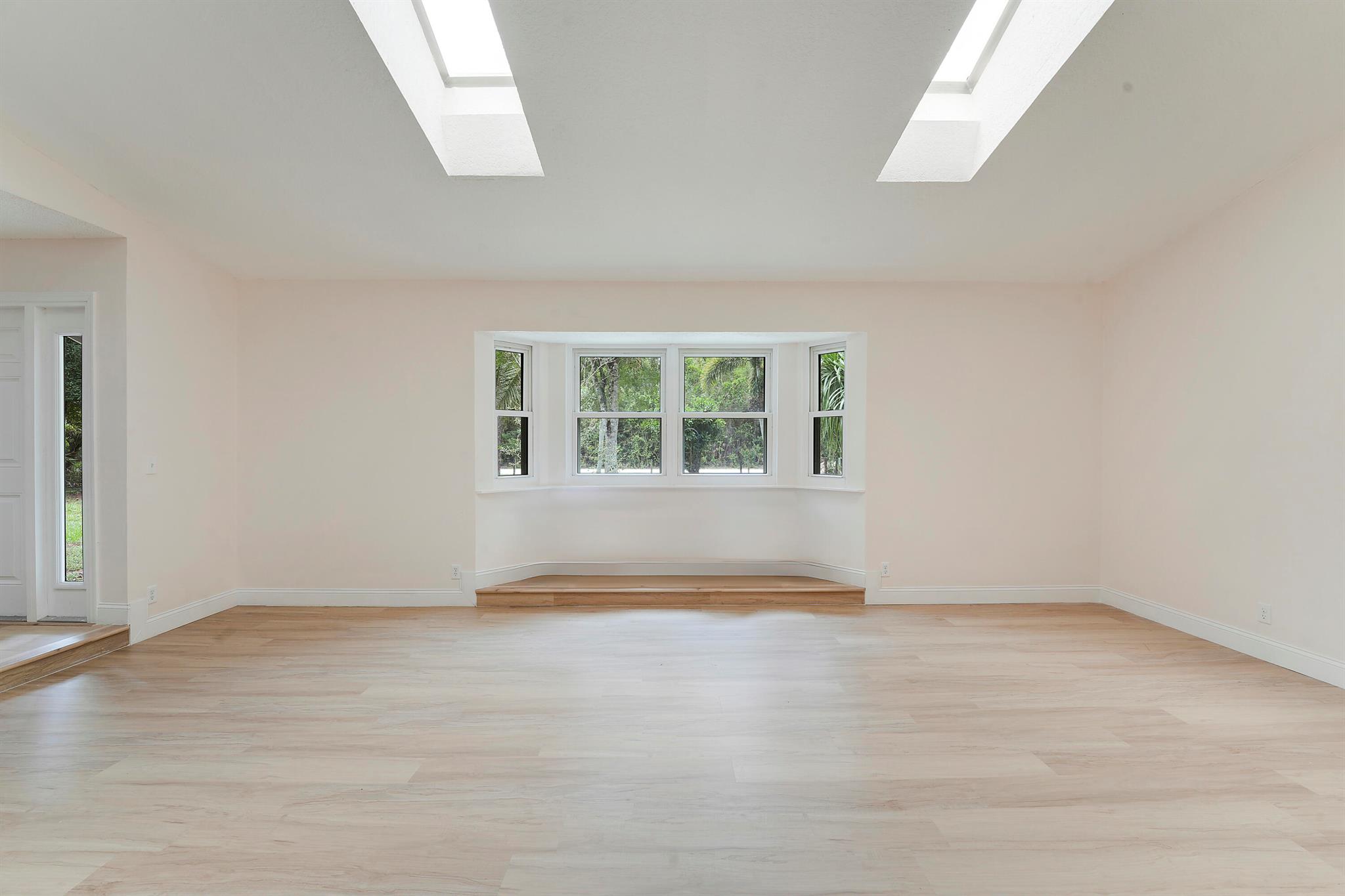 The sellers loves this home, property, and community so much and will be sad to leave it, only moving away to be closer to to their parents/grandparents. You will love the peacocks, ducks and chickens roaming around the neighborhood. You'll love relaxing on the deck next to the pond and hanging out with the turtles and fish. You want tranquility? Here it is. Plus brand new vinyl plank flooring, newer AC, paid for solar panels, as well as newly painted walls and cabinets to give an extra feeling of space and light. Add in the safety of the impact windows and skylights and you'll feel safe and secure inside and out. Huge office, extra large garage, barn, and shed. A gem of a property, the best value in the Acreage, and priced to sell ''UNDER THE APPRAISED VALUE. Make this loved home yours.