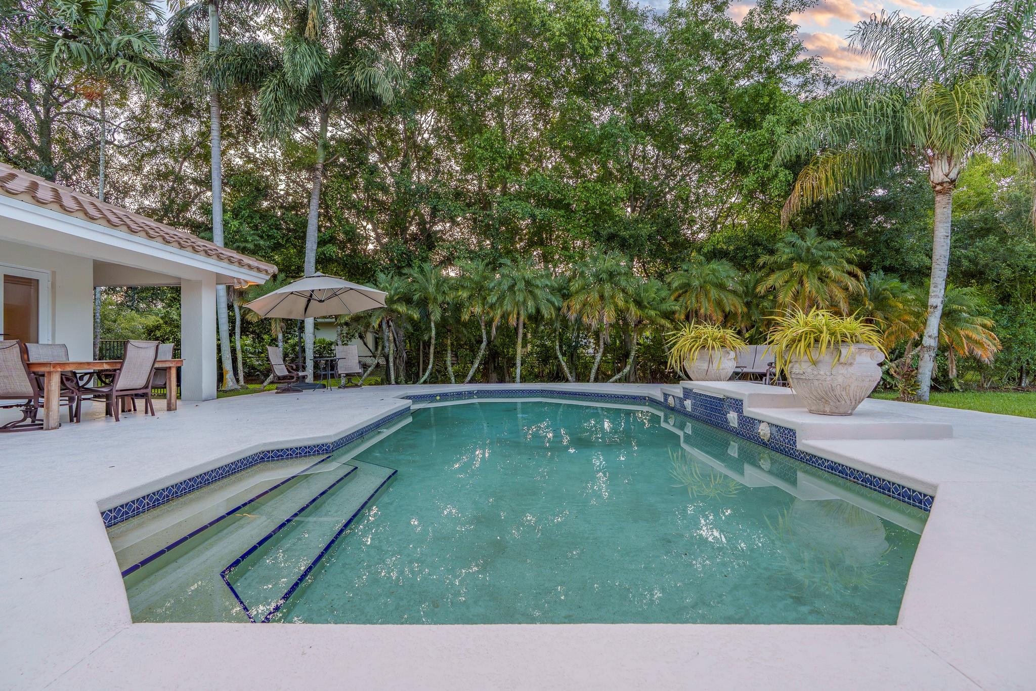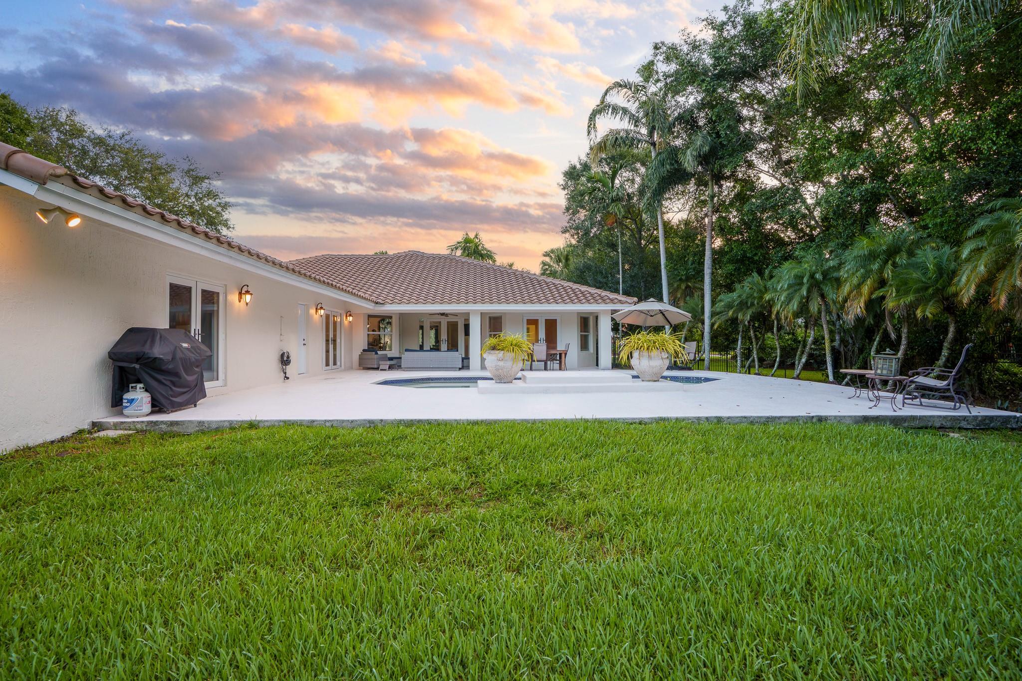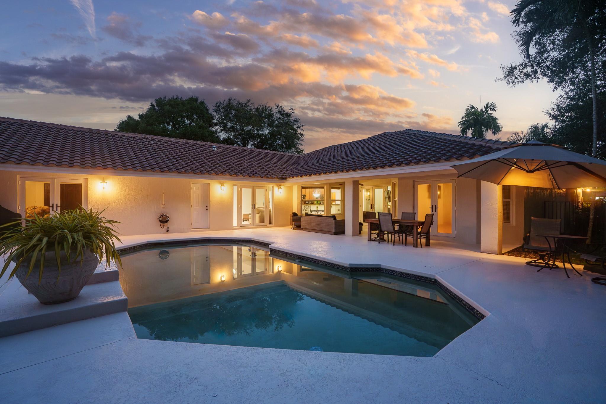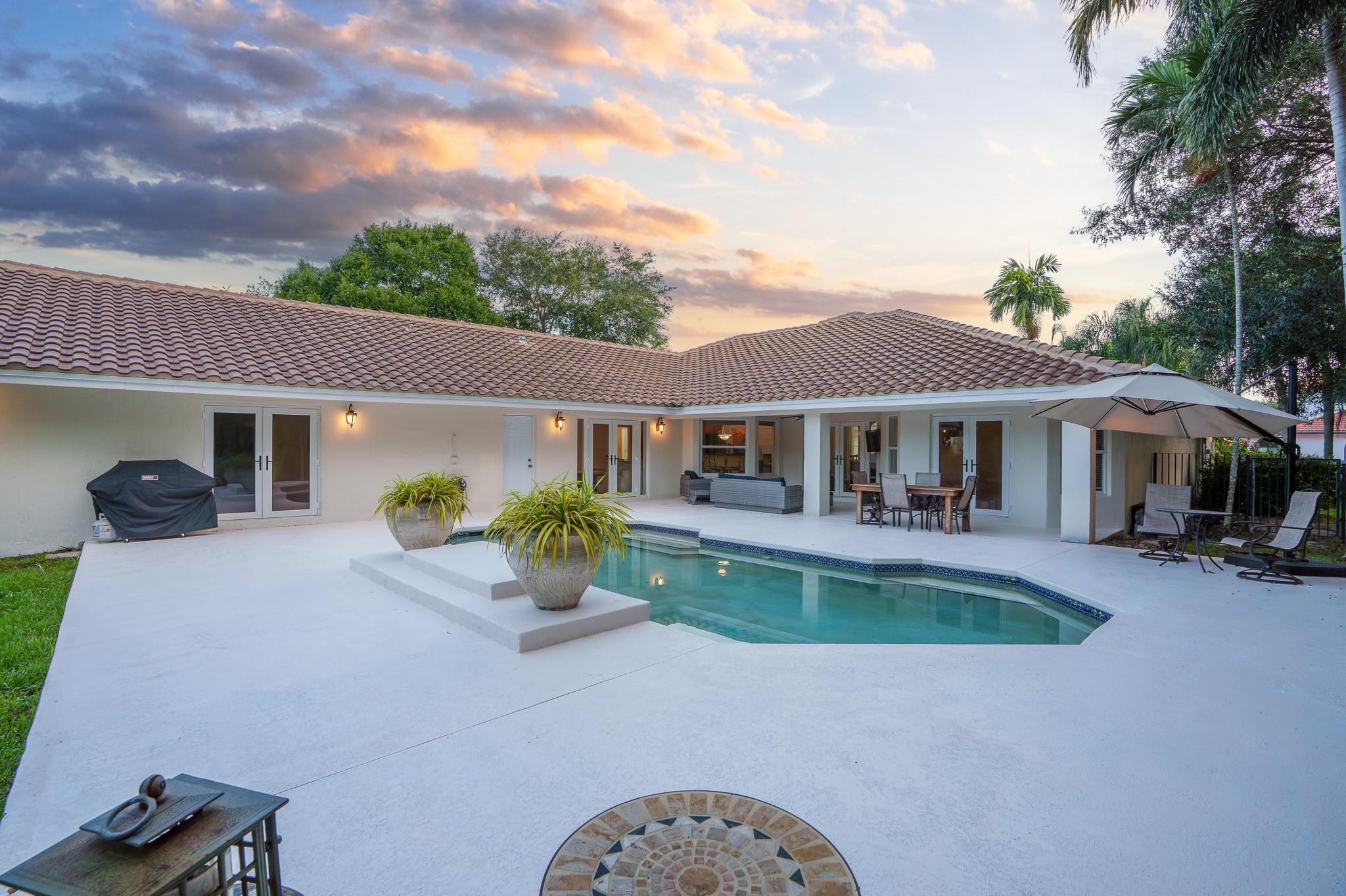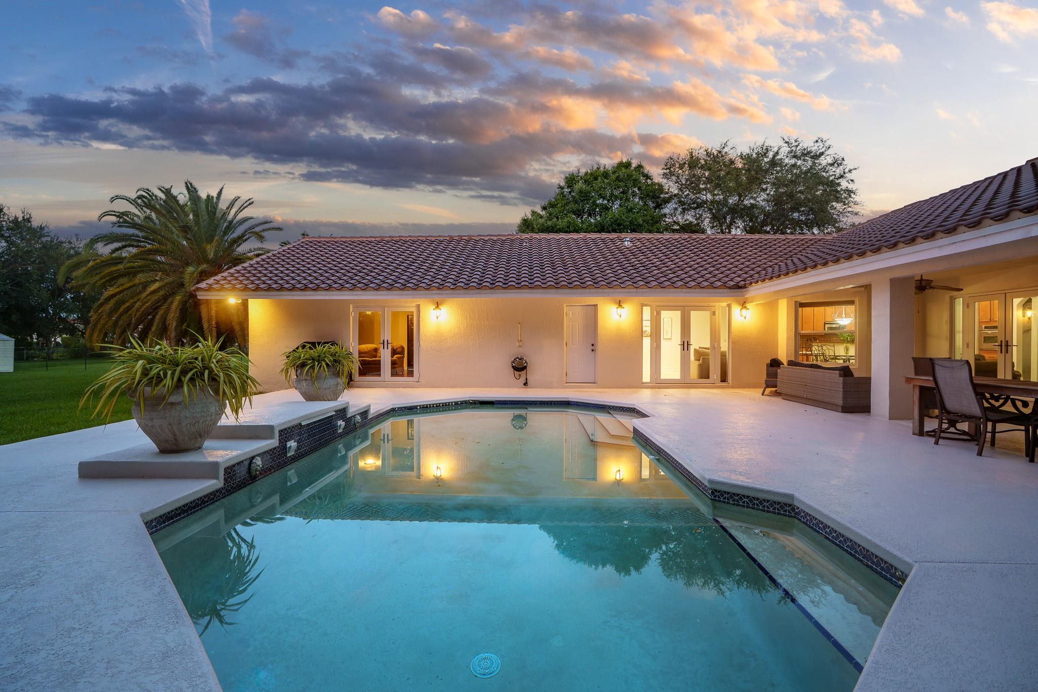 Nestled in a charming and quaint community of just 39 homes, this one-story home is just perfection. The roof was replaced in 2023, and in 2024, hurricane impact windows and doors were elegantly installed, ensuring both safety and style. Freshly painted inside and out, the residence boasts an impressive layout featuring six bedrooms, three bathrooms, and a three-car garage . Enjoy versatile living with a den that can easily serve as a theater, game room, or gym. Step outside to your own serene oasis, complete with a sparkling pool and a sprawling yard that leads directly to the water. The interior showcases tile flooring in the social areas for easy maintenance, while the bedrooms feature rich wood floors. The kitchen is equipped with stainless steel appliances, ideal for the home chef.