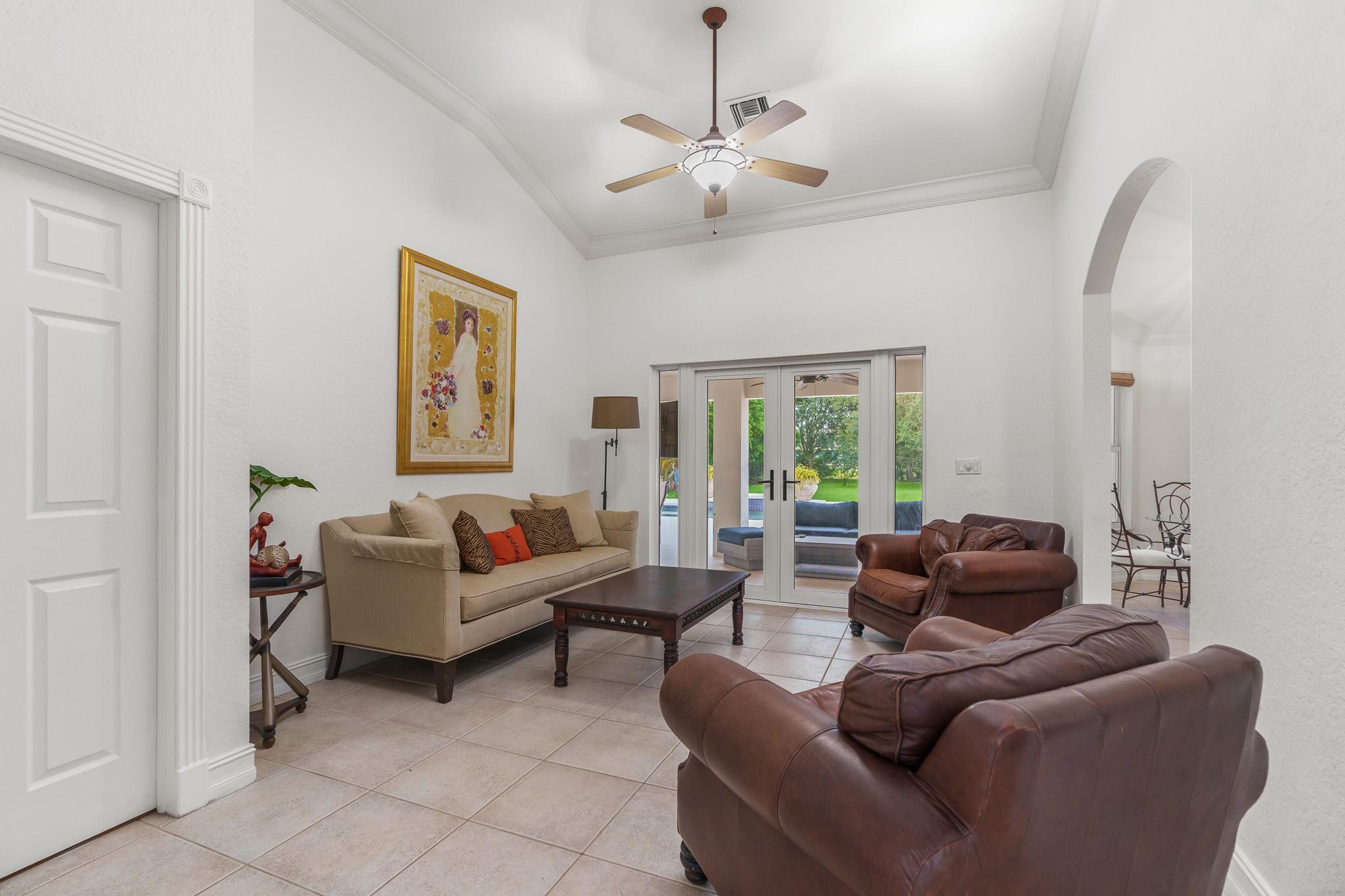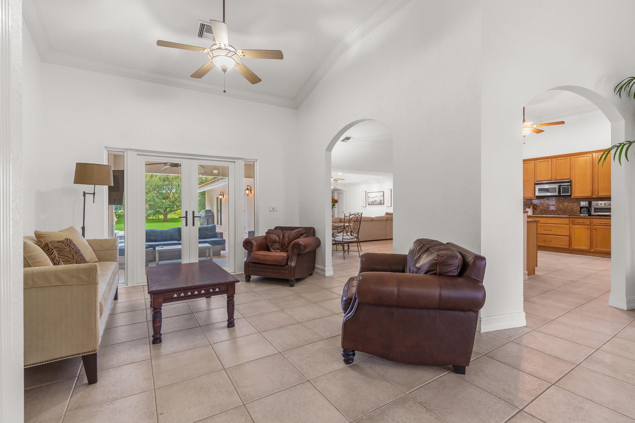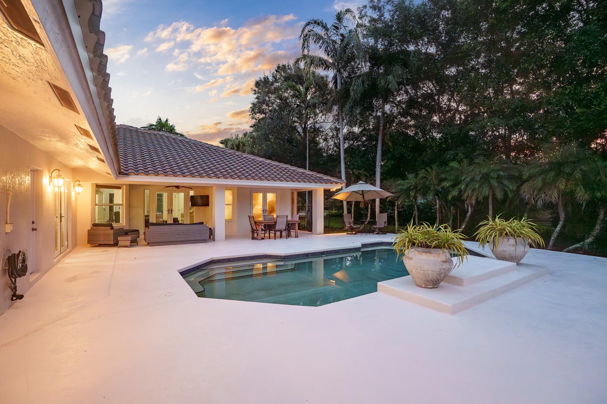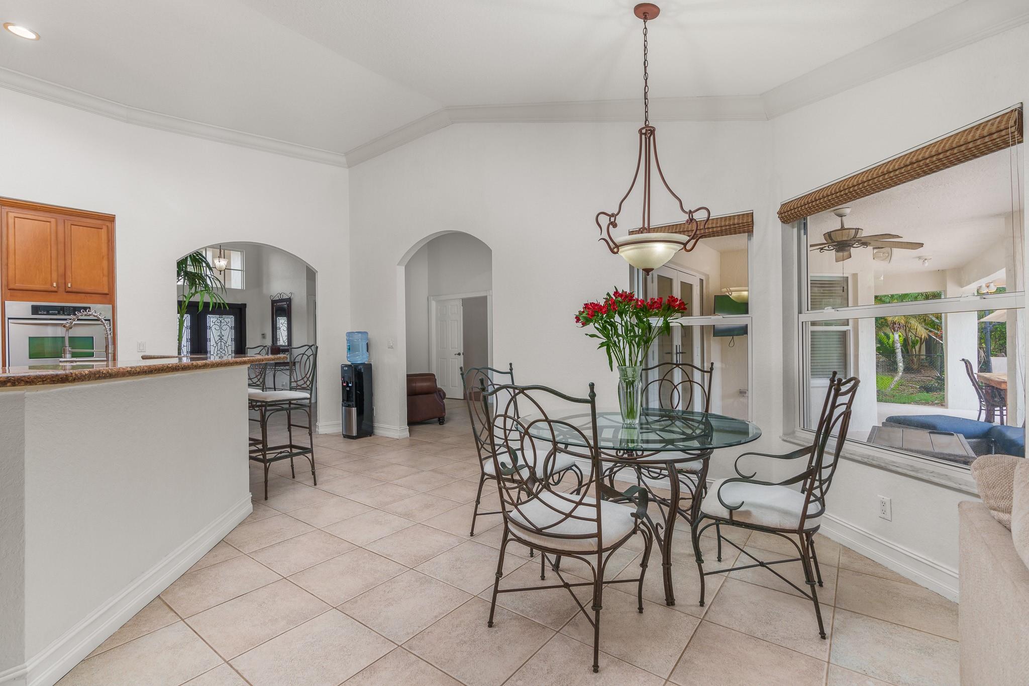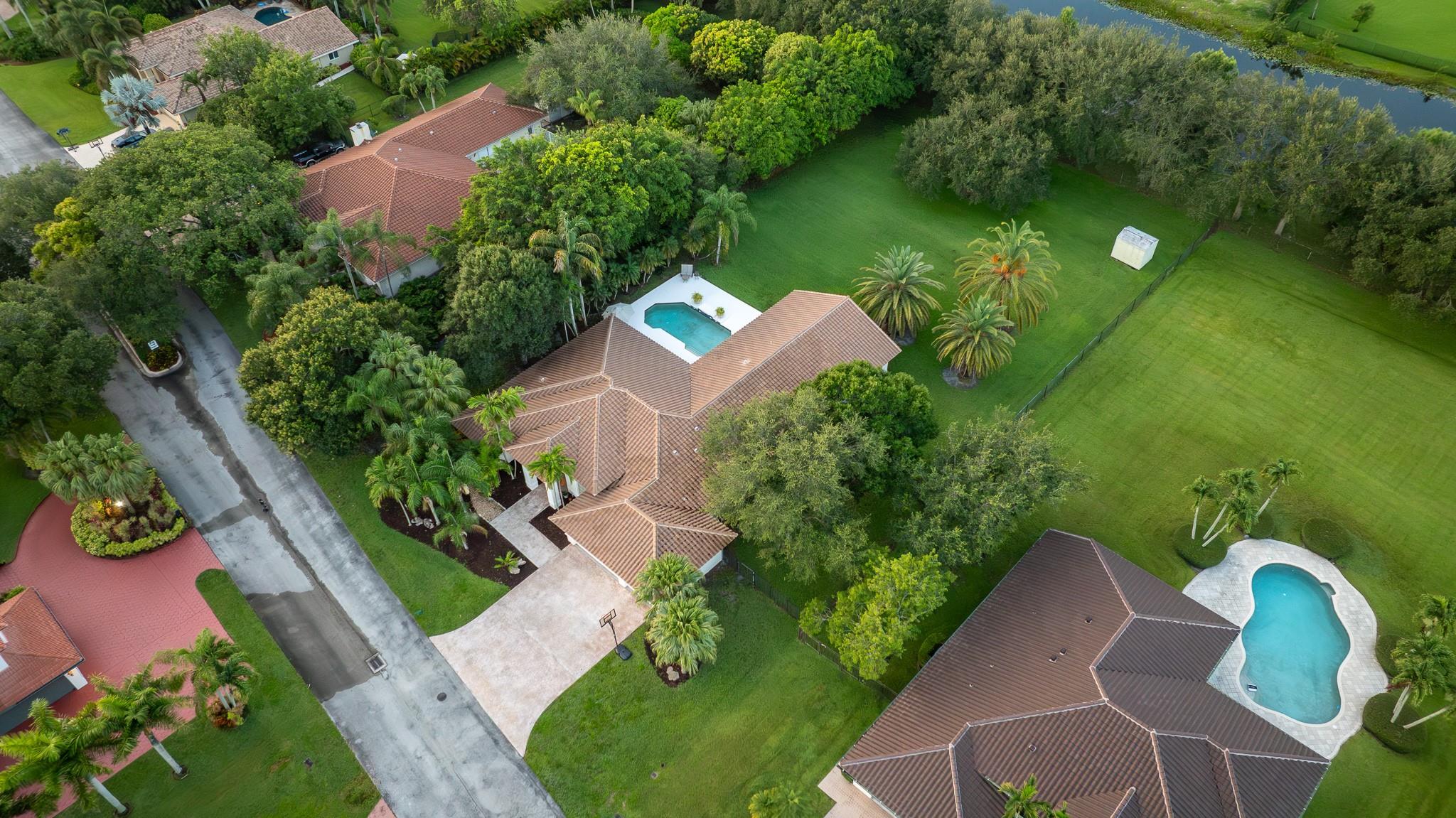 Nestled in a charming and quaint community of just 39 homes, this one-story home is just perfection. The roof was replaced in 2023, and in 2024, hurricane impact windows and doors were elegantly installed, ensuring both safety and style. Freshly painted inside and out, the residence boasts an impressive layout featuring six bedrooms, three bathrooms, and a three-car garage . Enjoy versatile living with a den that can easily serve as a theater, game room, or gym. Step outside to your own serene oasis, complete with a sparkling pool and a sprawling yard that leads directly to the water. The interior showcases tile flooring in the social areas for easy maintenance, while the bedrooms feature rich wood floors. The kitchen is equipped with stainless steel appliances, ideal for the home chef.