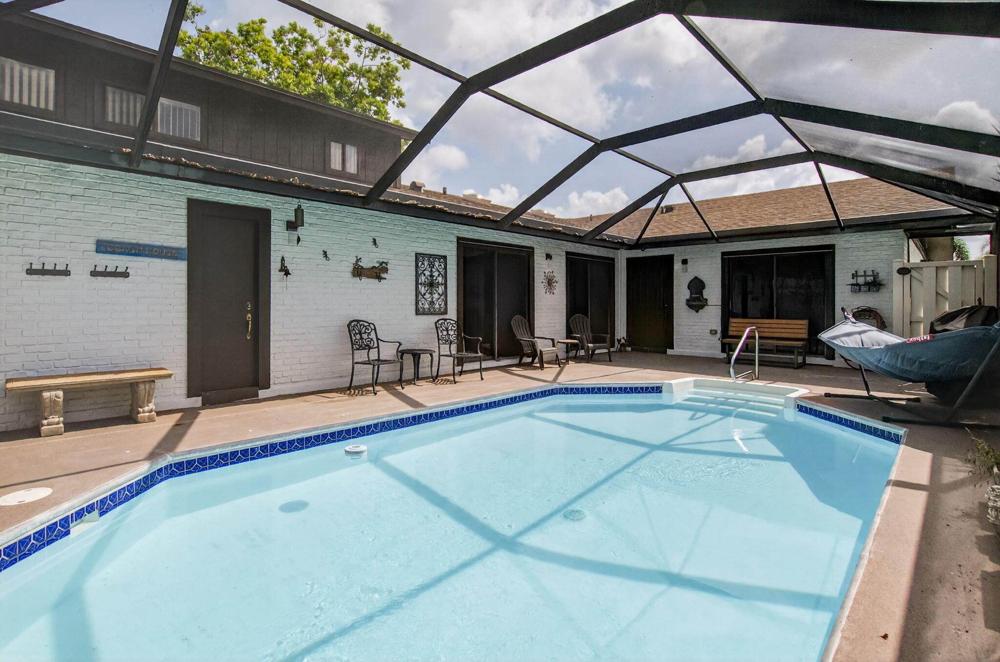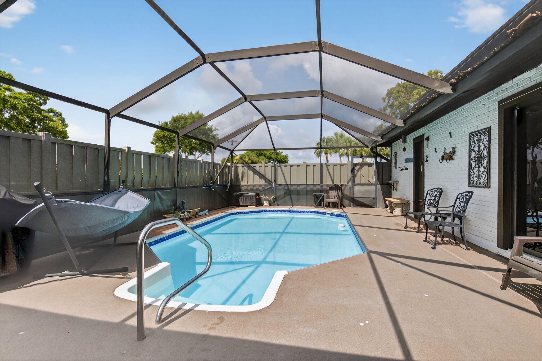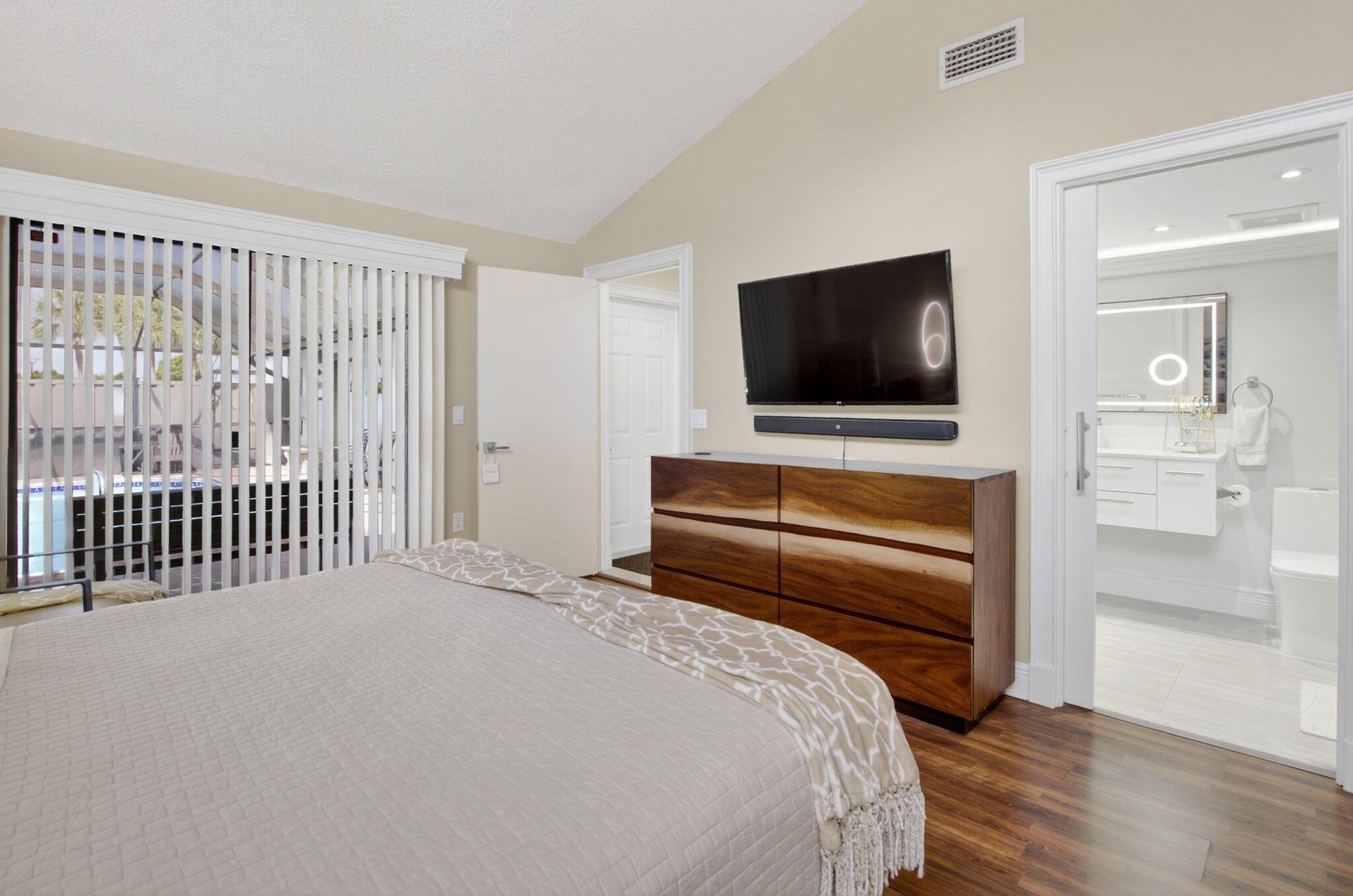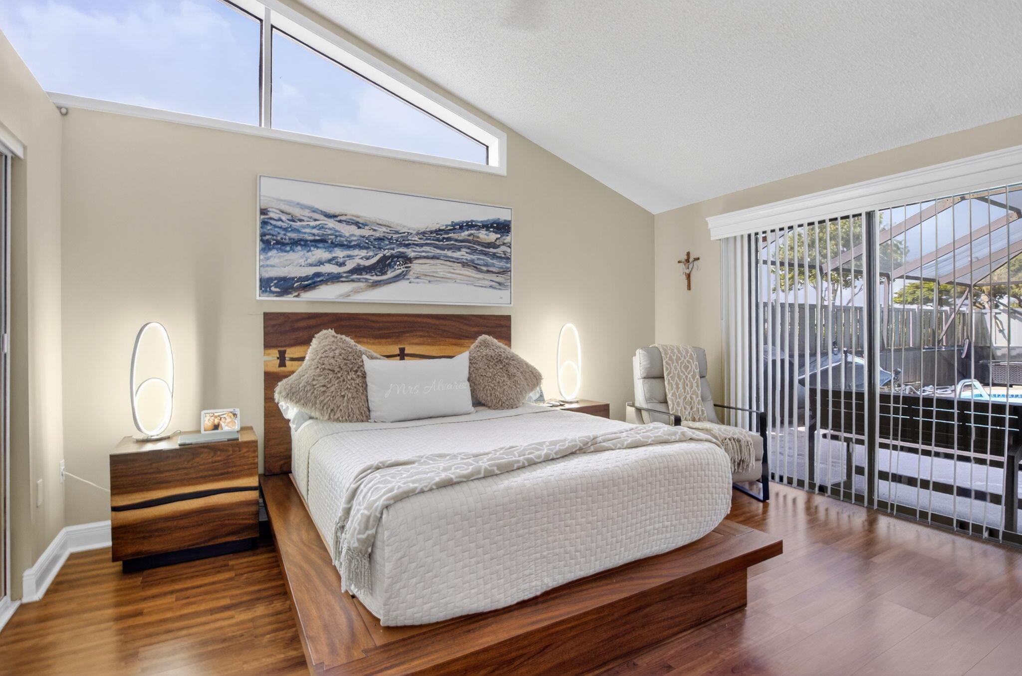 Gorgeous Townhouse with private pool in Boca Gardens - Move in Ready! Welcome to this beautiful 2 story home with 3 master bedroom suites with their own private bathrooms plus a guest bath. Beautifully upgraded with an abundance of natural light and an open floor plan, this home offers the perfect blend of privacy, luxury and convenience. Full 3 beds, 3.5 baths, 1 full car garage, 2 additional parking spaces + guests, over 1,325 square feet of living space plus your own private screened-in yard with a pool! Perfect for endless summer vibes, family gatherings and entertaining. Property is fully updated, newer roof, newer A/C, stainless steel appliances, gorgeous bathrooms, vaulted ceilings, skylights and an upstairs private suite. Perfectly located in Boca Gardens.
