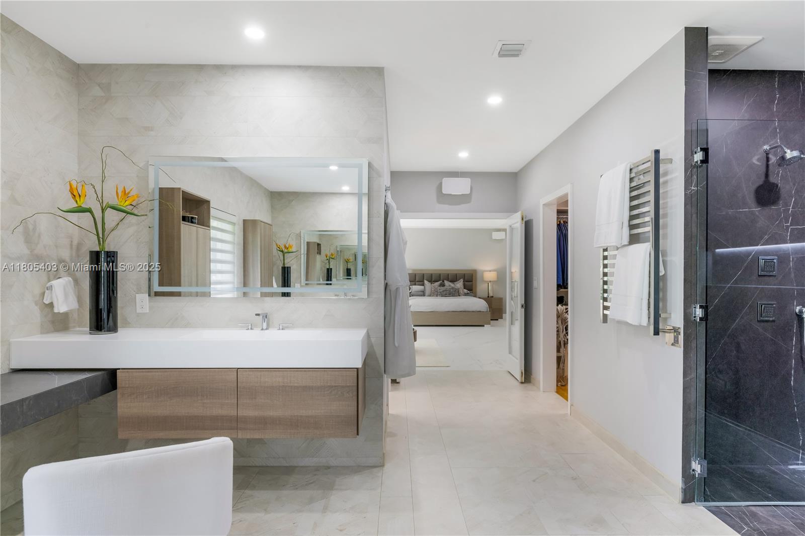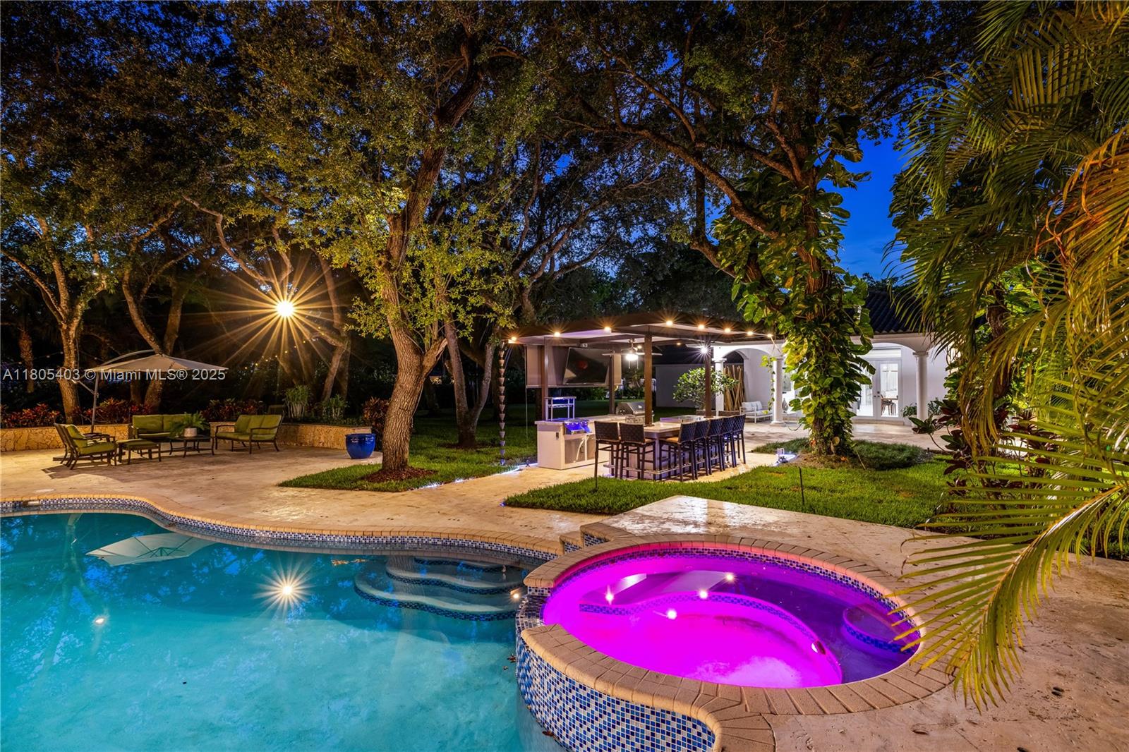 Set behind gates on a peaceful cul-de-sac in North Pinecrest, this refined single-story estate presents a rare opportunity to own a private compound steps from the newly completed Gary Matzner Park, & moments from Gulliver Prep School & Temple Beth Am. On 1.1 acres of mature, manicured grounds, the property offers privacy, scale, & timeless appeal. The residence encompasses 6,318 square feet of living space with 6 bedrooms & 5-and-a-half baths, designed with an emphasis on flow, light, & understated luxury. Firenze Carrara marble floors extend throughout & new wood floors in bedrooms/closets are complemented by new impact glass that frames tranquil garden views & fills the interiors with natural light. The kitchen is architectural & functional, with Veneta Cucine Italian cabinetry, a sculptural leather-textured marble island, & Miele professional-grade appliances—ideal for intimate dining or sophisticated entertaining. The primary suite is conceived as a serene retreat, offering dual walk-in wardrobes & a spa-level bath finished in full-height, single-slab Italian stone. The Kohler DTV+ digital wellness system delivers steam, chromotherapy, integrated audio, & lighting. A 2 story guesthouse with new wood floors & a large bedroom on the ground floor & office on the 2nd floor provides exceptional comfort for extended family or long-term guests. A second driveway will fit a boat or large vehicle with ease. Outdoor living with a pool, new summer kitchen, & expansive garden await.
