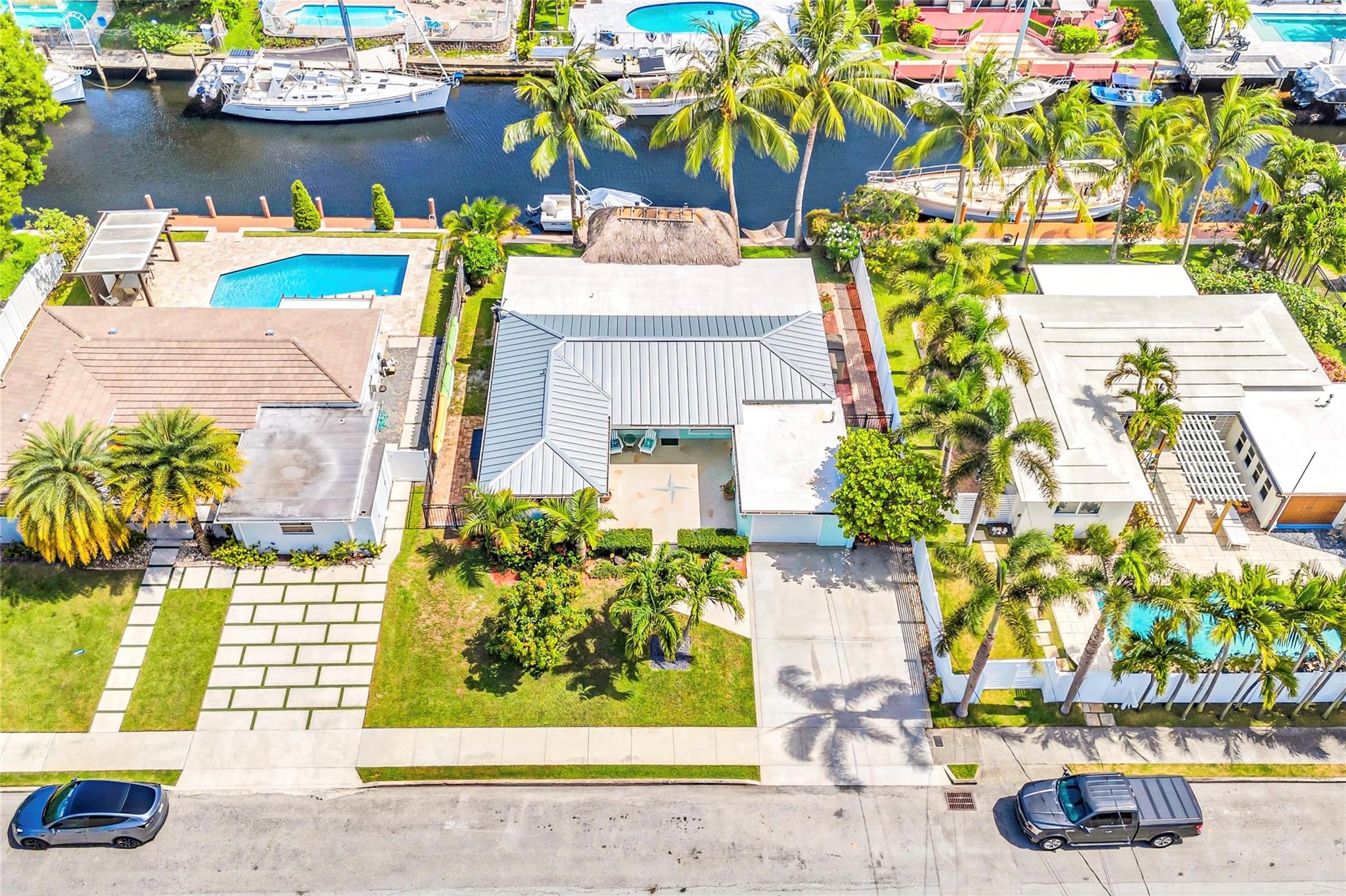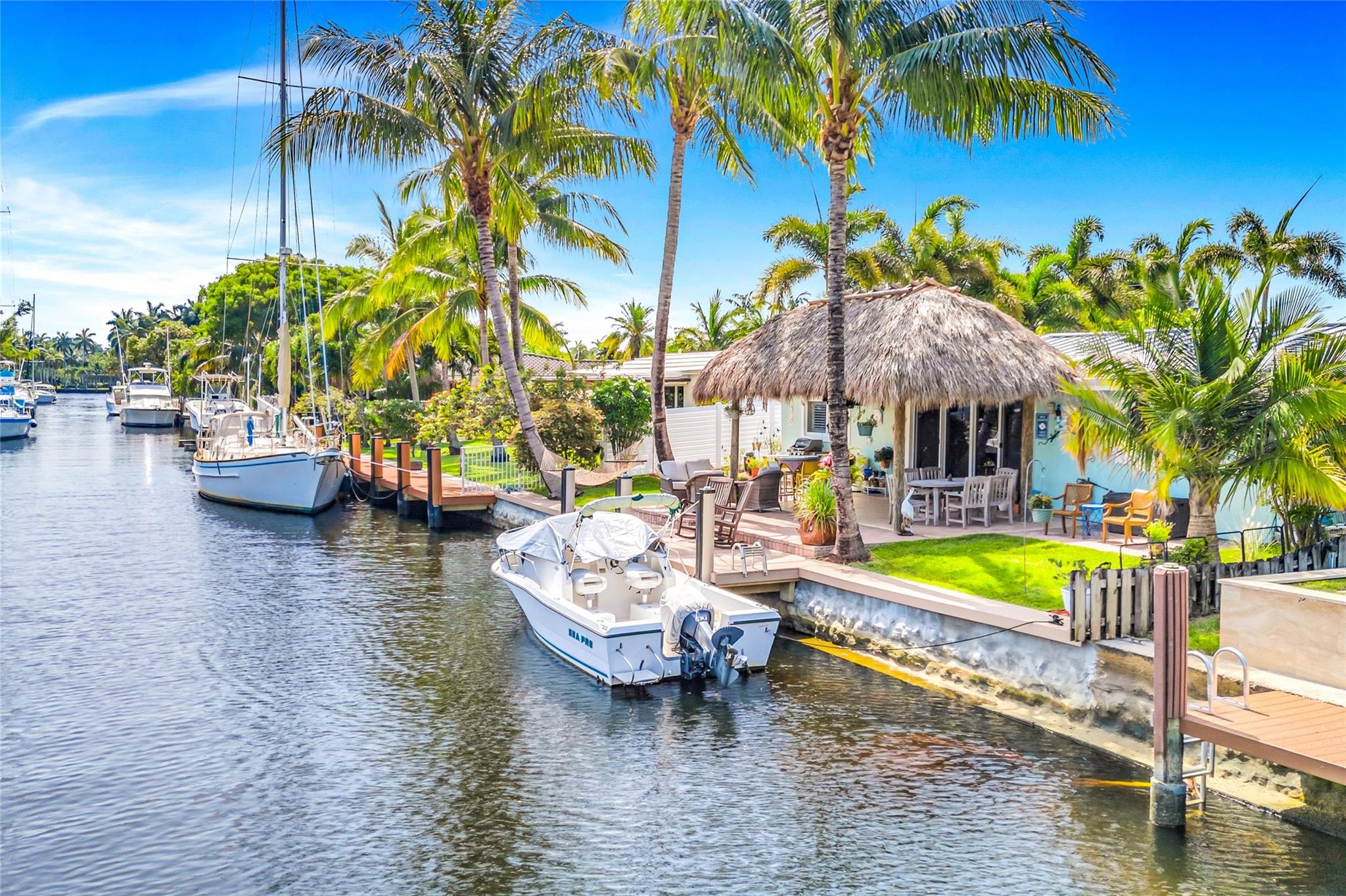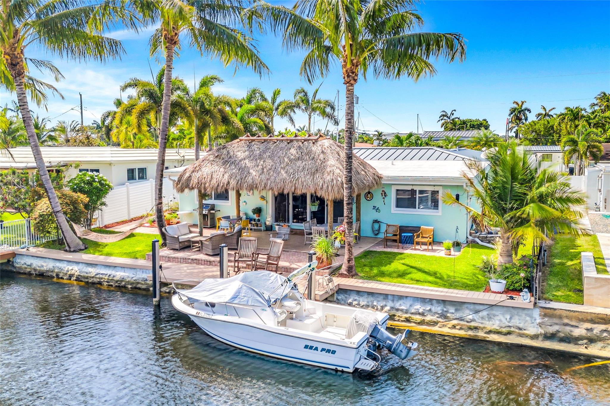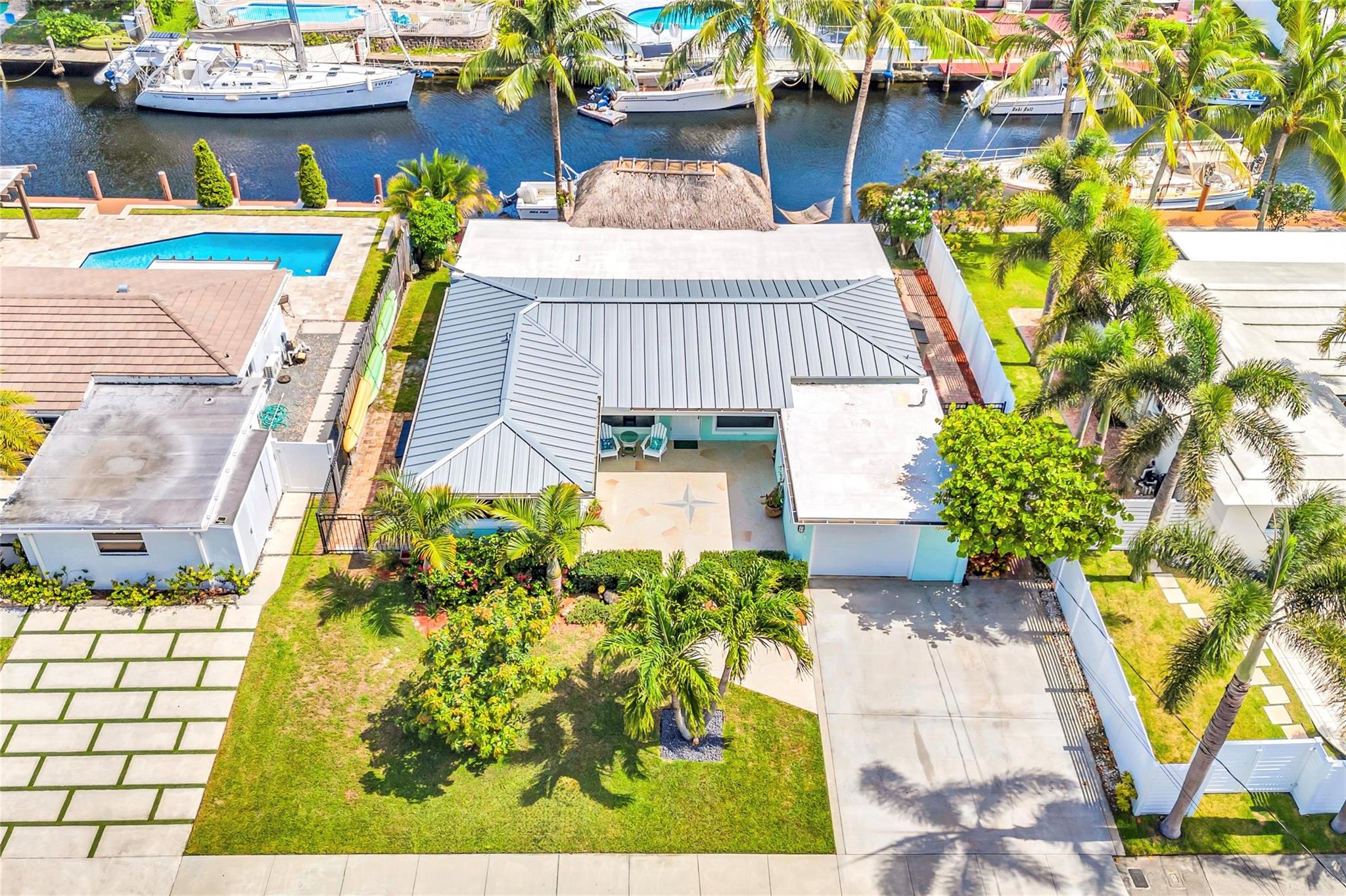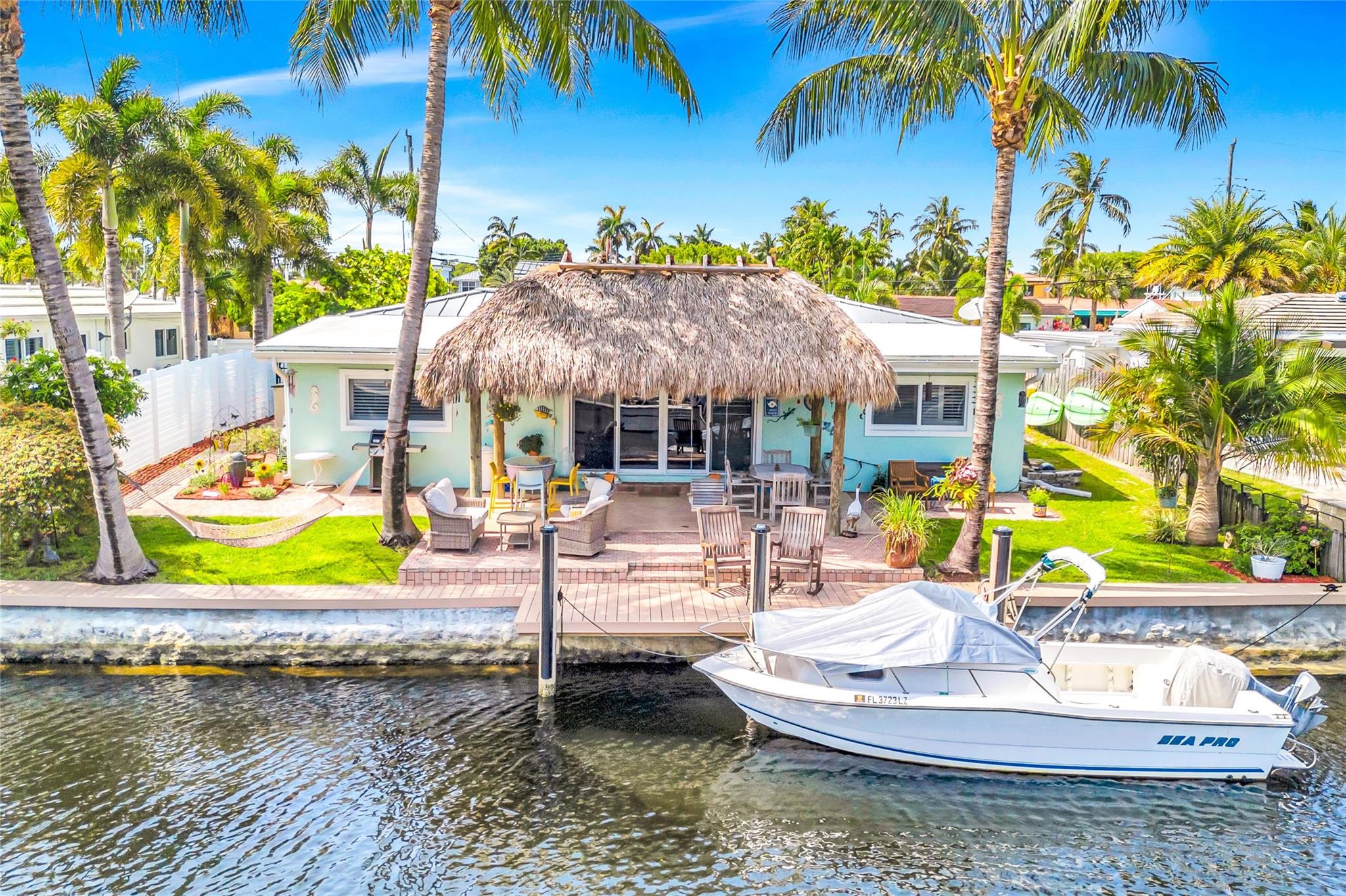 Beautifully remodeled mid-century home with 65 feet of unrestricted deepwater frontage—no fixed bridges to the ocean. Features a spacious open floor plan, gourmet kitchen, and luxurious primary suite with dual vanities. Upgrades include impact-resistant windows and doors, a new metal roof, premium flooring, and designer finishes throughout the property. Enjoy waterfront living with a tiki hut and private dock, just minutes to Las Olas, downtown, beaches, FLL Airport, and the hospital. Boater’s dream in an excellent Fort Lauderdale location! No HOA. MAJOR UPGRADES: Metal Roof 2021, Flat Roof 2017, HVAC 2016, Tiki Hut 2019, Fence 2019, All Impact Windows and Doors 2017, Concrete Driveway and Paver Front Patio 2019, Fence 2020, Natural Gas 2017.