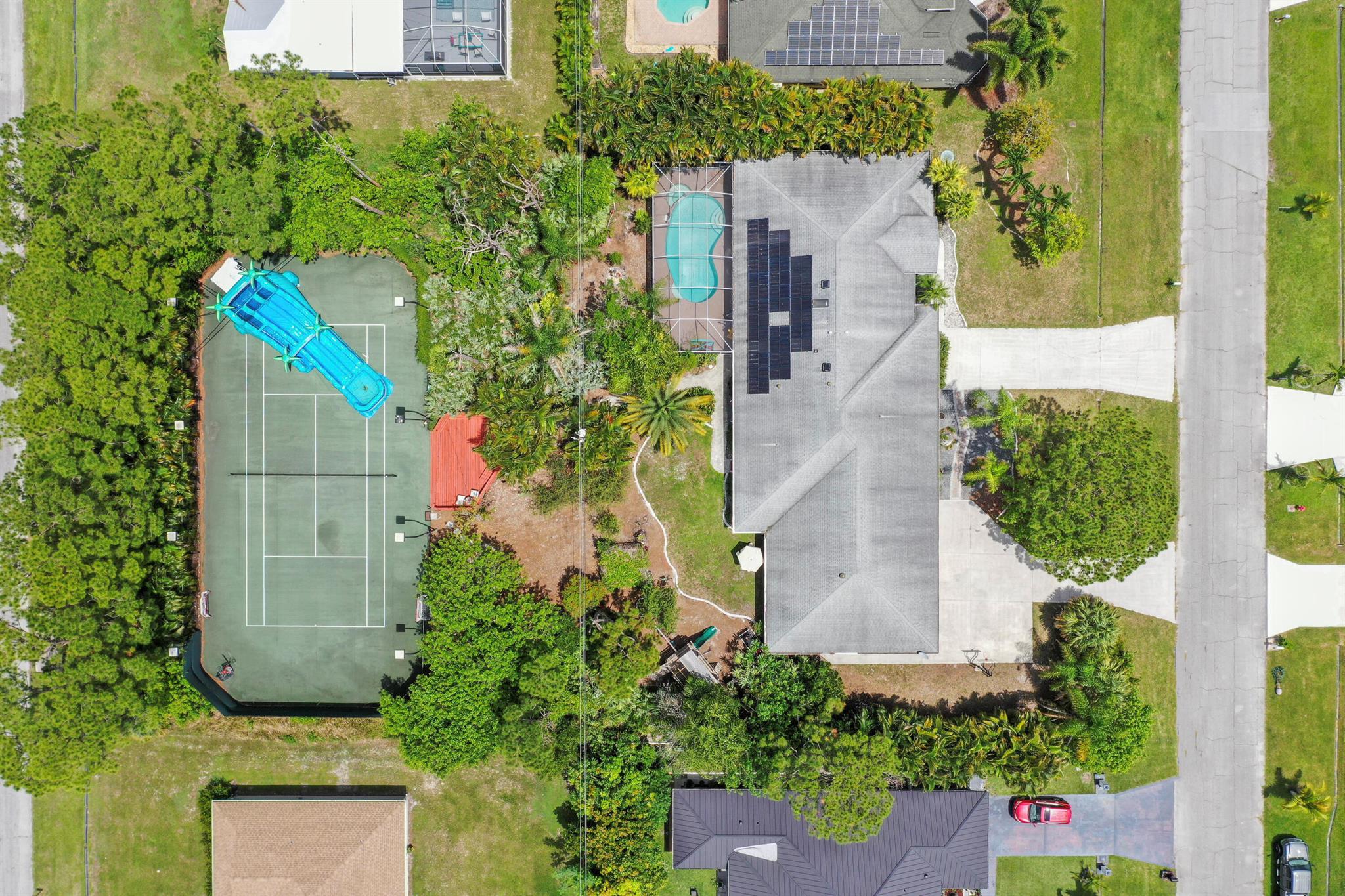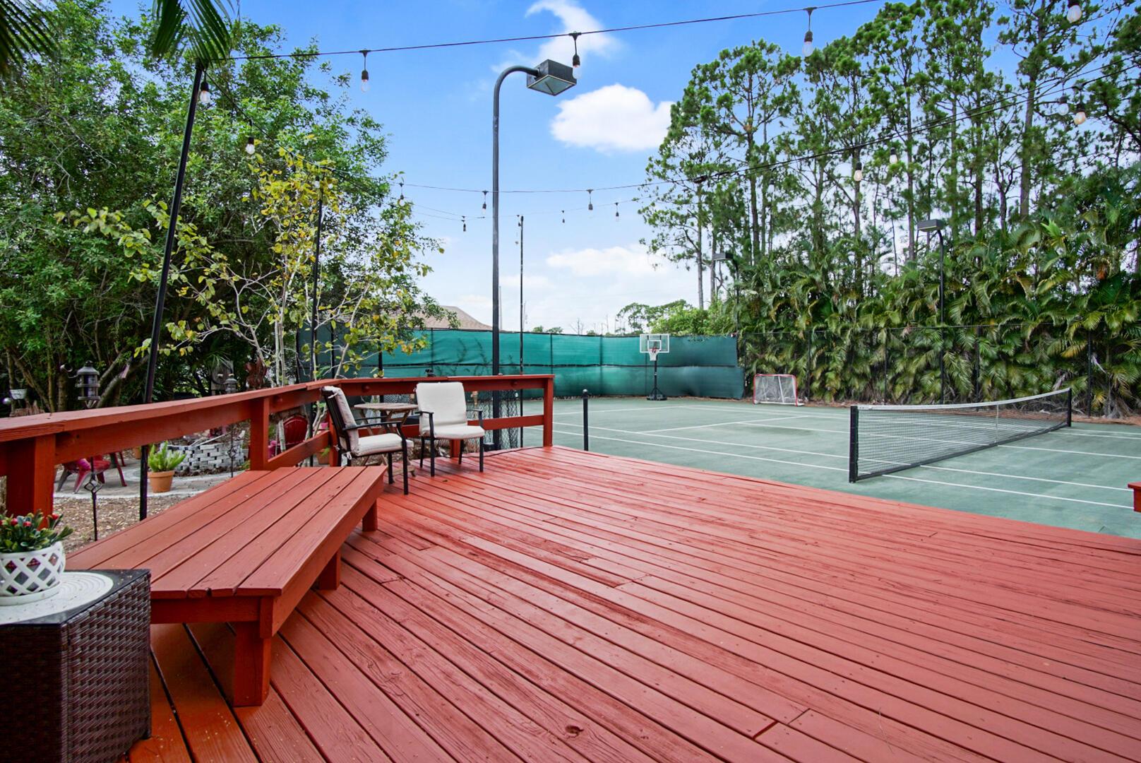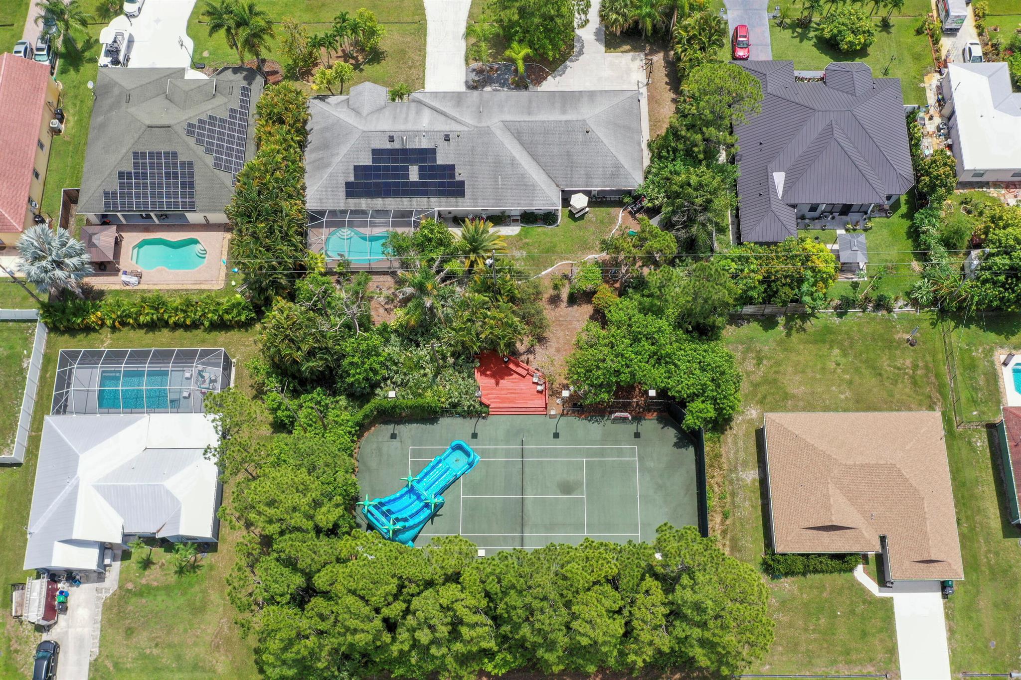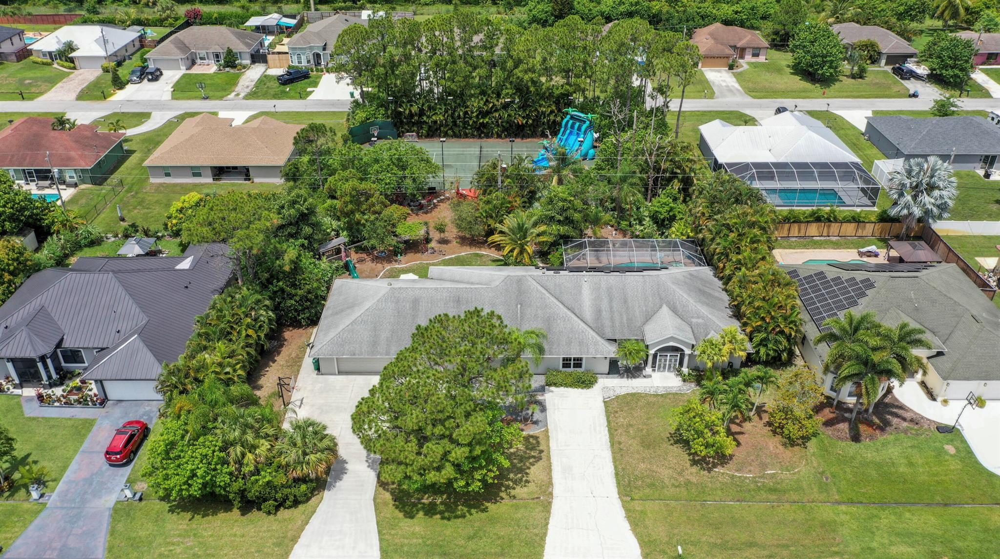 Welcome to your Oasis in Paradise! On almost one full acre sits this expansive 3700 sqft 4CG pool home ! This includes the master bedroom and updated bathroom, 1 ensuite, 3 LARGE bedrooms, and an indoor gym(6th bedroom). This home also features a formal dining, living, family, and sitting rooms. Indoor laundry with ample storage closets throughout. SS appliances, breakfast bar and pantry are great features of the kitchen. Screen enclosure covers the pool and deck with an additional patio behind the garage. Let's not forget the FULL SIZE tennis court, fully fenced and lighted. Friends and family can enjoy watching from the large viewing deck. The backyard also has a brick paver fire pit, multiple garden areas, a play-house and rose garden. Also has owned solar panels!Come see your new home