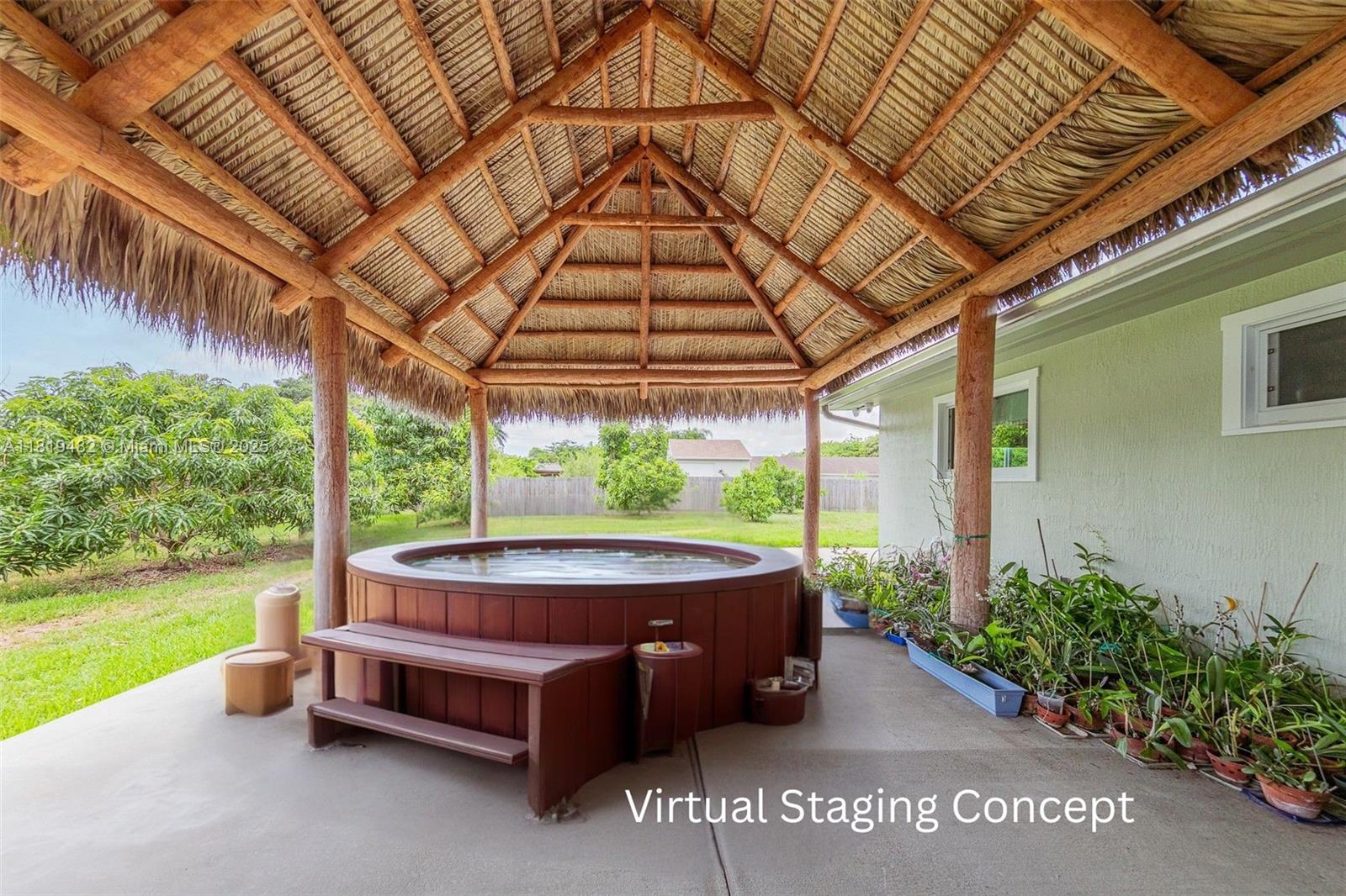 Country living at its best! Cozy, updated home in North Redland area of Homestead. Features and highlights include New Impact Windows and Doors, New Kitchen with high-end GE Café Appliances. Remodeled Great Room with Custom Woodwork and built in Bar, spacious Tiki Hut for enjoyment of the outdoors. Updated Bathrooms including Jacuzzi Tub. Freshly re-stuccoed and painted exterior. Freshly painted interior. Updated electrical. Recessed Lighting. Newer Security System with Cameras. New gutter and downspout system. Flat roof New 2025. Fully fenced and Gated, Two newer Driveways, two new septic systems. Many fruit trees. Plenty of room for boats, RVs, etc. In addition, a multi-stall Garage Workshop with income potential. One-half acre Agricultural Tax Exemption! Come see it today.