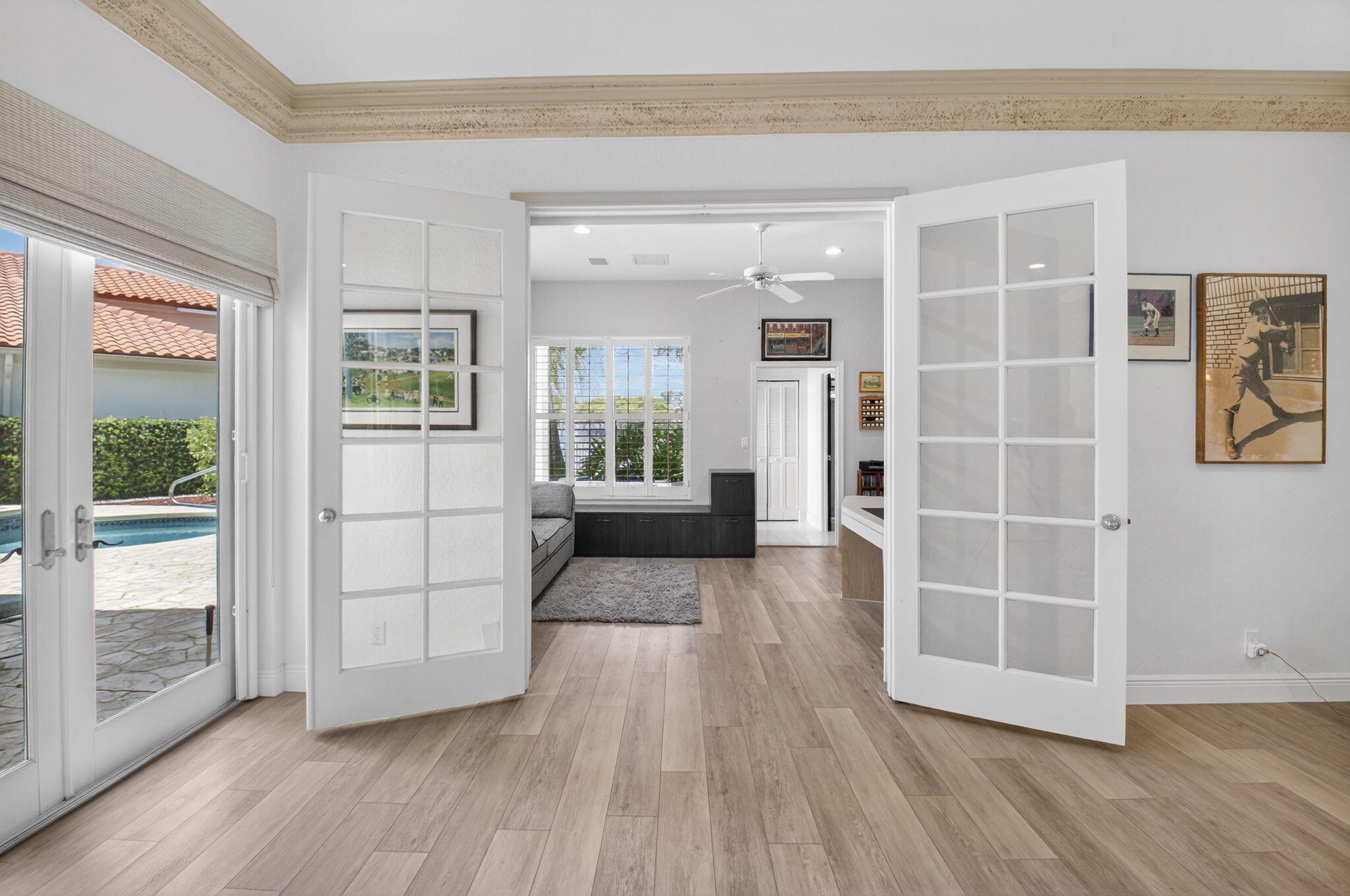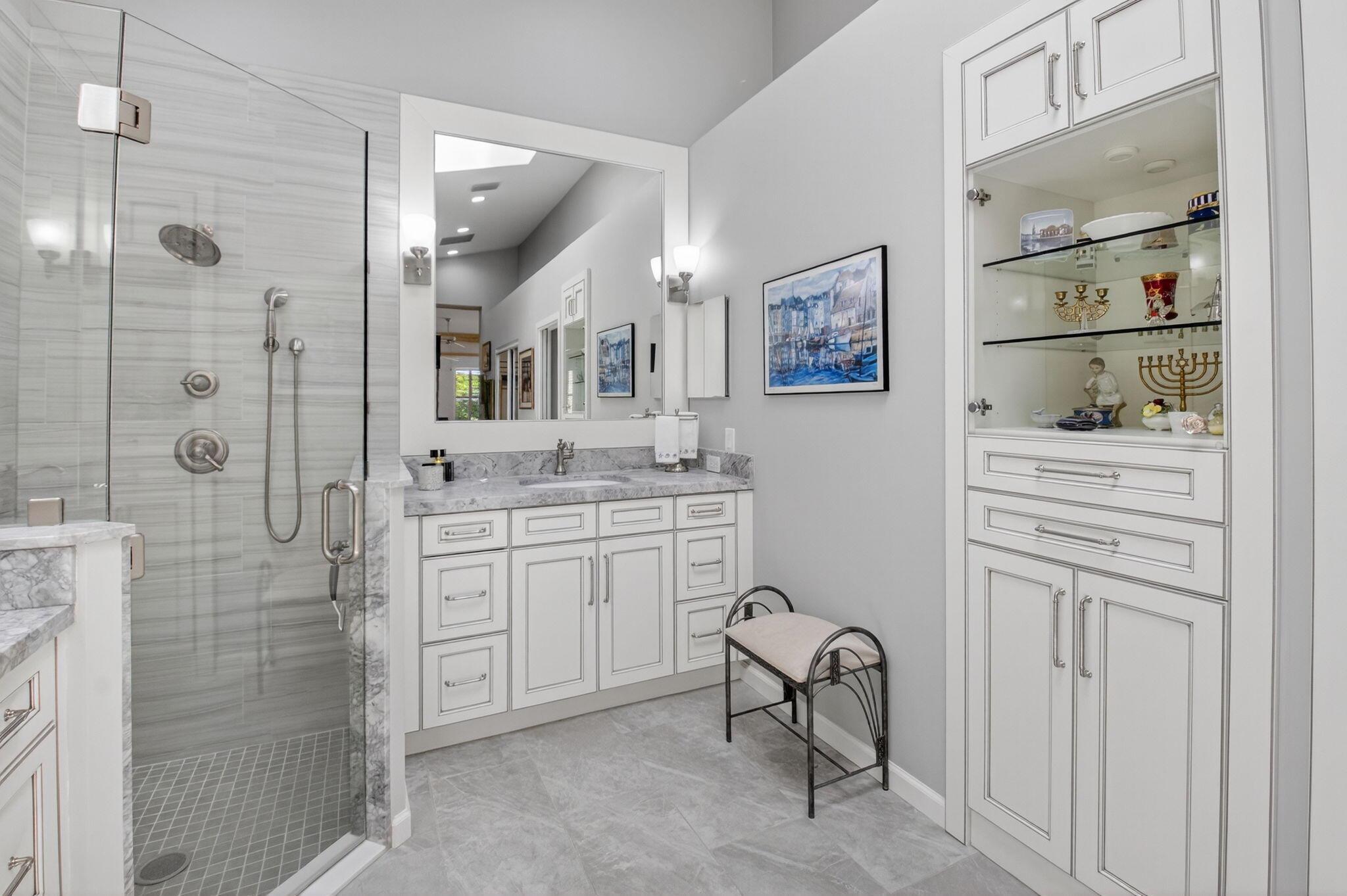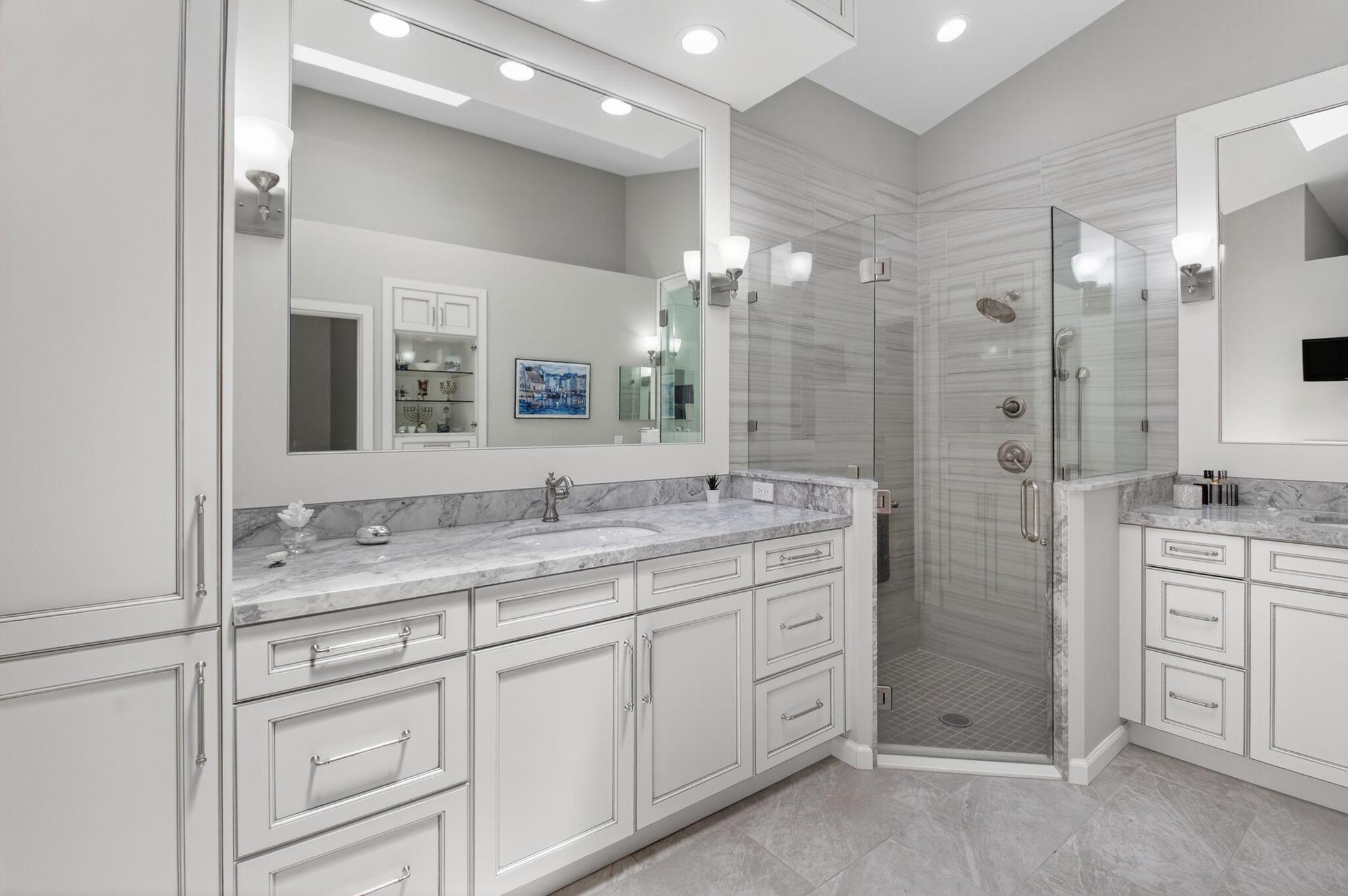 Experience serene lakefront living on one of the largest private lake lots in Santa Barbara. Beautiful bright open living area with a grand foyer, volume ceilings and tile floors. Triple-split floorplan affords privacy for everyone. Fabulous updated white kitchen with custom cabinets, quartz countertops, center island, gas cooktop, stainless appliances and breakfast area. Expansive primary suite with spa-like updated white bath offering dual marble top vanities, custom tile shower and two fitted walk-in closets. Tranquil inviting oversized lushly landscaped side and backyard perfect for relaxing and entertaining family and friends. Take a dip in your sparkling freeform pool with soothing waterfall spa. 4th bedroom currently used a home office with a full private bath. A must see!