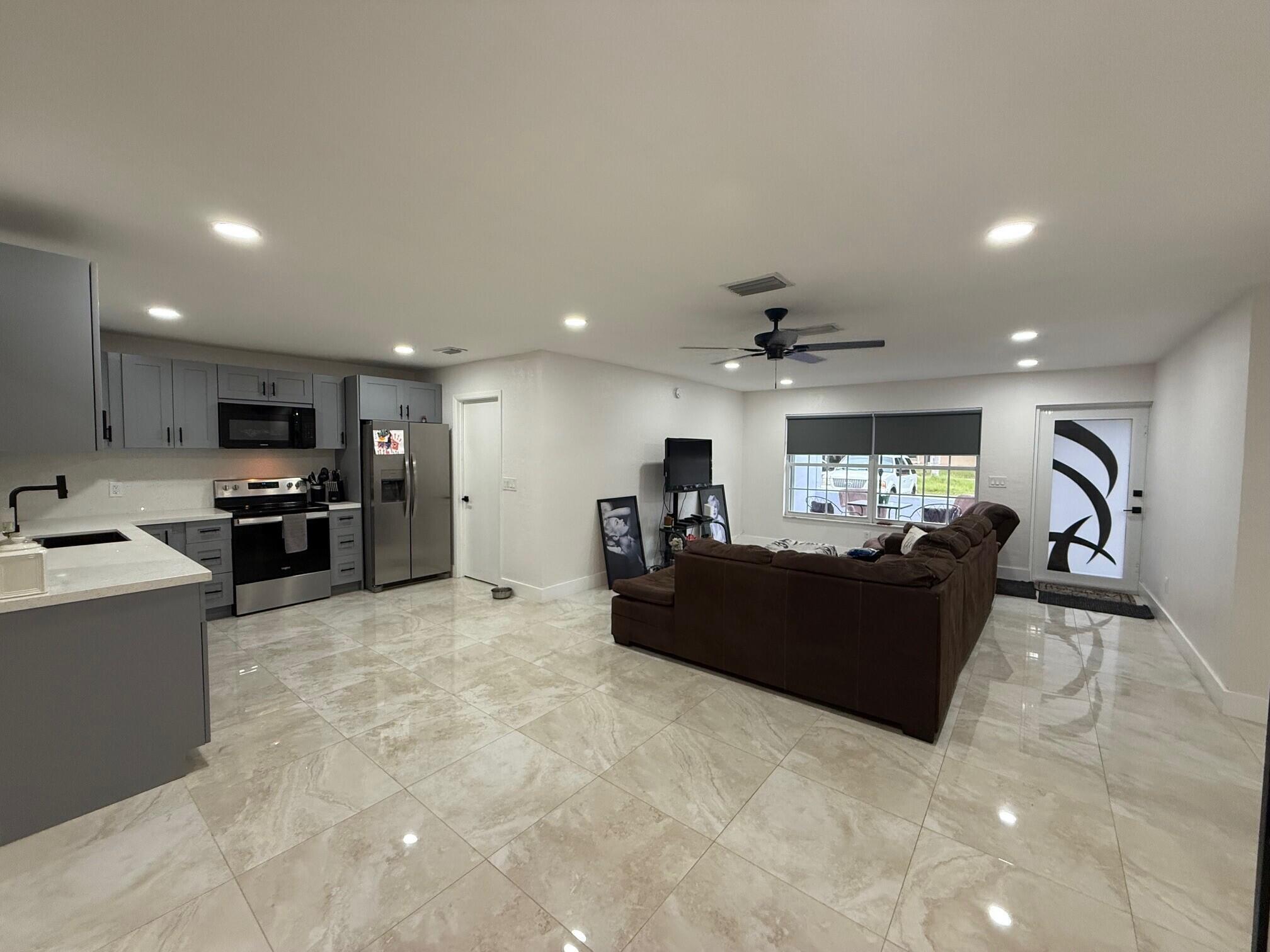 Motivated Seller! Beautifully remodeled 3-bedroom, 2-bath home located on a quiet cul-de-sac with no HOA. This home features porcelain tile flooring, modern LED lighting, ceiling fans with remotes, and a fully updated kitchen with blue cabinetry, quartz countertops, backsplash, and stainless-steel appliances. Enjoy a spacious backyard, enclosed patio, 1-car garage, laundry room with washer and dryer, accordion hurricane shutters, and a new impact-rated front door.