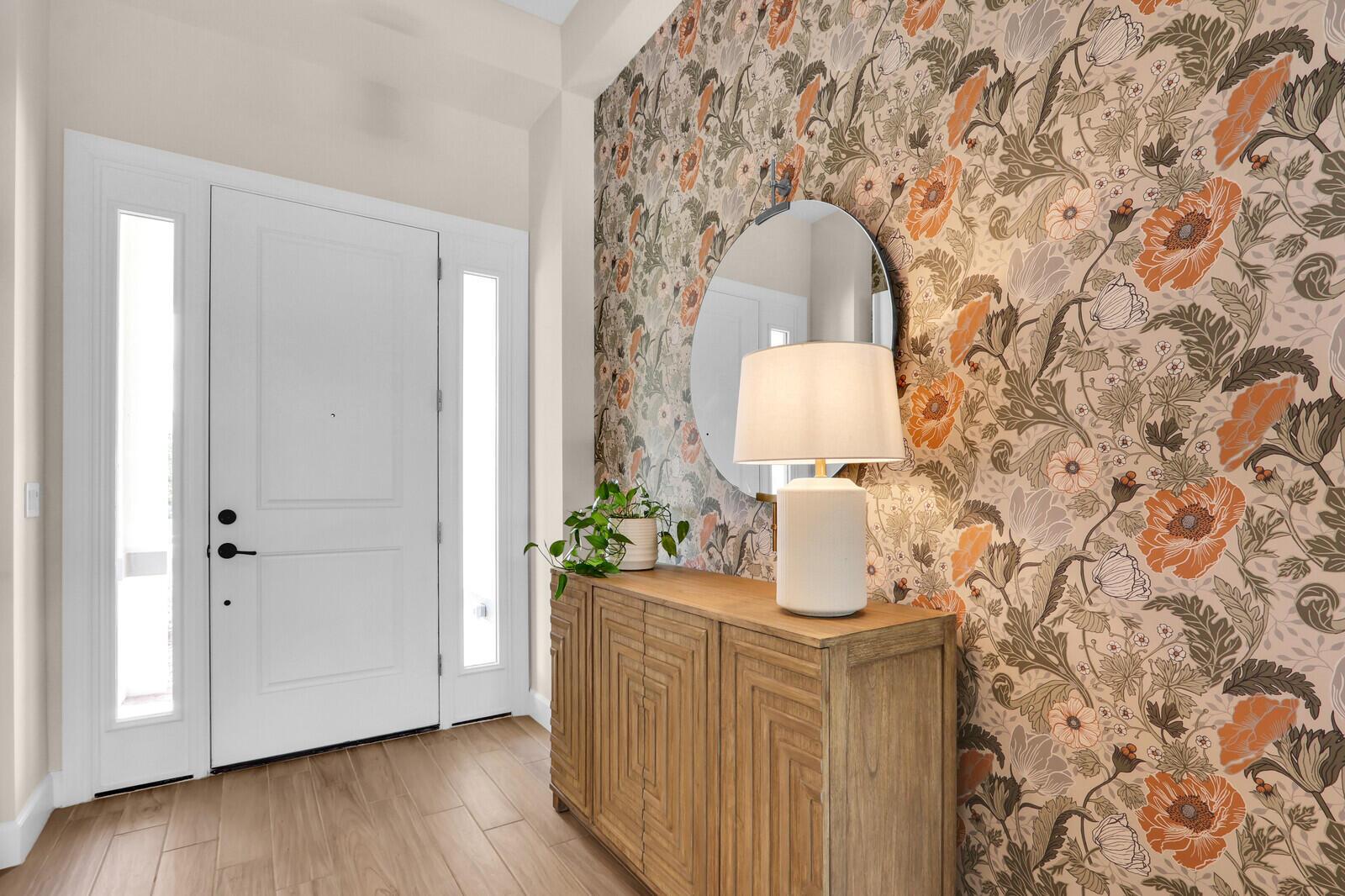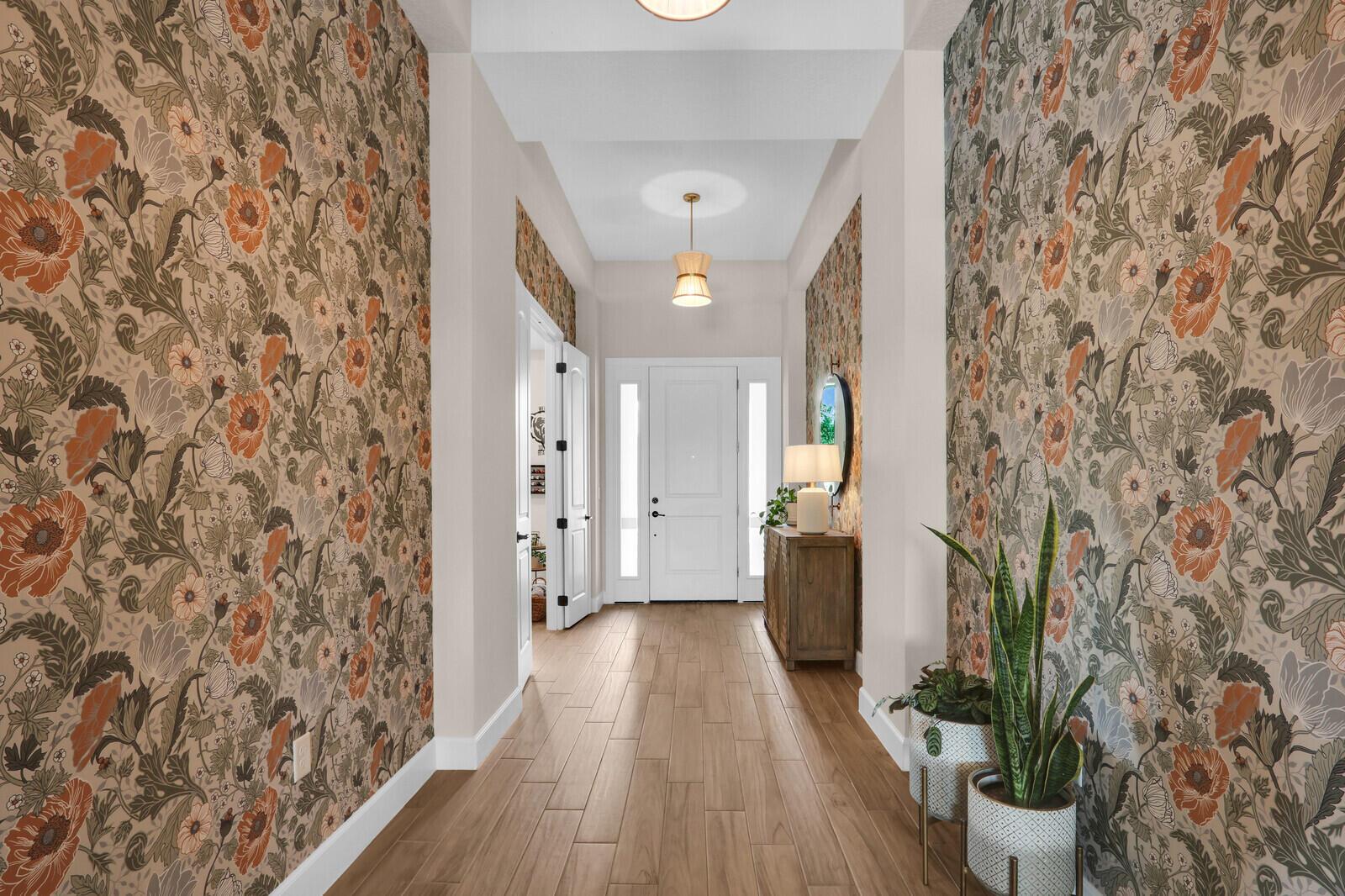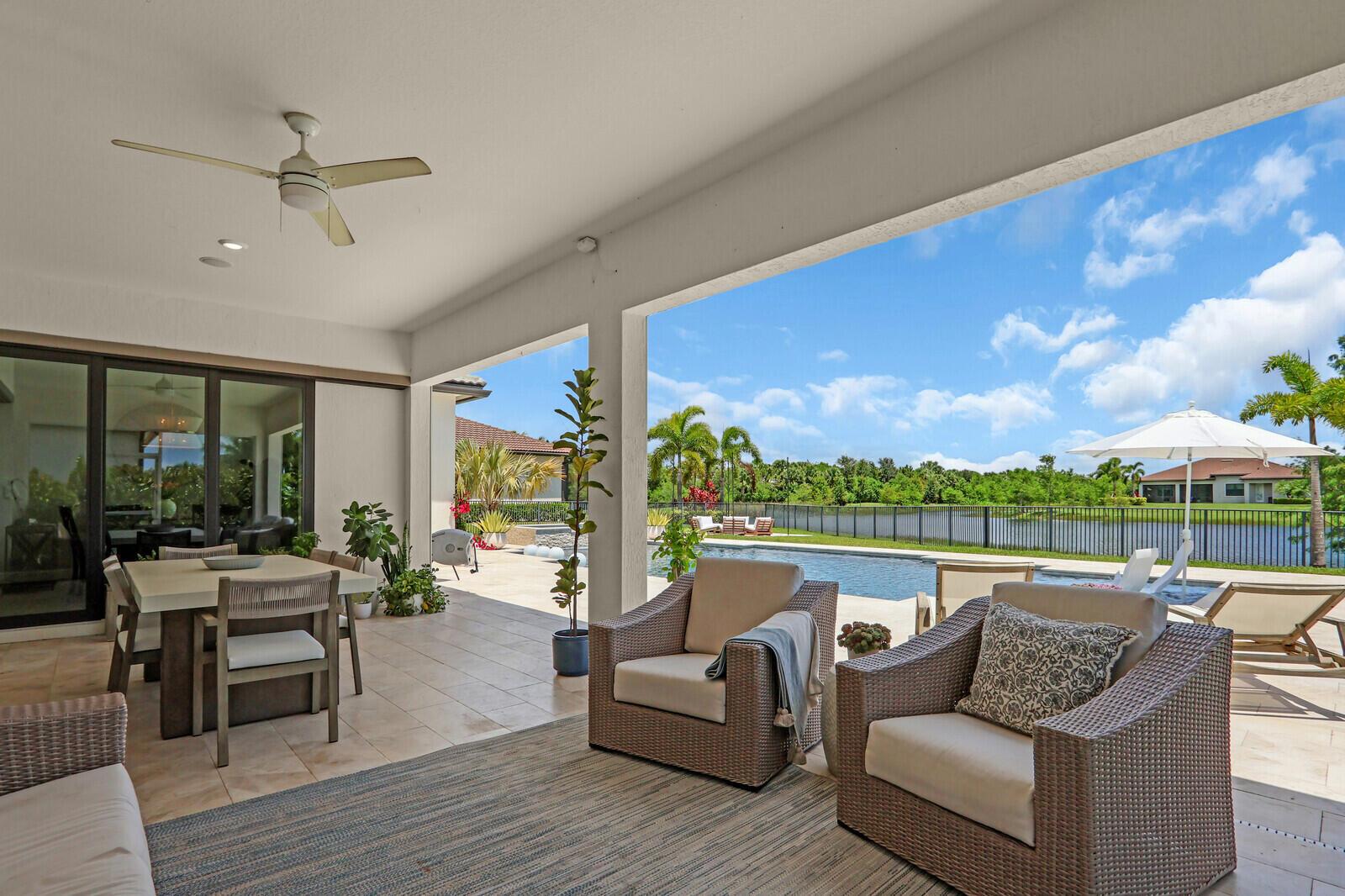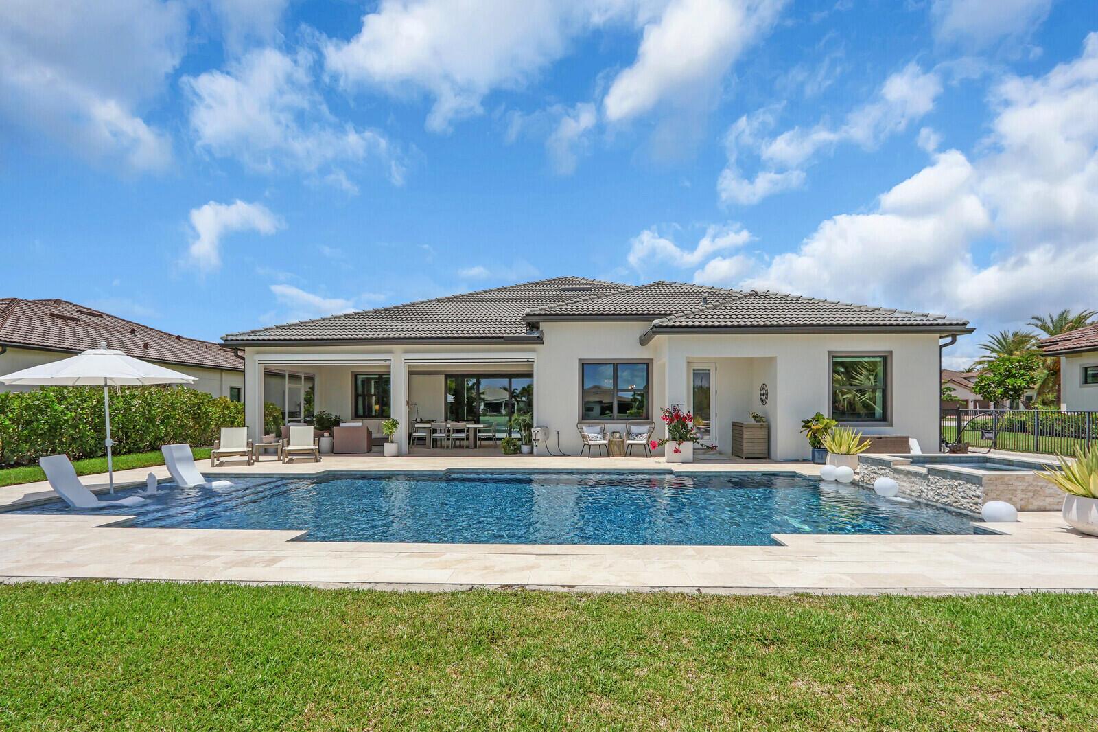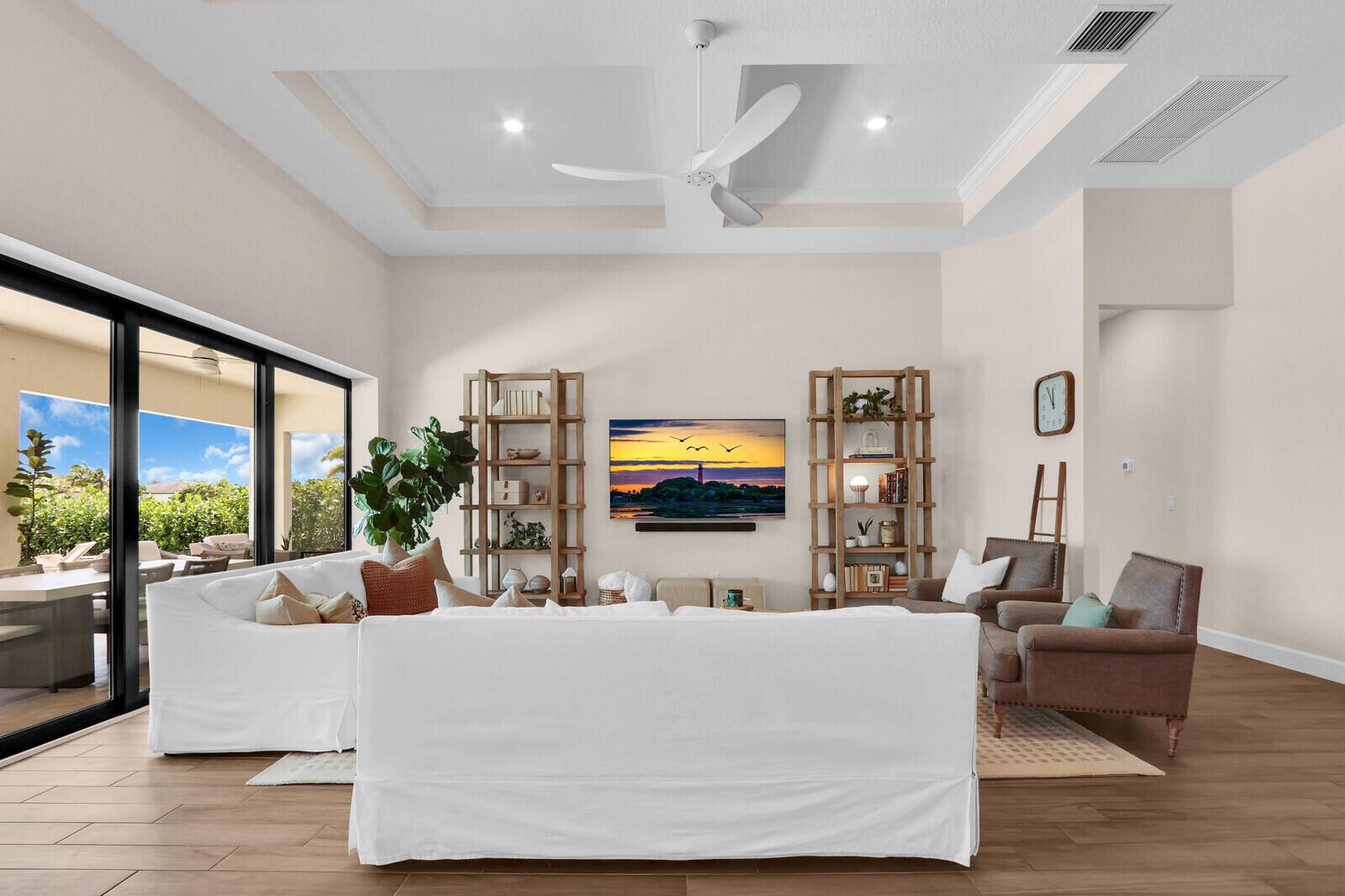 Welcome to this beautifully appointed 4-bedroom, 3-bath pool home in the highly desirable gated community of Ancient Tree. Designed with elegance and functionality in mind, this home features soaring 13-foot vaulted ceilings with inset crown molding in the main living area, and 10-foot ceilings in the bedrooms, creating a spacious and airy atmosphere.At the heart of the property is a spectacular 42' x 21.5' pool with an 8' x 12' entry ledge and a spa with a cascading waterfall perfect for relaxing or entertaining. Enjoy seamless indoor-outdoor living with full sliding glass doors that open to a screened lanai with remote-controlled retractable screens and a built-in fire pit that complements the pool decking. A convenient cabana bath is just steps from the pool.