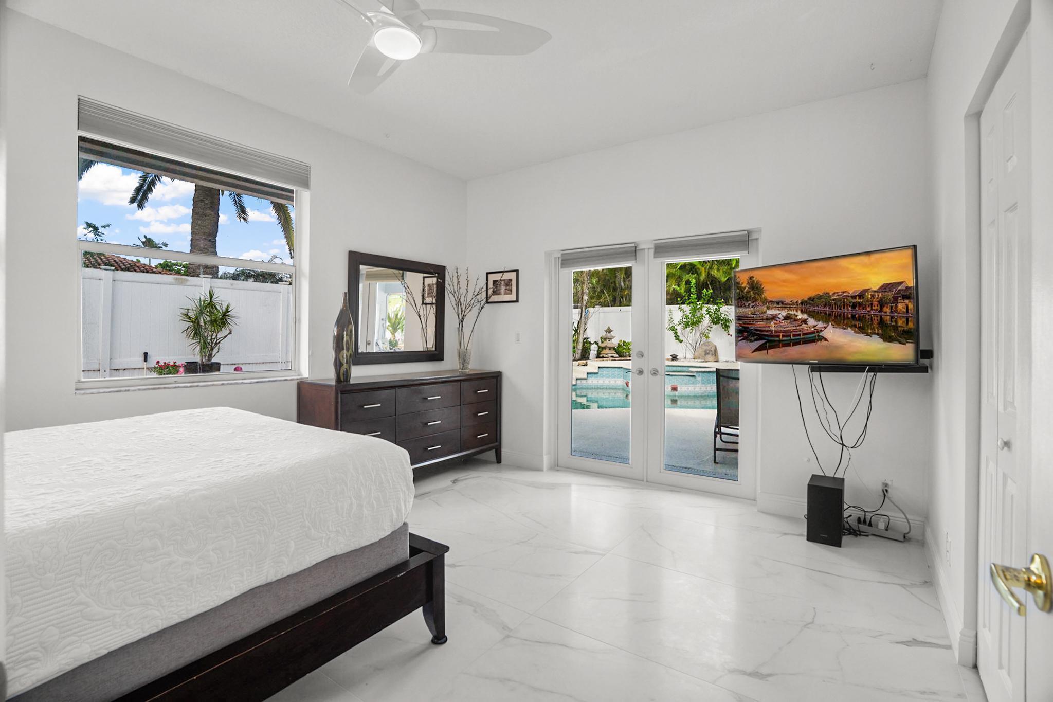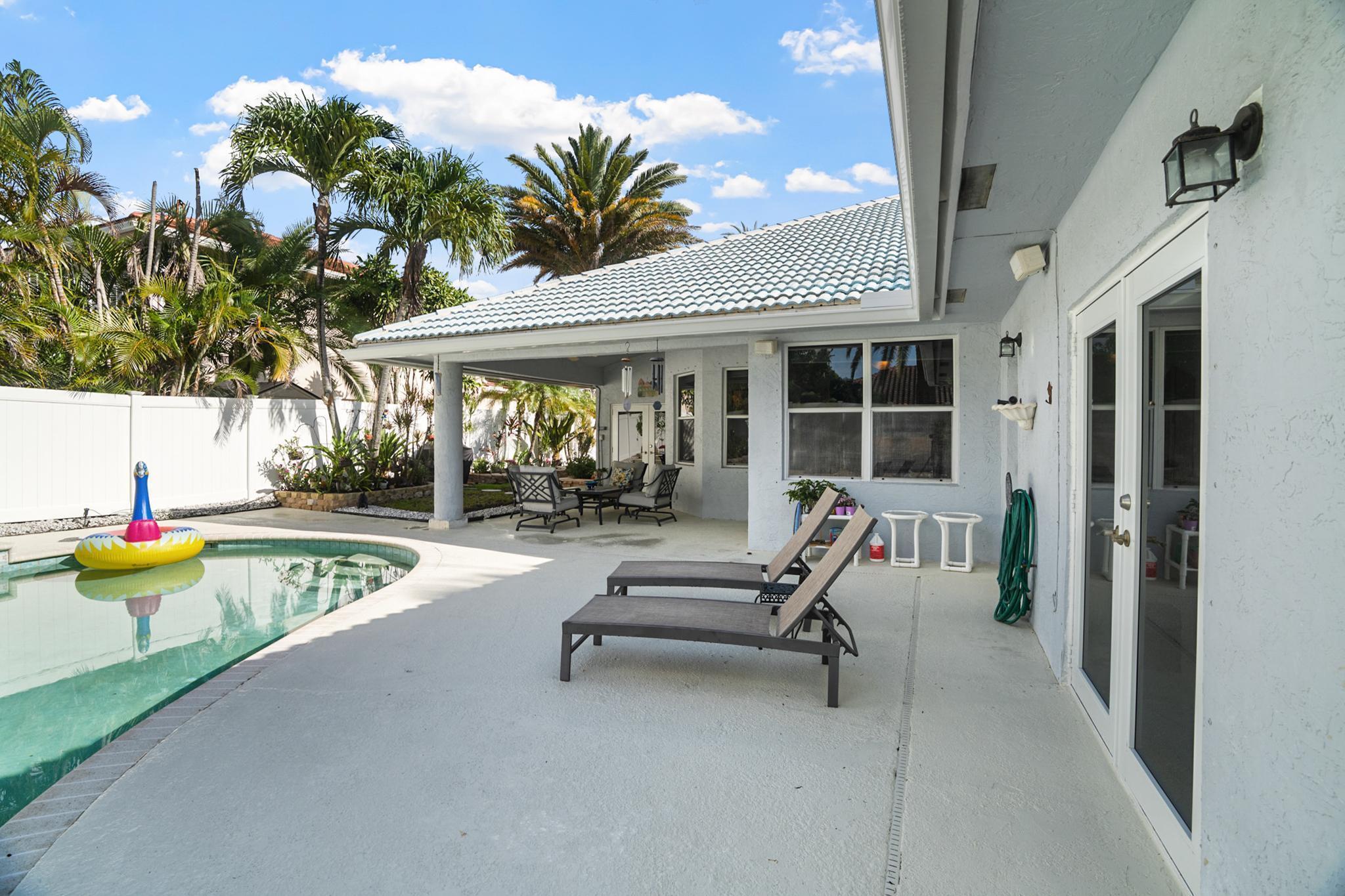 Nestled in a quiet enclave in desirable East Boca Raton, this Mizner Forest home was built in 1998 and offers a thoughtfully designed layout with stylish upgrades throughout. Featuring soaring high ceilings and a renovated white kitchen, the home has modern flooring throughout the main living areas and one guest bedroom & family room. The split bedroom floor plan offers privacy, and the spacious primary suite includes direct access to the covered patio and pool area. Primary bath features a separate soaking tub and shower. Additional highlights include a 3-year-old A/C system, a tankless water heater, and an extra water heater dedicated to the primary suite. Impact doors. Fully fenced backyard is an entertainer's dream, showcasing a stunning pool &expansive patio