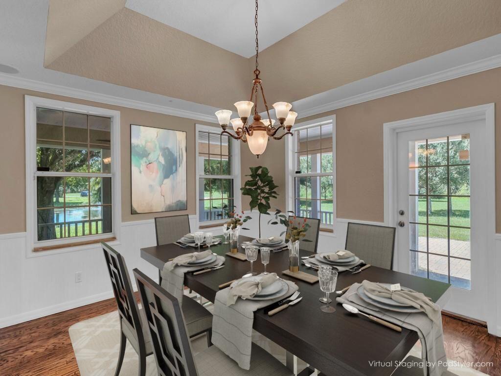 Welcome to this exquisite private, one of a kind custom 5-bedroom, 4.5-bathroom home nestled on 5 acres of pristine land in one of the most desirable neighborhoods in town. This stunning property is a true masterpiece, boasting luxurious finishes, exceptional craftsmanship, and breathtaking views. The main house features an open and spacious floor plan that seamlessly integrates the indoor and outdoor living spaces. The family room features trey ceilings, a cozy fireplace, French doors onto the porch and pool deck and large windows that flood the space with natural light. The formal dining and living rooms feature pocket doors to separate the formal areas. Both have trey ceilings and the dining room features wainscoting. Both formal rooms open onto the wraparound front porch.