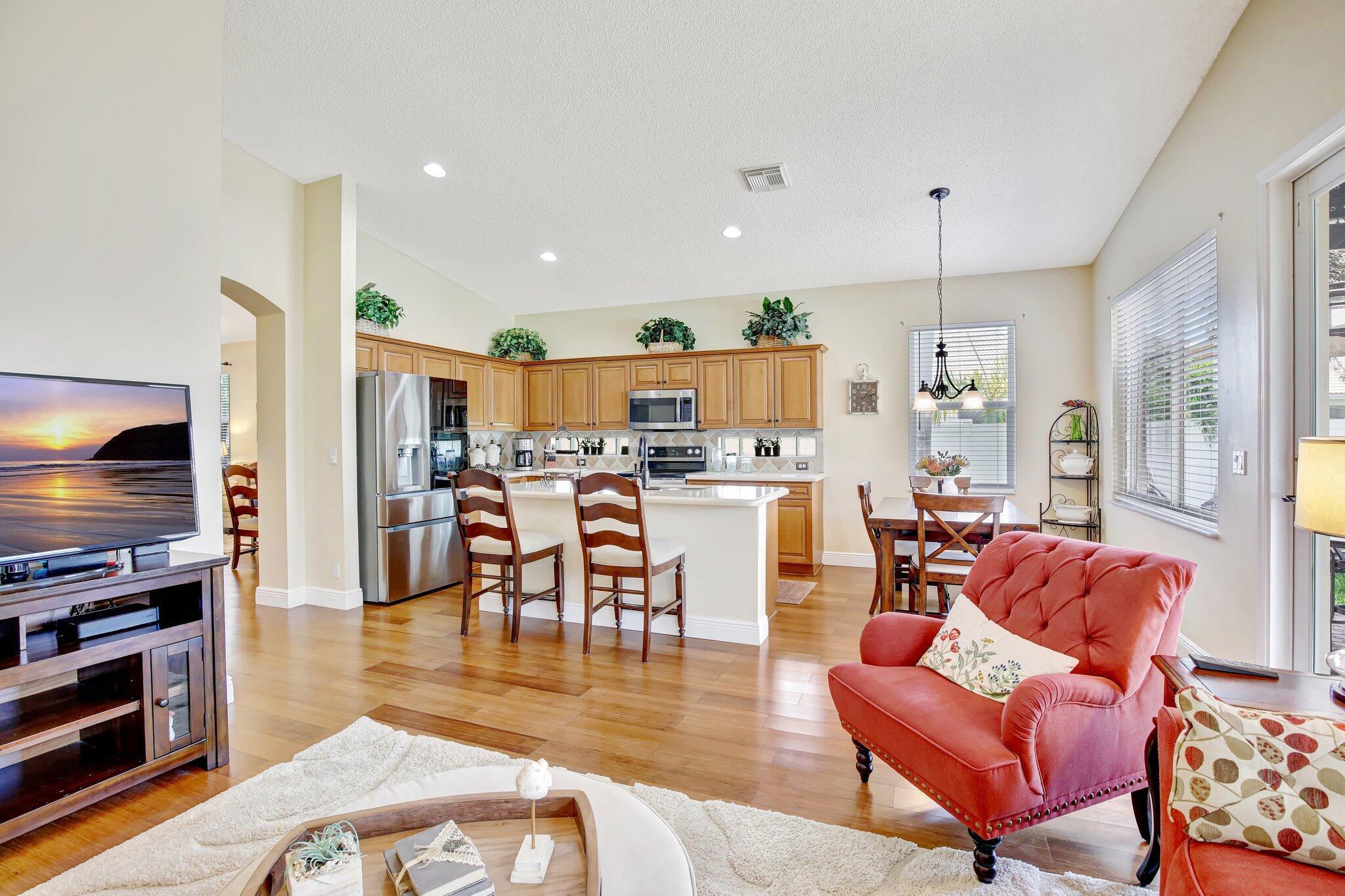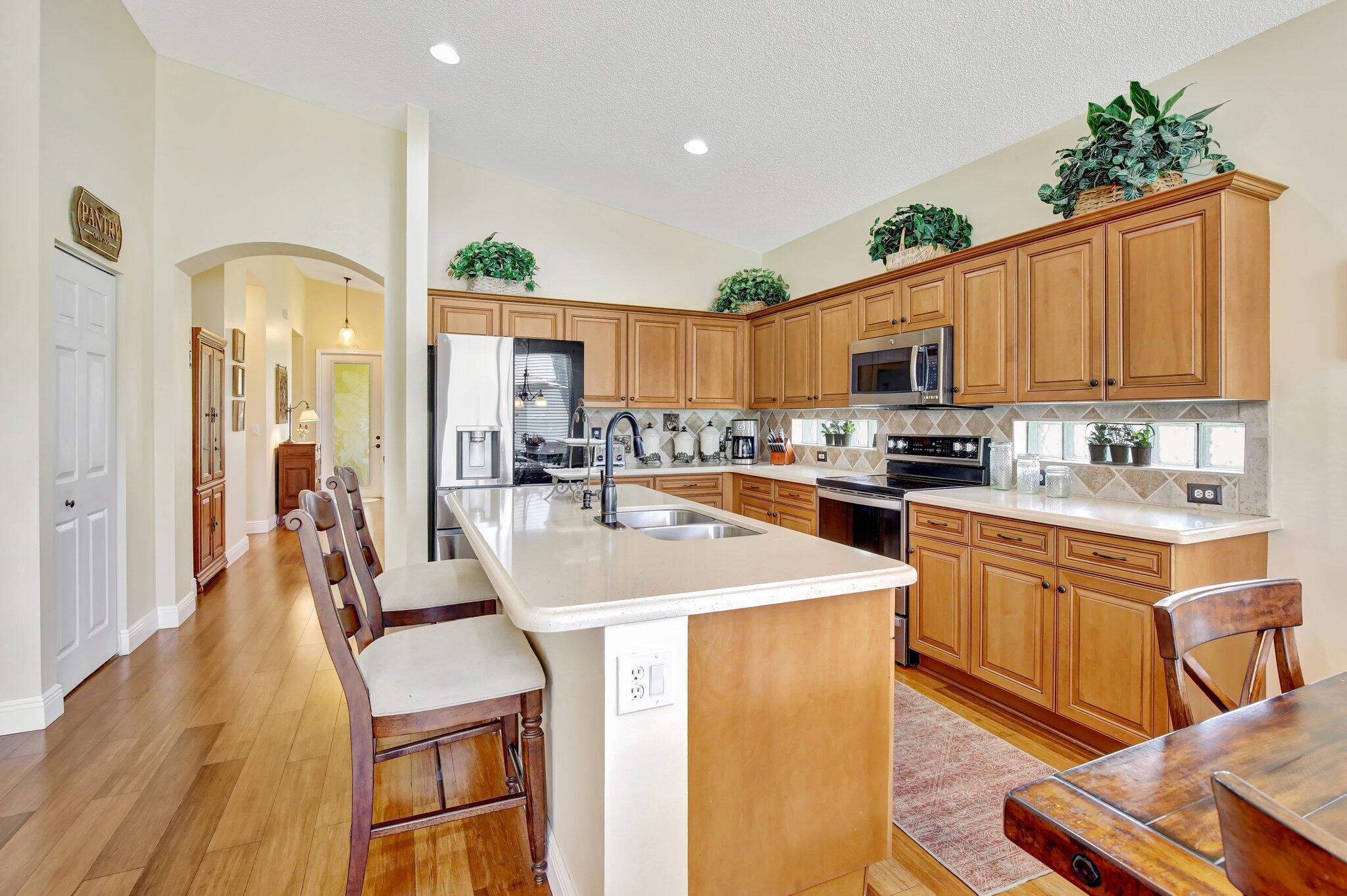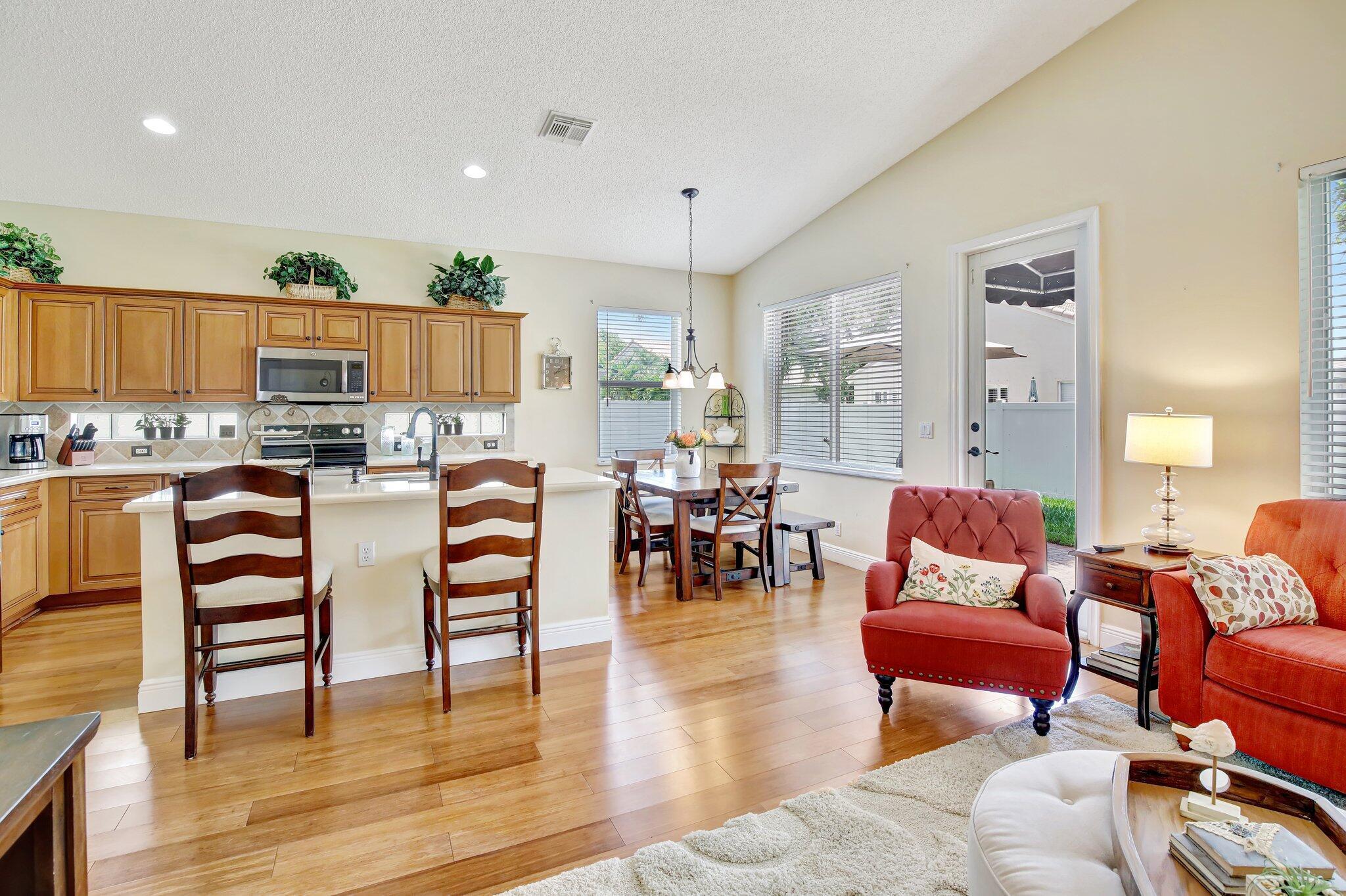 Updated 3 bedroom 2 bathroom 2 car garage home with plenty of extras. New roof and newer impact windows and doors throughout. A large and open gourmet kitchen, that features an eat in kitchen area, plus island counter dining area. This home features high vaulted ceilings plus wood flooring and a paver brick driveway. partially fenced yard with a patio in the backyard. Pembroke Shores is a gated community close to shopping, and parks.