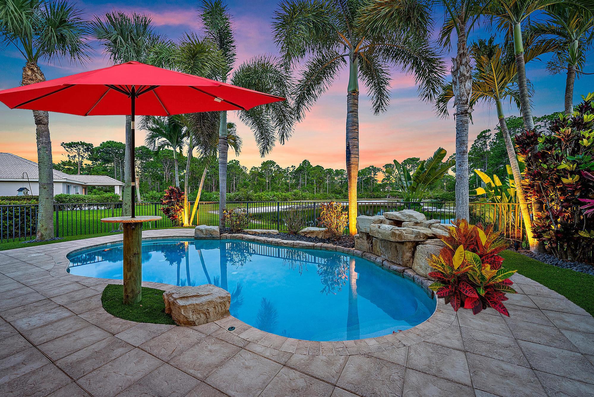 Experience LUXURY living in this stunning 4-bedroom, 3.5 bath pool home located in the sought-after Oaks of Hobe Sound. This beautifully designed lakefront residence offers the perfect combination of style, functionality, and peace of mind. Step inside to soaring 20-foot ceilings and an abundance of natural light. Features include a custom electric fireplace, wood-look porcelain tile throughout the main level, and IMPACT windows. The gourmet kitchen is complete with stainless appliances, double ovens, 42'' wood cabinetry, a center cook island, granite counters, and a picturesque window overlooking the pool and lake. The first floor primary suite is a true retreat, offering direct access through sliding doors to the pool, perfect for a peaceful morning dip or evening swim under the stars.