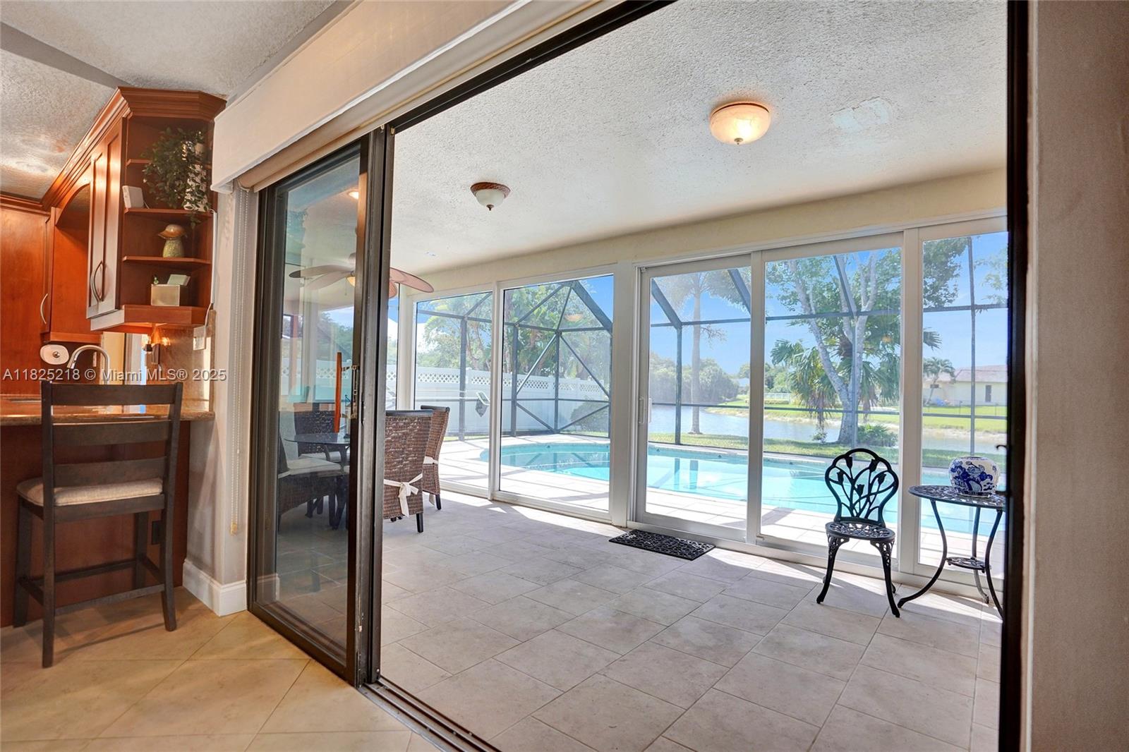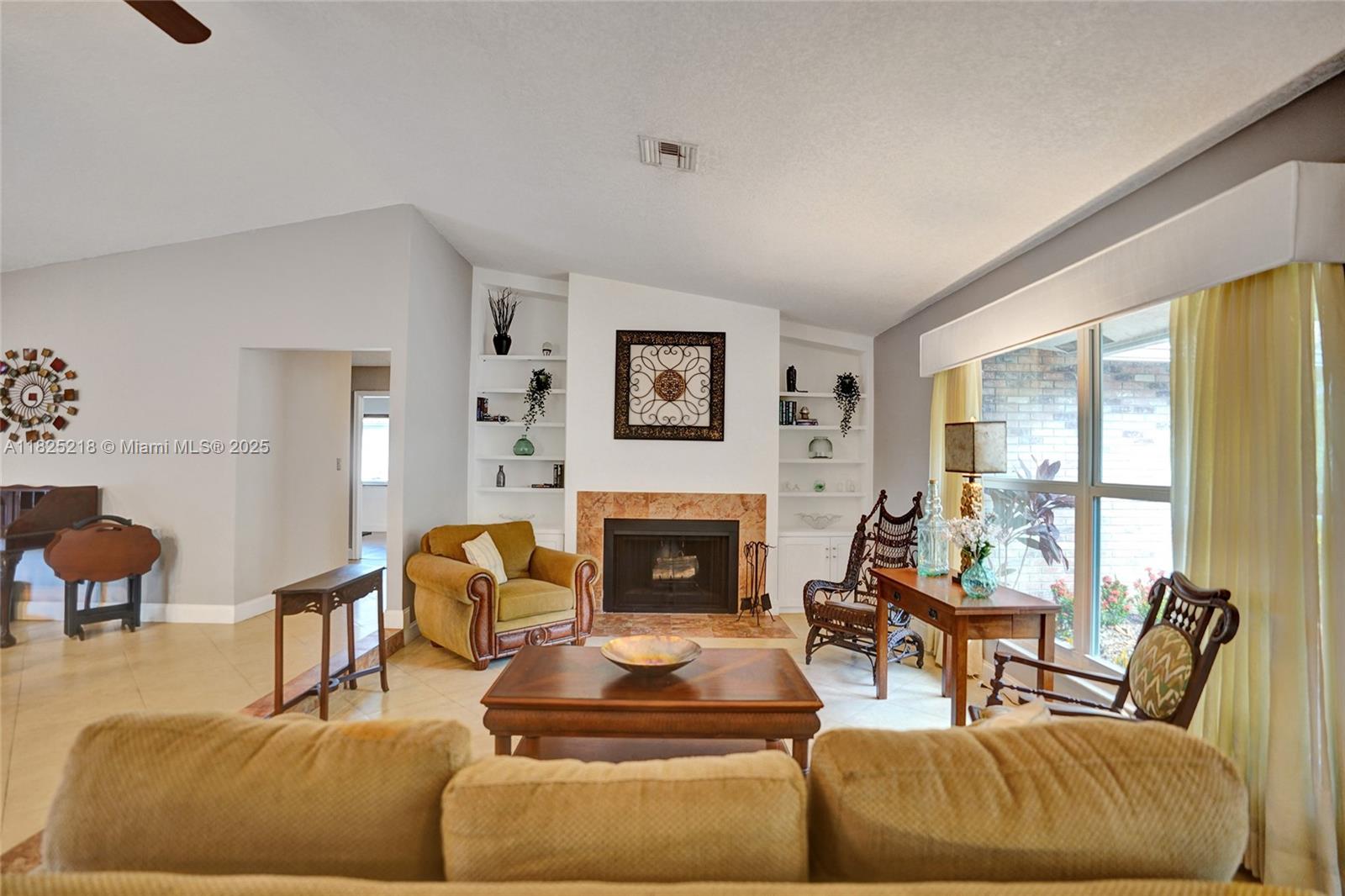Vaulted ceilings accent open living spaces in the main living areas, built-in bookcases flanking a fireplace! Formal dining room currently used for a cozy TV space. Attractive hood over cooktop, granite countertops & full backsplash, crown molding on cabinets, stainless steel appliances! Patio off of the sitting area. The oversized laundry room includes abundant cabinets, folding space, a tankless water heater, LG washer & GE dryer. Most bedrooms with wood floors & one used as a office is tiled.The primary suite featuress a walk-in closet & updated bath. Enjoy serene triple water views across from a park off of the screened-in pool with a beautifully tiled deck & cabana bath access. Enclosed sunroom! Full impact windows, tile & wood flooring. Circular drive this must-see home with no HOA!