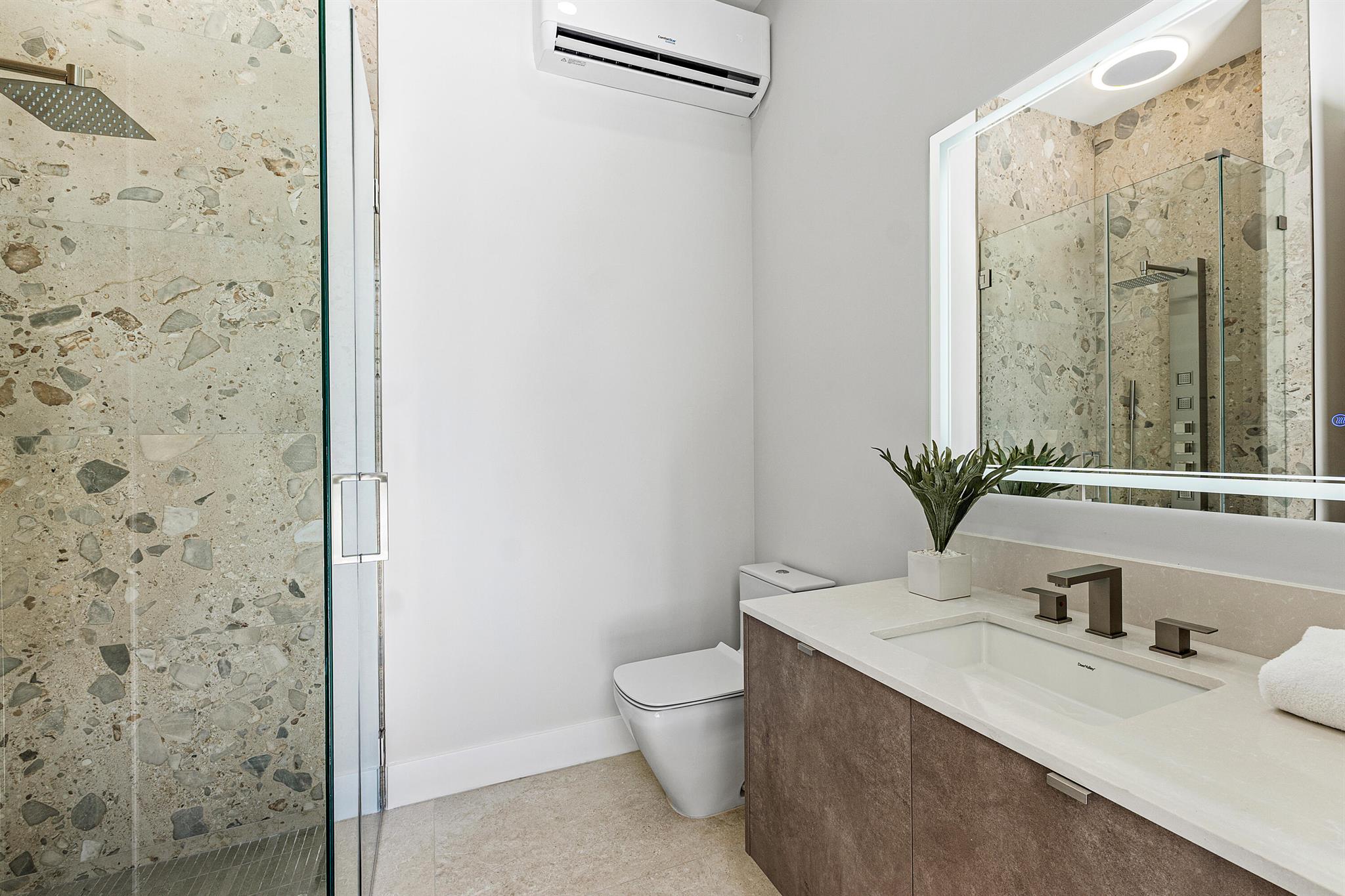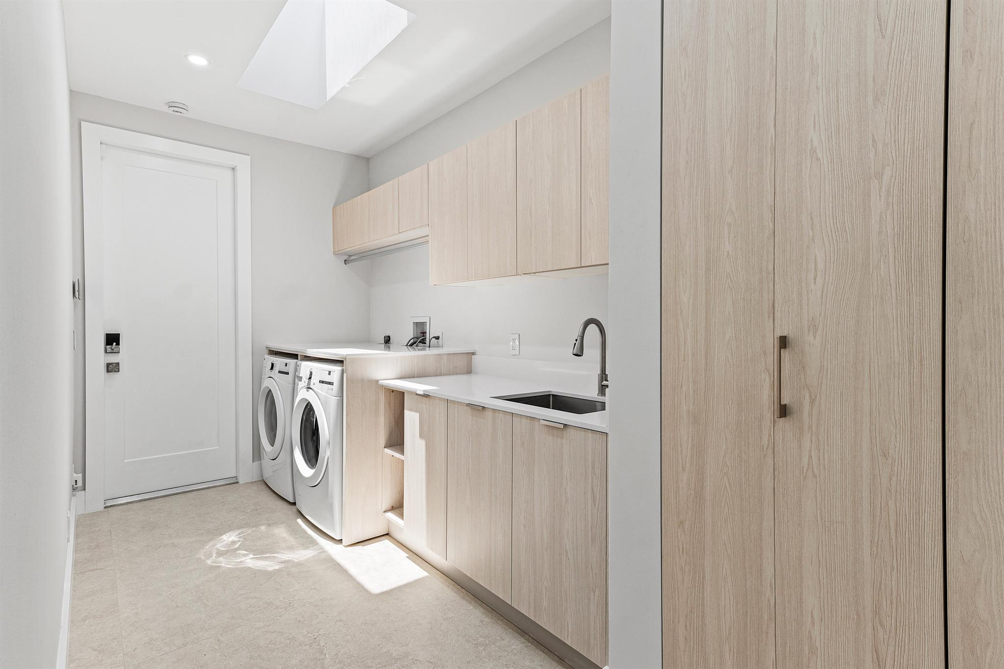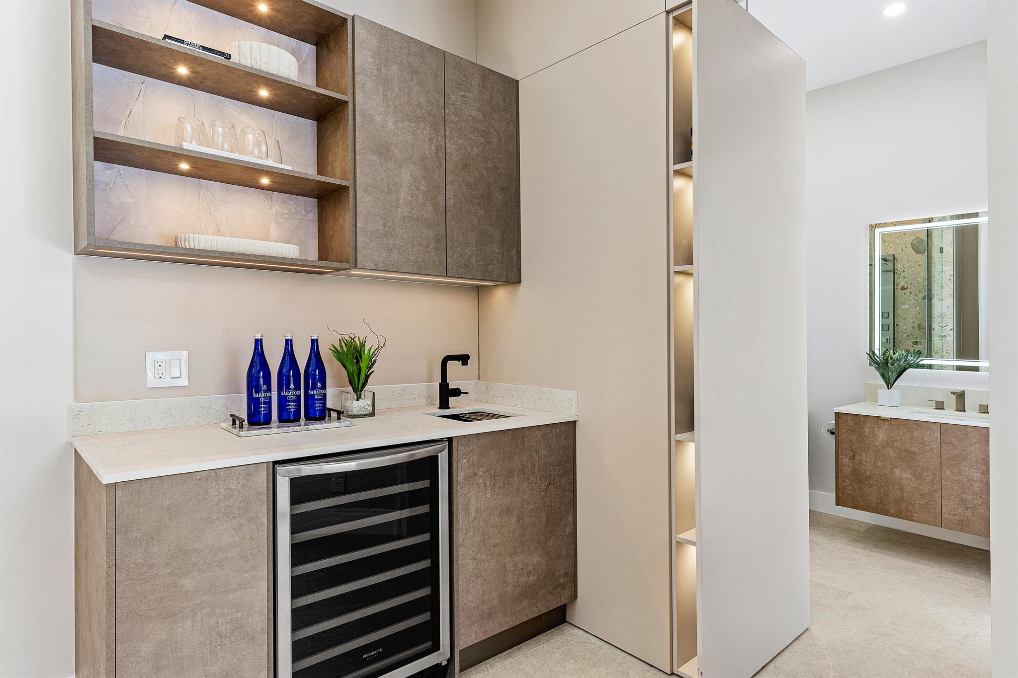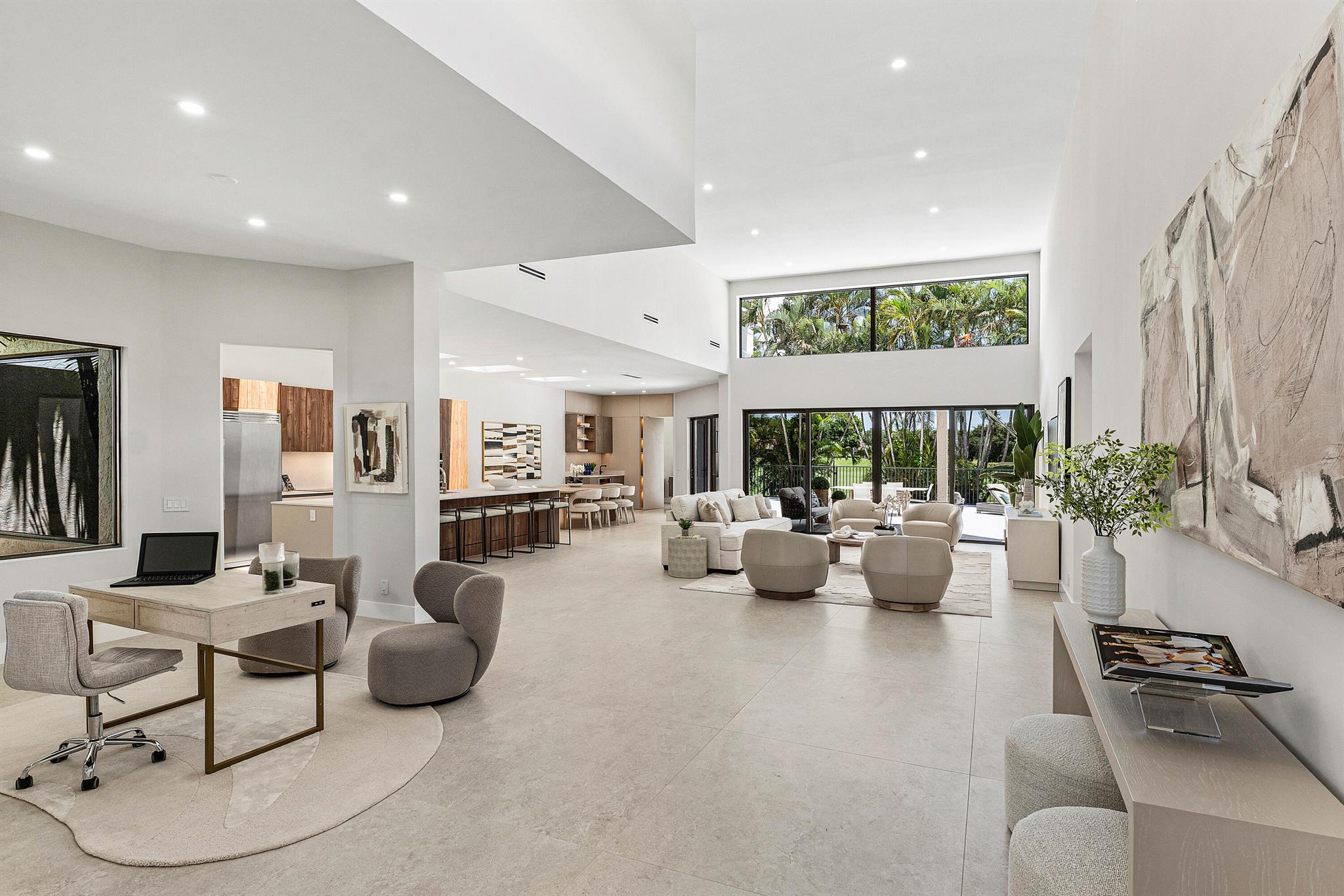 Welcome to this beautifully brand-new, reimagined residence, where refined design meets everyday comfort. A calm, neutral color palette with organic textures and tones flows seamlessly throughout, creating a serene and cohesive aesthetic. The spacious living room captivates upon entry, with soaring ceilings that amplify the sense of openness and natural light. Designed with modern living in mind, the home features true open-concept sightlines that effortlessly connect the living areas. The kitchen is a showcase of craftsmanship and functionality, featuring leathered Dekton countertops, premium appliances, and custom Ecuadorian cabinetry that offers ample storage. The adjacent dining room is an ideal space for entertaining guests, featuring a stylish wet bar. A cleverly concealed pivot