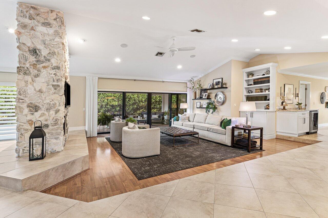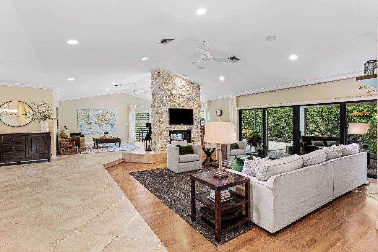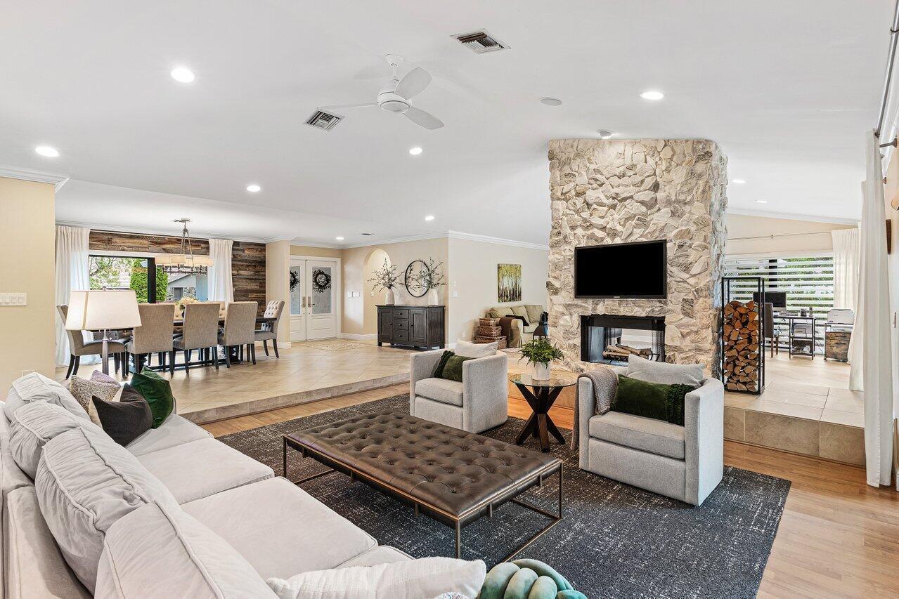 Welcome to Woodfield Hunt Club-one of Boca Raton's most prestigious gated communities, where timeless elegance meets modern sophistication.This beautifully renovated 4-bedroom, 3-bathroom estate sits on an expansive corner lot and offers a thoughtfully designed split floor plan with spacious living areas, a cozy wood-burning fireplace, and refined finishes throughout. The light-filled primary suite, living room, and family room all open to the pool and yard, flooding the home with natural light and providing effortless access to the outdoor living spaces. Enjoy a designer kitchen with a generous breakfast area, along with formal and casual dining spaces and oversized secondary bedrooms. Outdoors, the separate pool and entertaining areas create the perfect setting for both relaxed