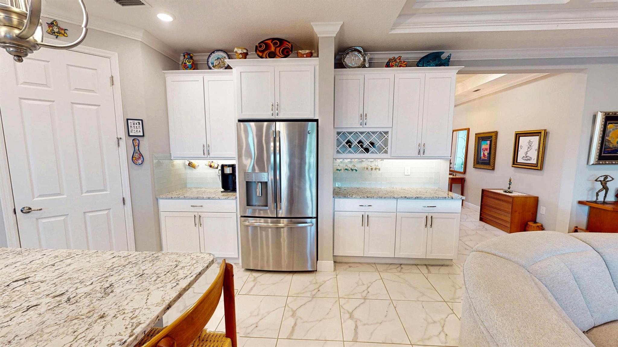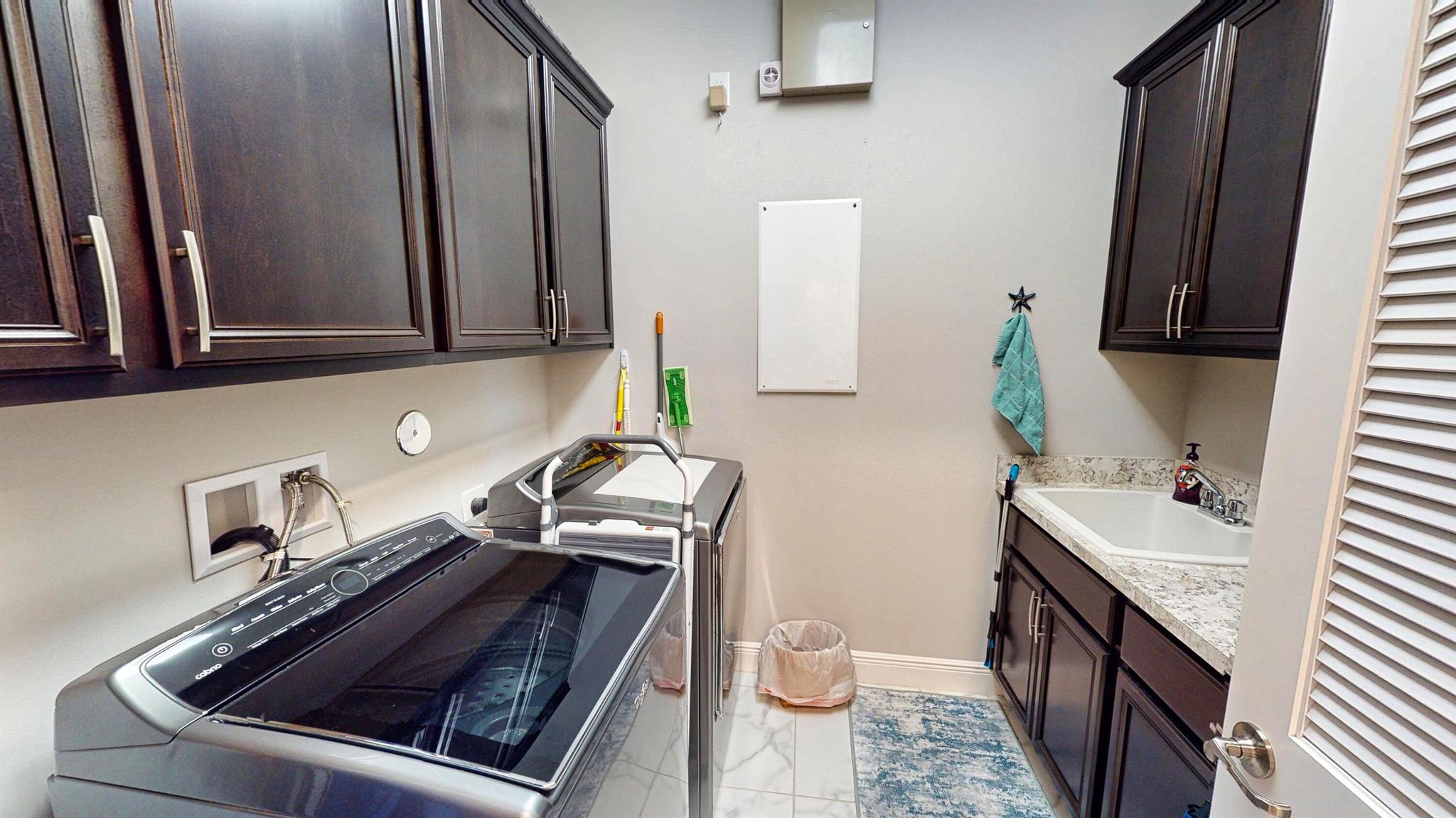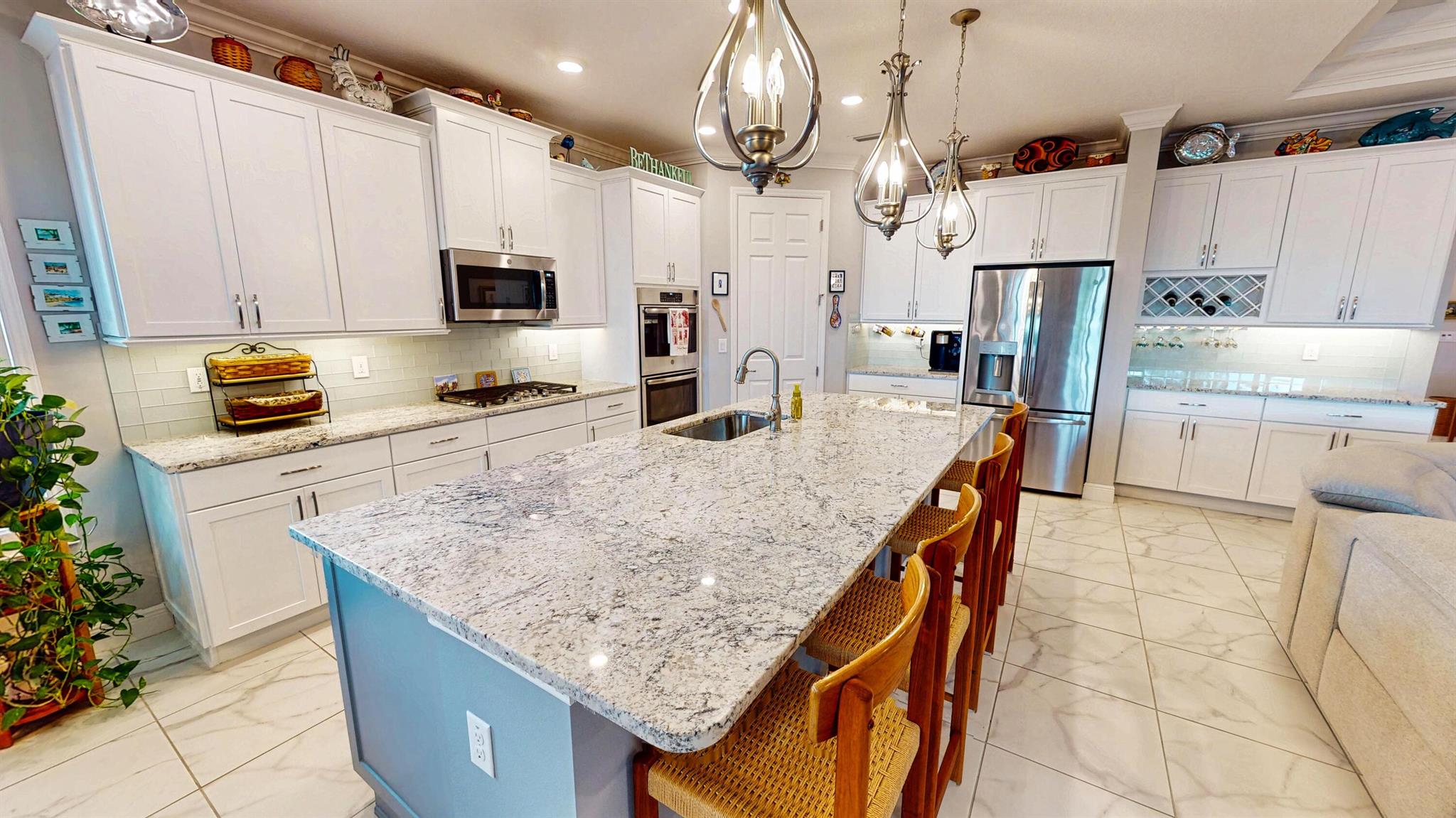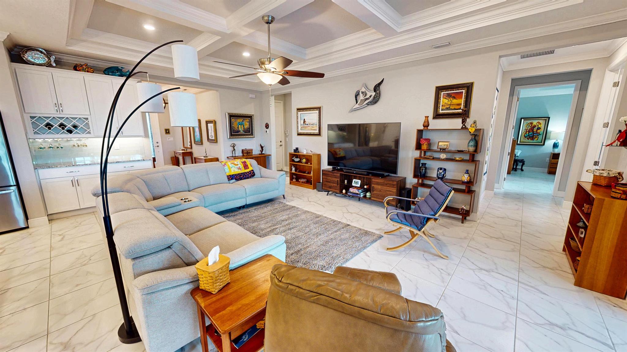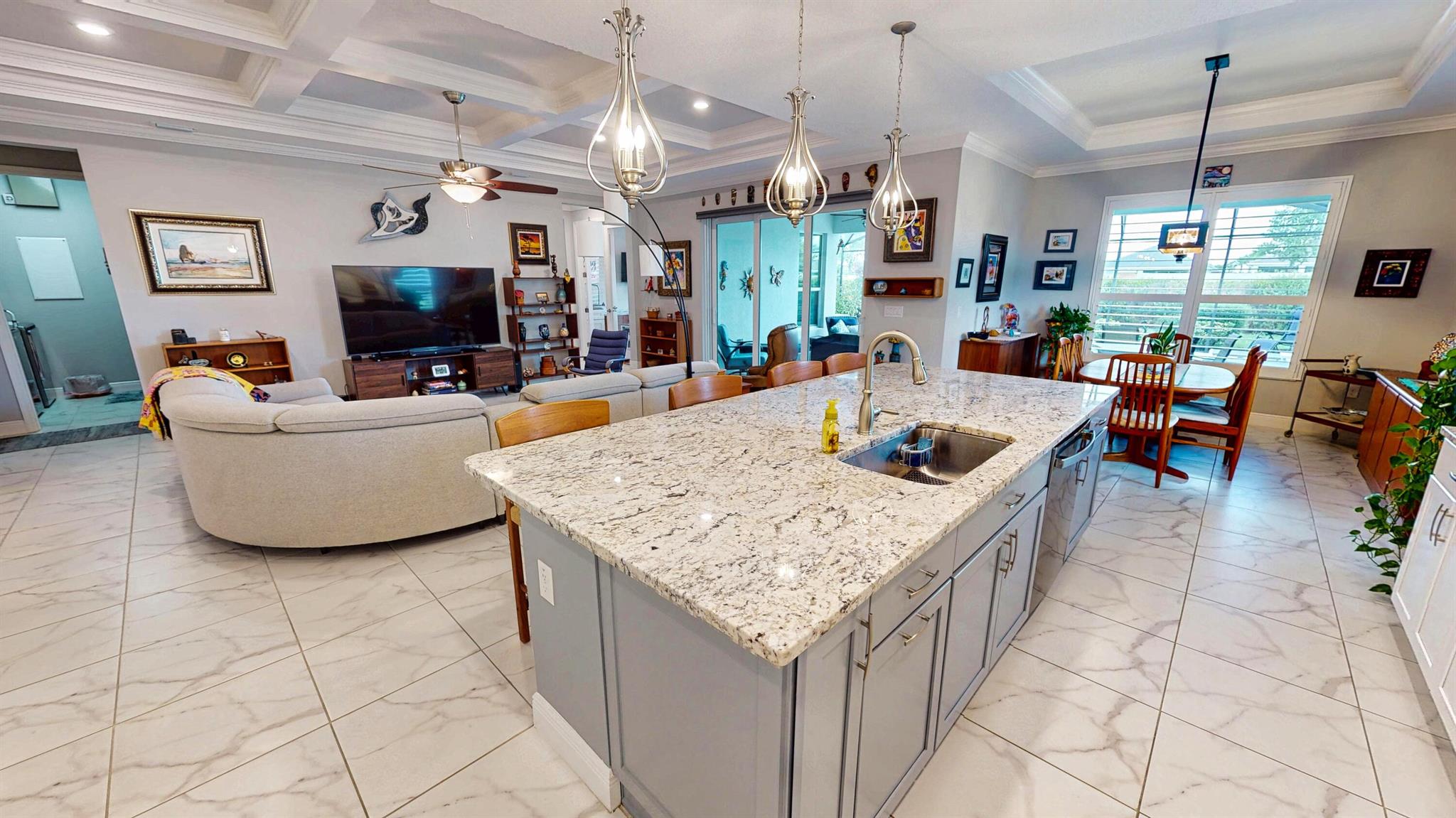 This beautifully upgraded 3-bedroom, 2.5-bath pool home with a den offers 2,446 square feet of elegant living space and includes a fully extended garage plus a golf cart garage. From the moment you enter, you'll appreciate the high-end finishes, including plantation shutters, stunning tile flooring, tray ceilings, crown molding, and impact windows, all under a durable tile roof. The spacious open-concept family room flows seamlessly into a gourmet kitchen featuring a large center island, dual wall ovens, a gas cooktop, and plenty of cabinetry--ideal for entertaining and daily living. The oversized master suite is a true retreat, complete with dual walk-in closets, his-and-her sinks, and a luxurious walk in shower.
