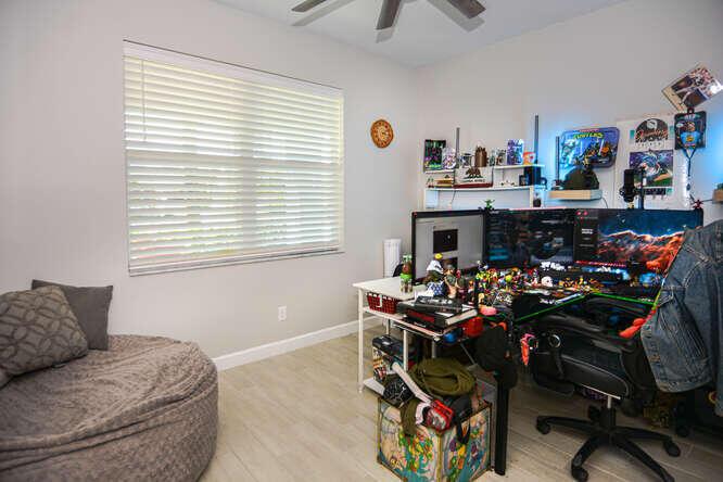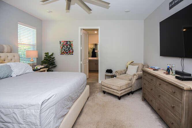 Stunning 5-Bedroom Home in the Highly Sought-After Community of ArdenWelcome to this beautifully maintained 5-bedroom, 3.5-bathroom home located in the desirable, amenity-rich community of Arden. Thoughtfully designed with both comfort and style in mind, this home features a spacious owner's suite conveniently located on the first floor, along with a versatile office/den.Enjoy elegant tile flooring throughout the main level, plush carpet upstairs, and high-end finishes including quartz countertops, crown molding, and an abundance of kitchen cabinetry. Impact-resistant windows provide safety and peace of mind, while the fully fenced backyard offers privacy and space for outdoor living.