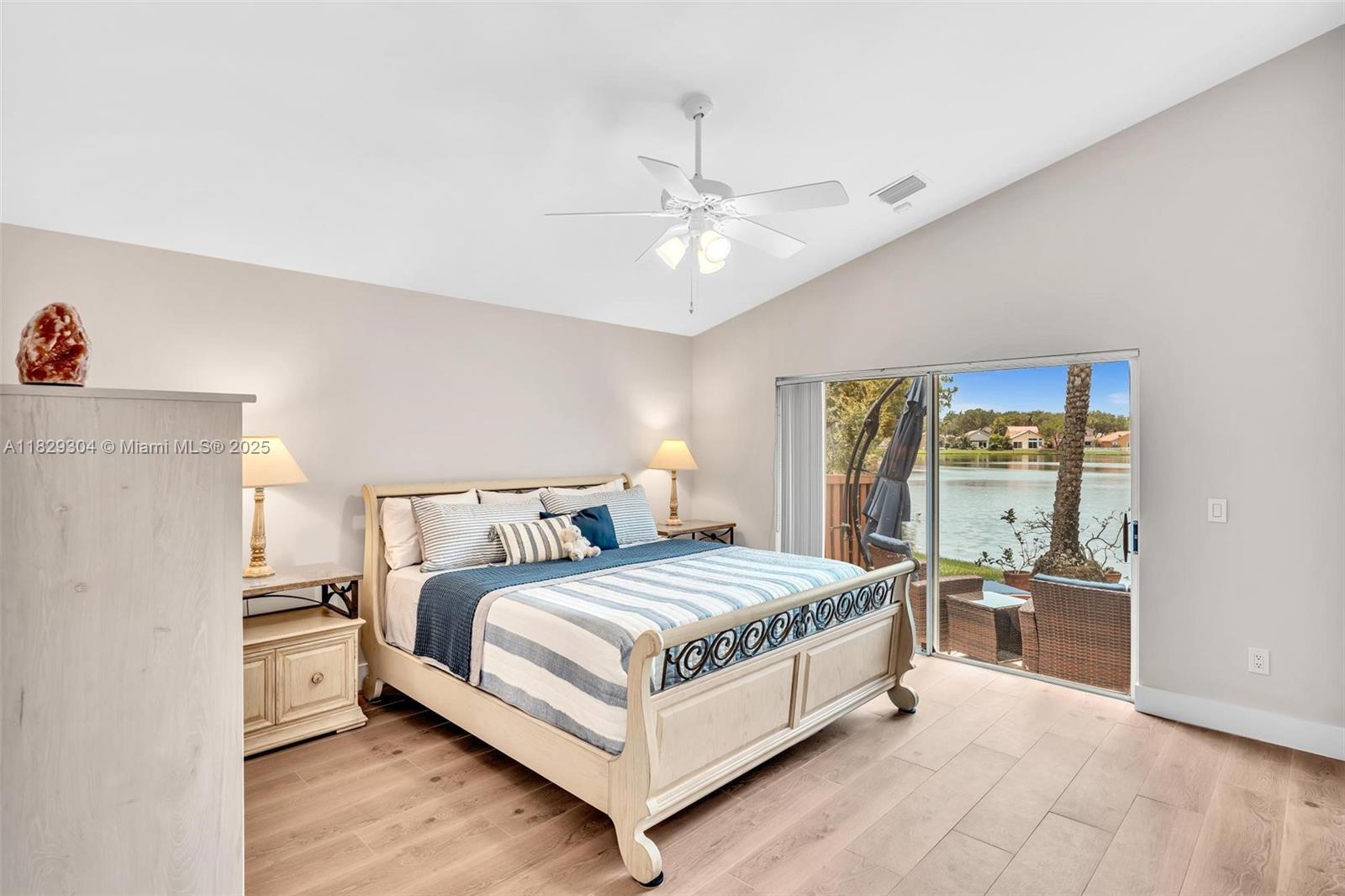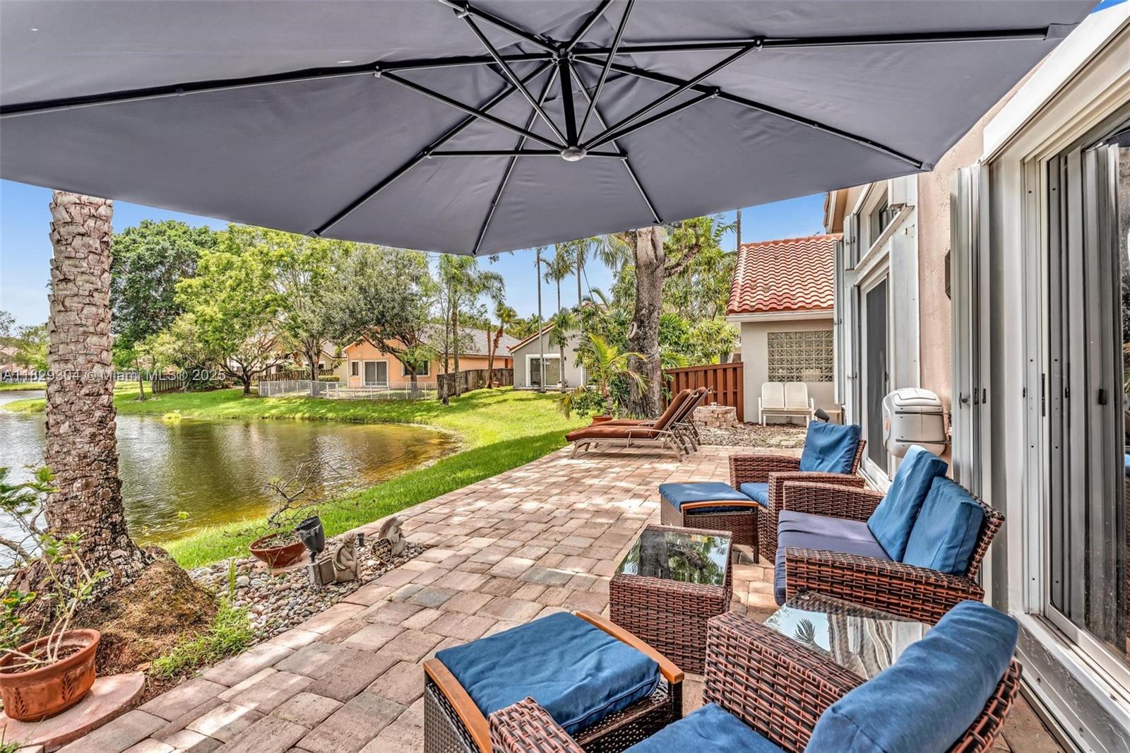 Stunning Waterfront home in Gated Community! Discover this exquisite single-story 3/2 split bedroom floorplan w/2 car garage in Sunset Cove- a prestigious gated comm. with 24/7 manned Security. Perfectly positioned on the coveted Central Park lake. It has breathtaking water views ideal for discerning buyers seeking elegance & tranquility. Inside, experience a bright, airy ambiance, high ceilings & abundant natural lighting streaming thru expansive windows. Every detail of this home exudes sophistication. Features all new porcelain tile, new AC, new copper pipes, full house water filtration system, spa style bath, solar hot water, Shutters, freshly painted, brick paver hardscaping, exotic plants & much more. Prime location, water views & many upgrades make it a rare gem! Sched appt today!