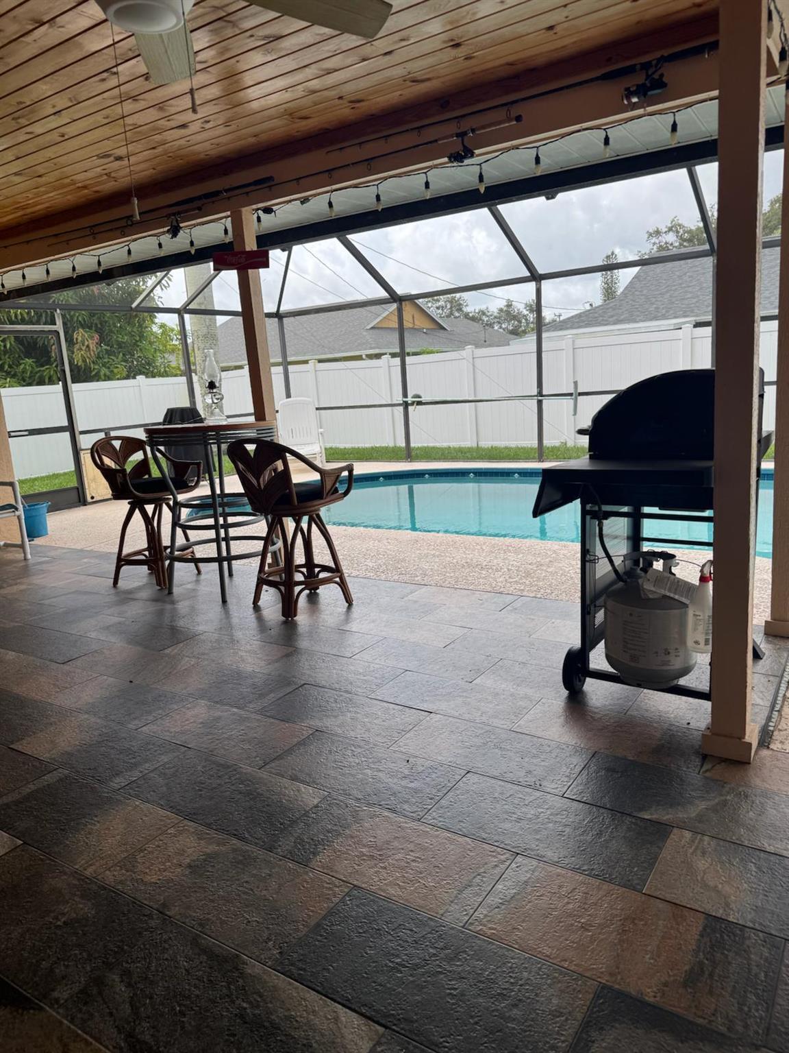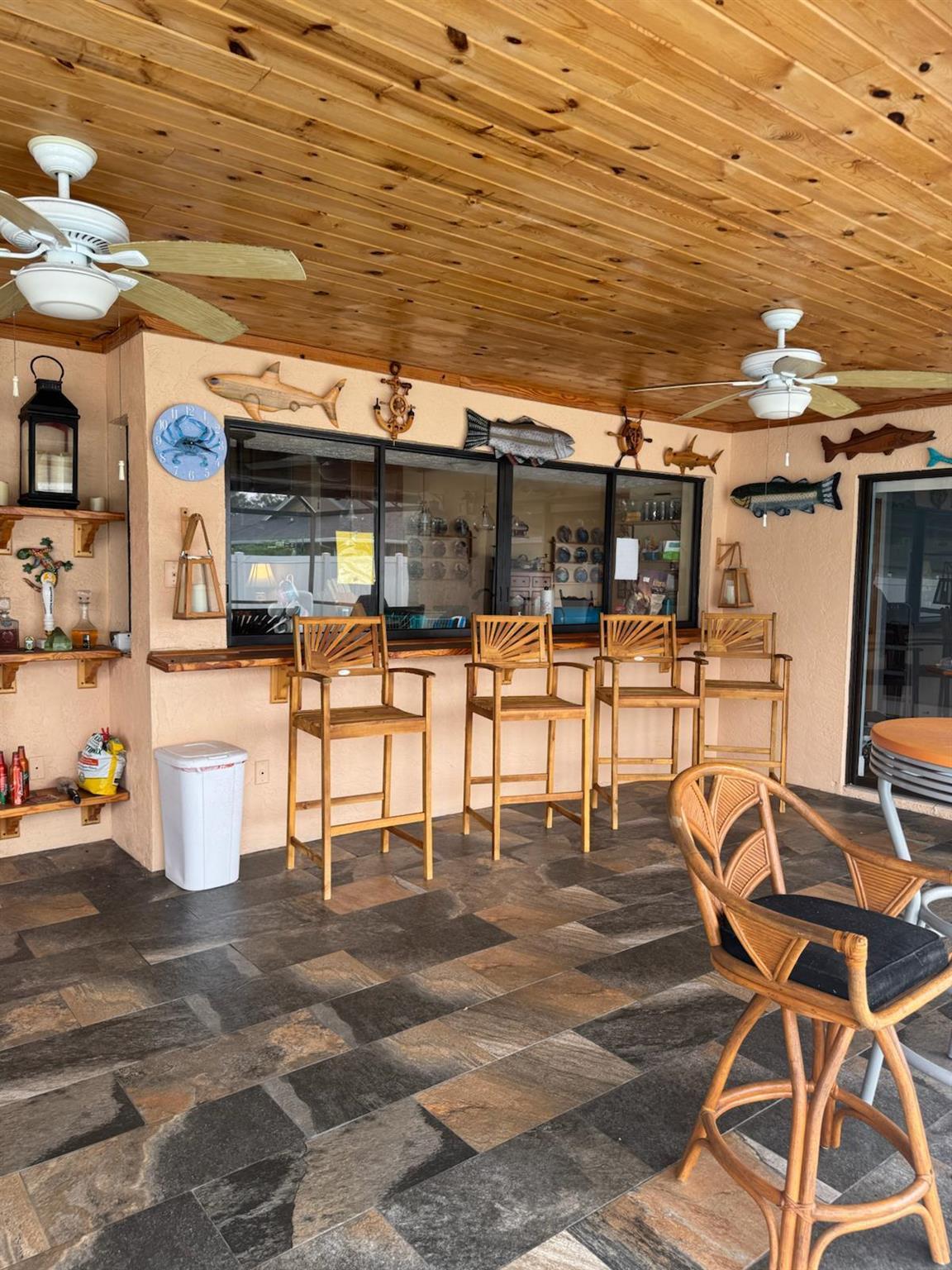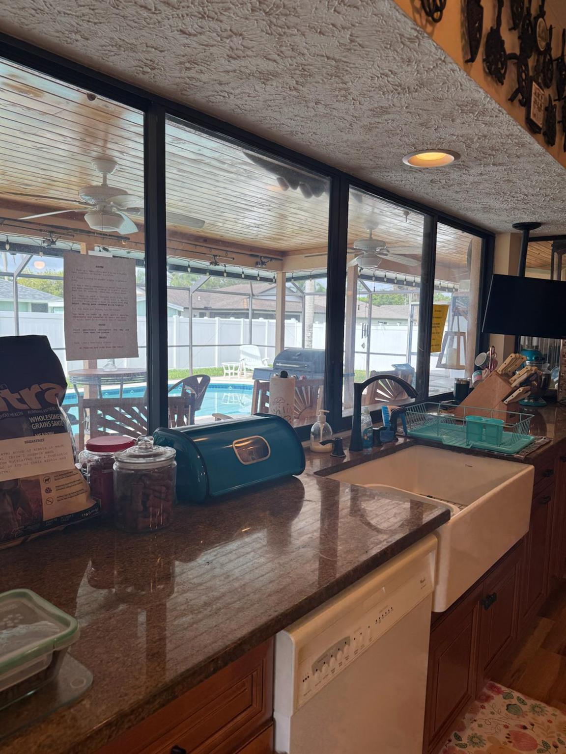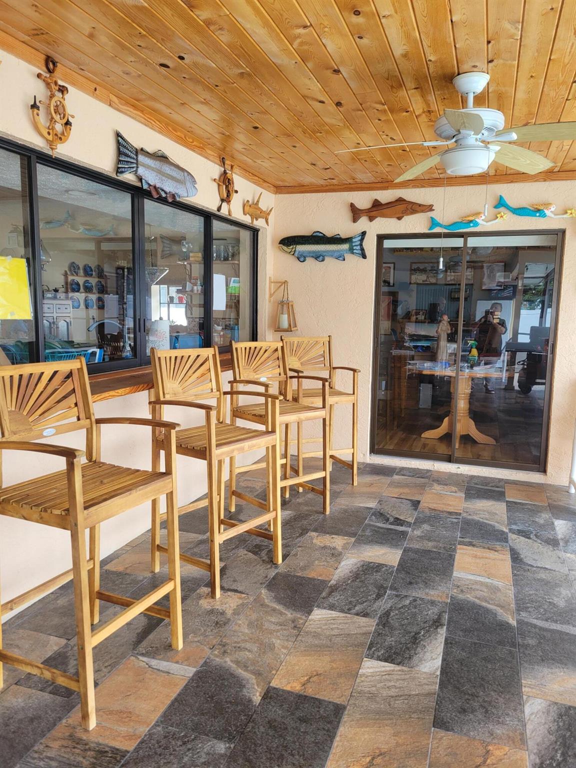 This original 4 bedroom home (now flex room) underwent interior and exterior renovations in 2019 and 2025. New paint, new roof and gutters, remote controlled skylights, extra hurricane straps and blown in insulation, newer water htr, luxury vinyl plank flooring. Kitchen cabinet with soft close doors/drawer and roll out trays, 7 ft island with granite counter tops thru-out, 9 & 7 ft pantries, copper/bronze faucet, pot filler, pendant lights, extra lrg farmhouse sink and new appliances. Lrg pass thru window over the sink convenient to the gorgeous lanai, sliders from living to lanai that pocket, new tile floor and tongue in groove ceiling. Custom bar counter top and shelving make the ideal party zone. Generac generator, buried propane tank. Lrg renovated pool with cool deck and caretaker