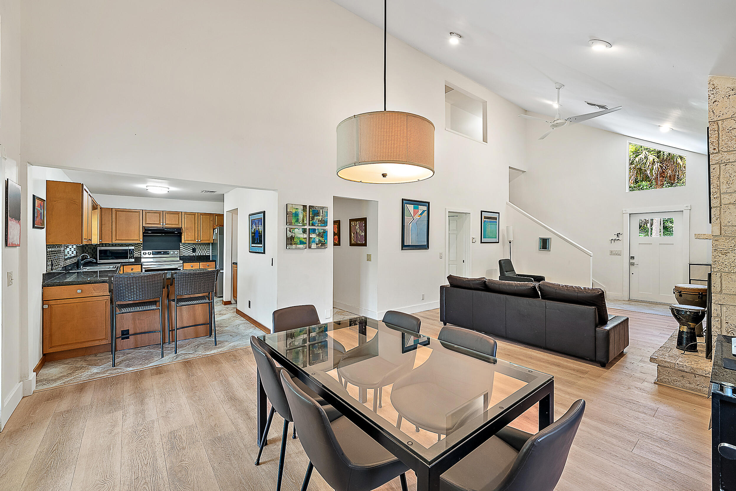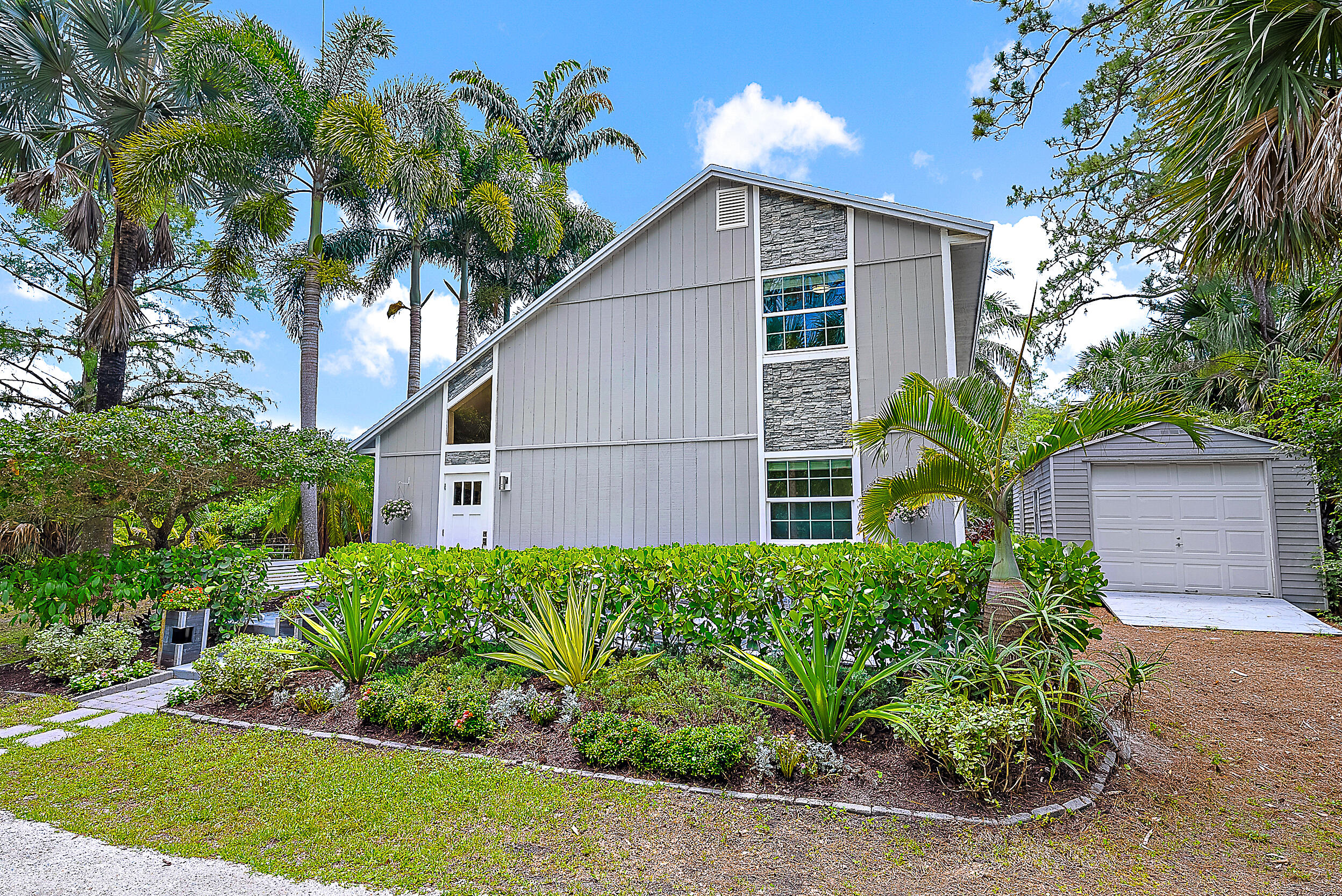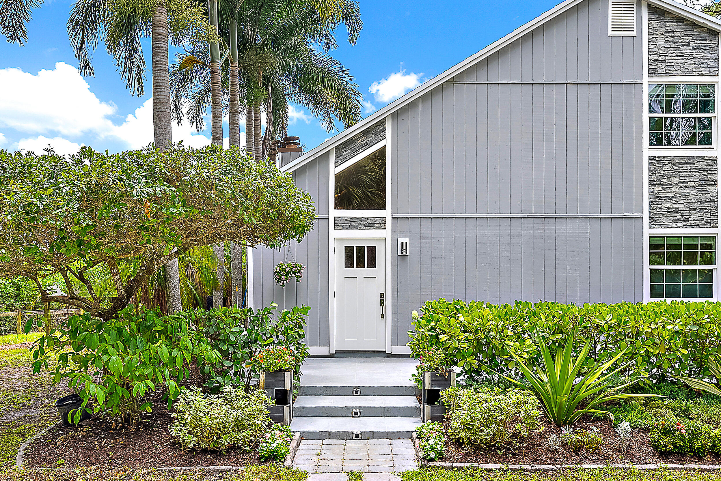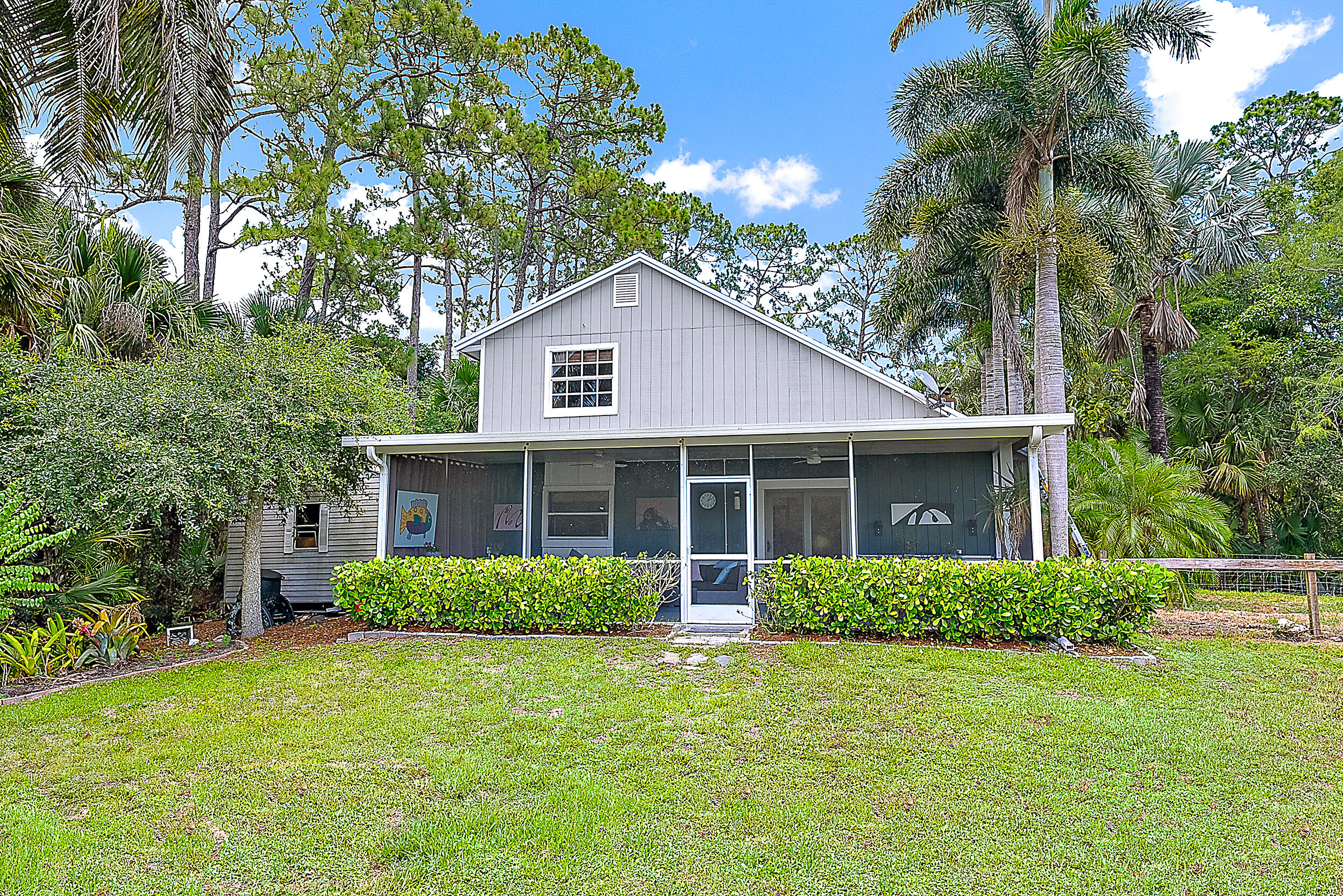 Tucked away on a paved road on the desirable east side of Jupiter Farms, this property offers privacy, space, and flexibility, with a new roof completed in June 2025. The backyard provides room to roam, and the pole barn can be used for animals, storage, or hobbies. A large screened-in patio offers a peaceful space to relax or entertain. There's also a detached workshop with electricity for projects or equipment.Inside, the great room is airy, anchored by a floor-to-ceiling Coquina stone fireplace. The main level includes the kitchen, dining, and living space, one bedroom, a full bathroom, and laundry. Upstairs are two additional bedrooms and another full bath.Zoned for top-rated schools and situated in a peaceful setting with paved road access, this Jupiter Farms location offers