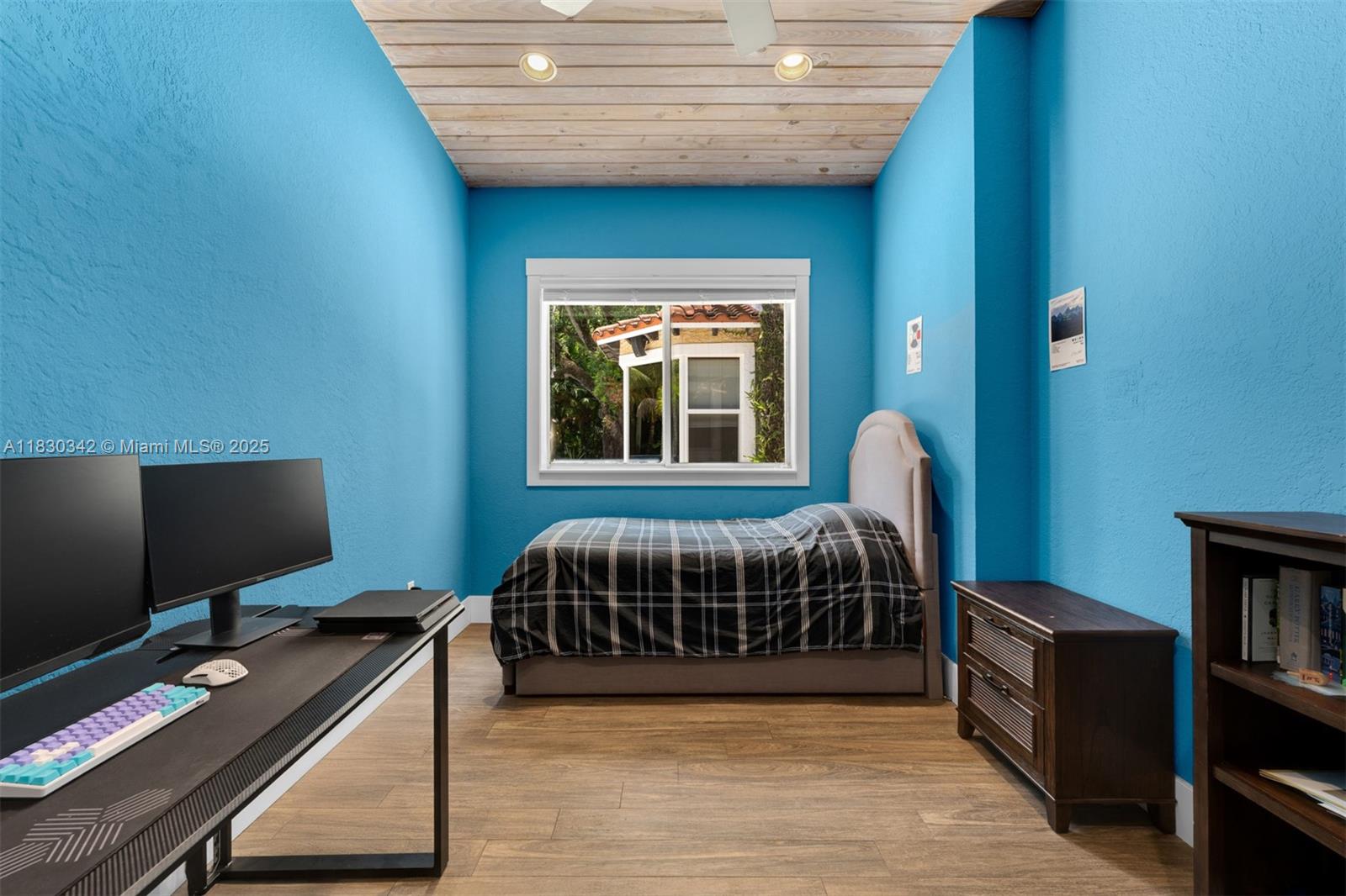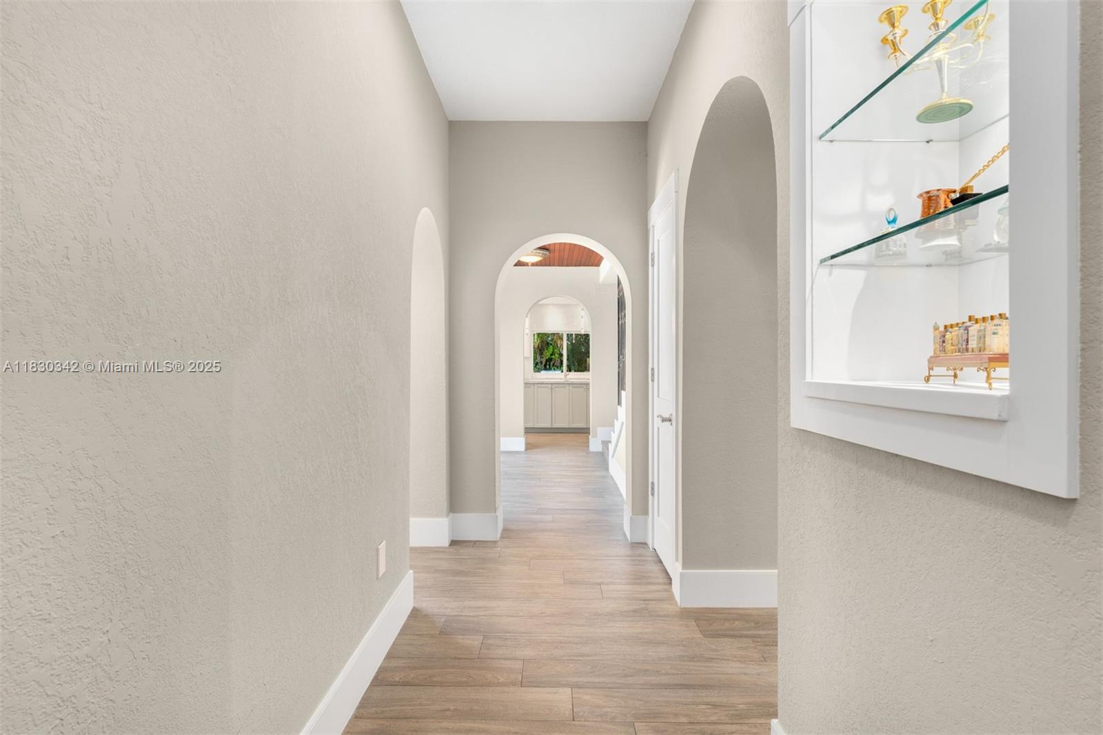 Stunning Mediterranean Revival home with ivy-covered facade on a tree-lined street in Pinecrest. This romantic estate features balconies and porches with balustrades, 6 beds, 5.5 baths including a service room. Renovated with porcelain floors, impact windows, resurfaced pool, and new clay barrel tile roof. The kitchen offers marble counters, wood cabinetry, Wolf/Subzero appliances, and a wine cellar. Breakfast area with bay window overlooks the pool/spa, lush palms, and fire pit. Upstairs primary suite has a dual shower, soaking tub, and walk-in closet. Formal living room with wet bar and wood-burning fireplace.