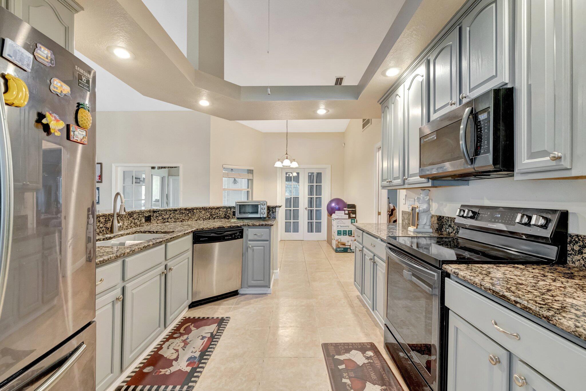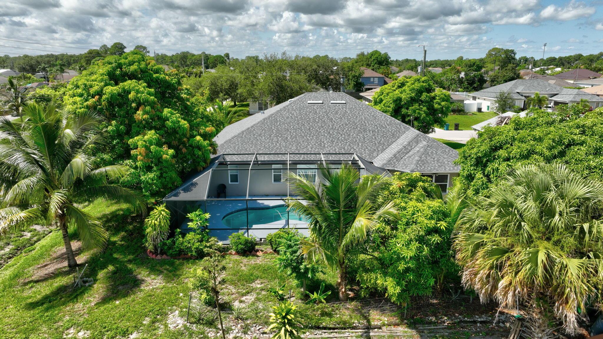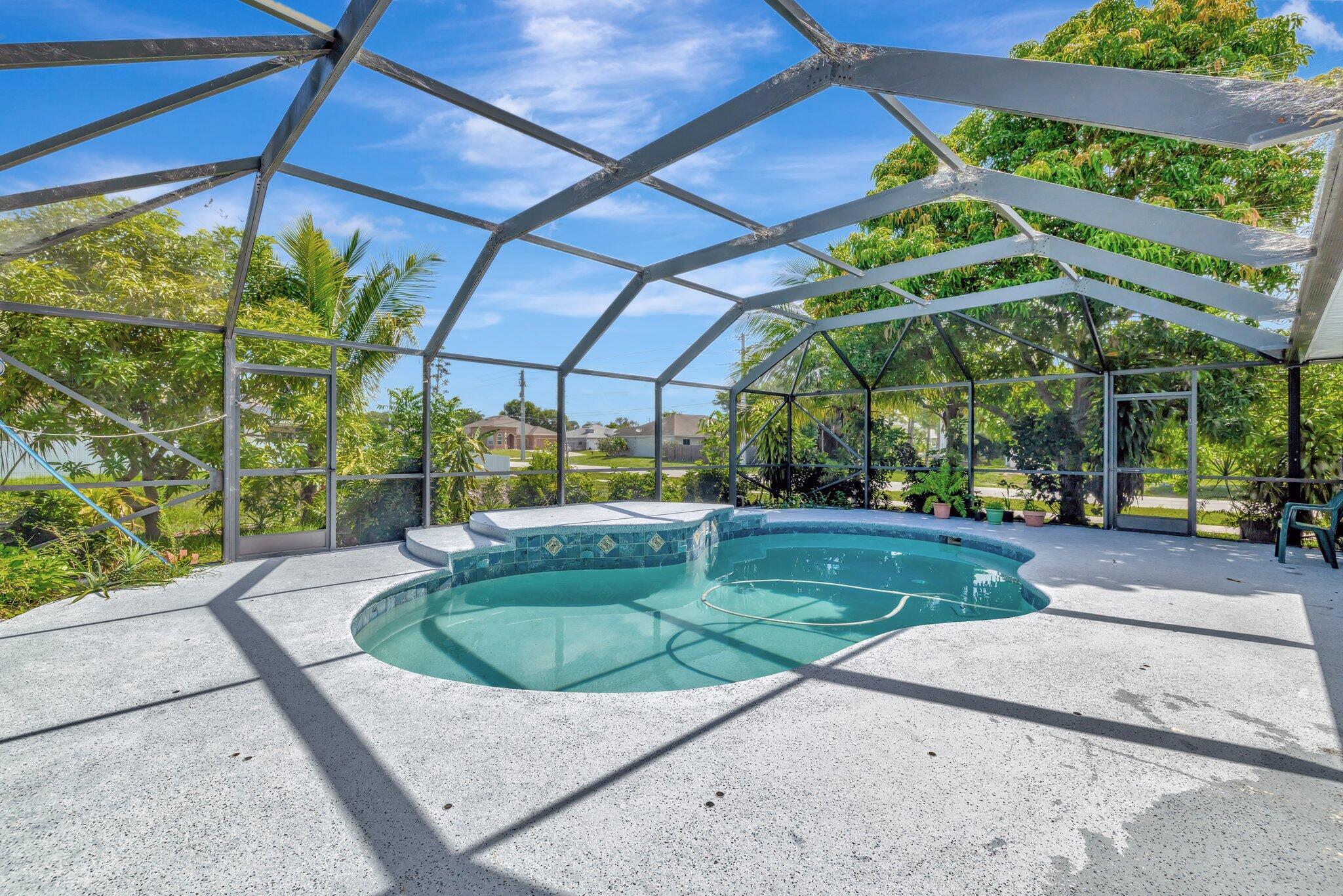 Take a look at this lovely Pool Home 4 bedroom 3 bath 2 car garage with a den home located in the Treasure Coast community. New roof, newer AC and water heater, The primary suite features high ceiling, sliding doors leading to enclosed patio which can be used as an office., walk-in closets. Primary bathroom includes a large wall in shower, new soaking jacuzzi tub, and dual vanity sinks. Large bedroom in the back which gives you privacy with a pocket door enclosure including bathroom. This home also offers a formal dining area, The kitchen included stainless steel appliances, new cabinets, granite counter tops, separate laundry room, shed in yard for storage