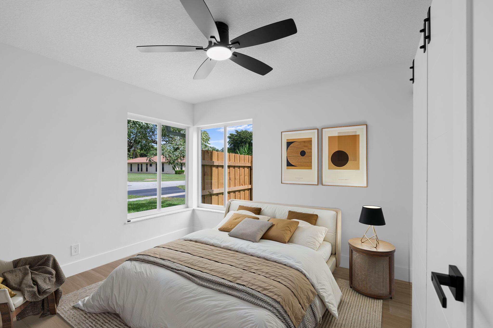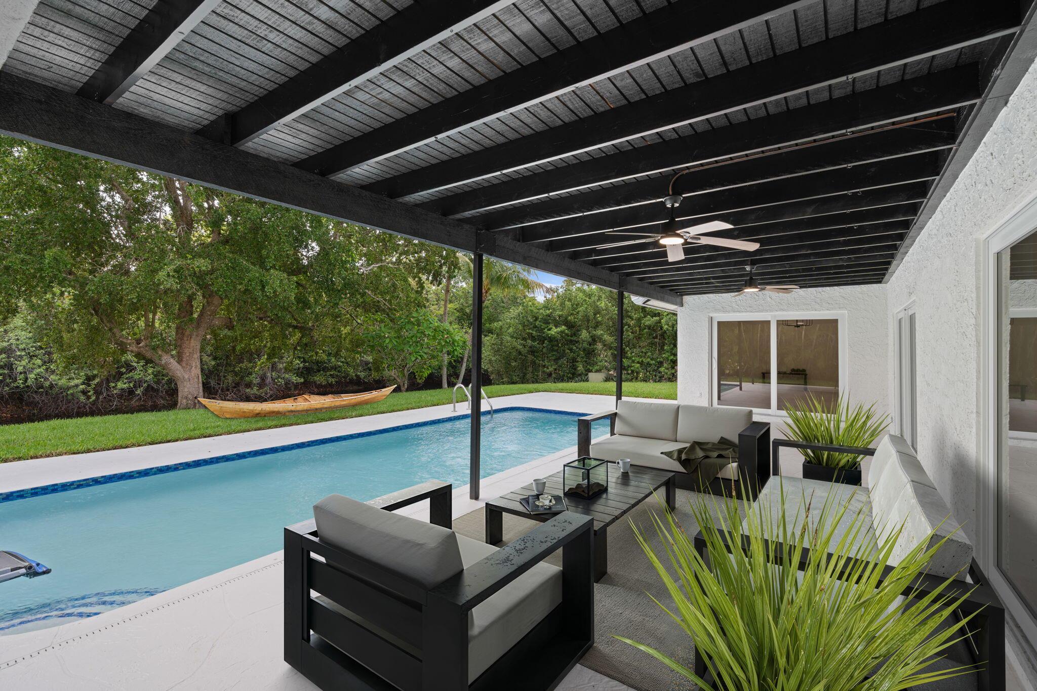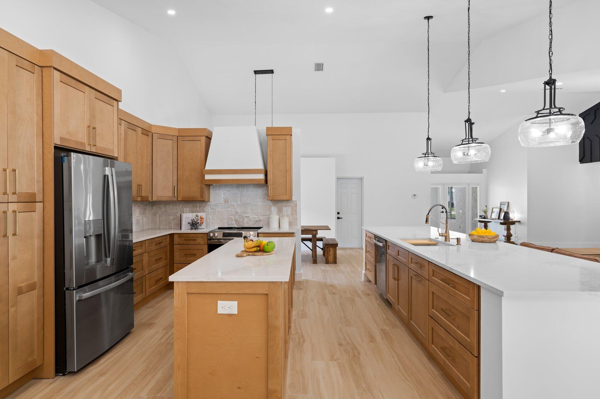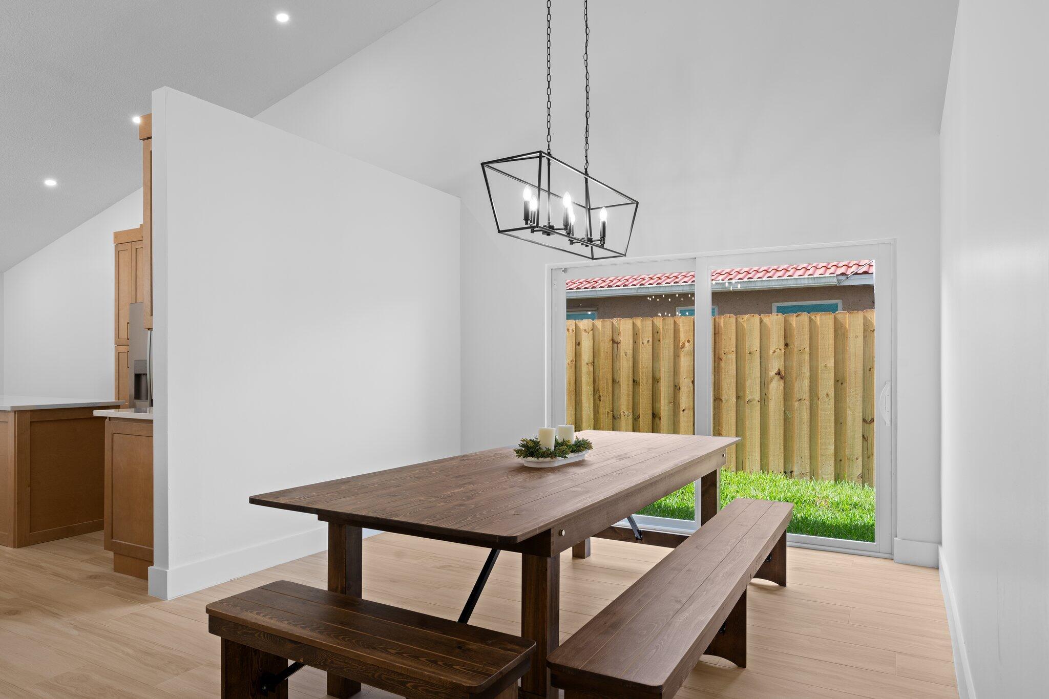 Step into elevated living with this stunning designer home in the sought-after Loggers Run community of West Boca Raton. This beautifully remodeled residence features vaulted ceilings, wide plank porcelain tile, a custom pine accent wall, and an abundance of natural light that creates a warm and inviting atmosphere.Enjoy peace of mind with FULL impact windows and sliders, a newer roof (2018), brand-new AC (2025), new water heater (2025), and a resurfaced pool (2025)--perfect for relaxing or entertaining. The show-stopping kitchen boasts custom cabinetry, quartz countertops, an Italian stone backsplash, and solid wood doors throughout the home.Both bathrooms have been fully renovated with elegant, designer finishes.