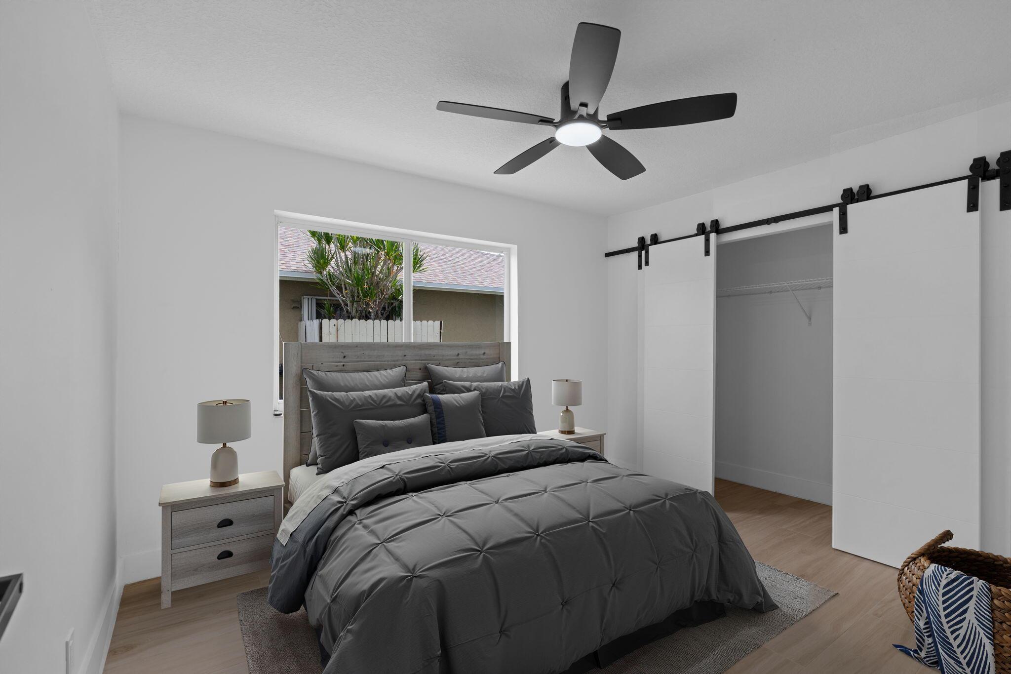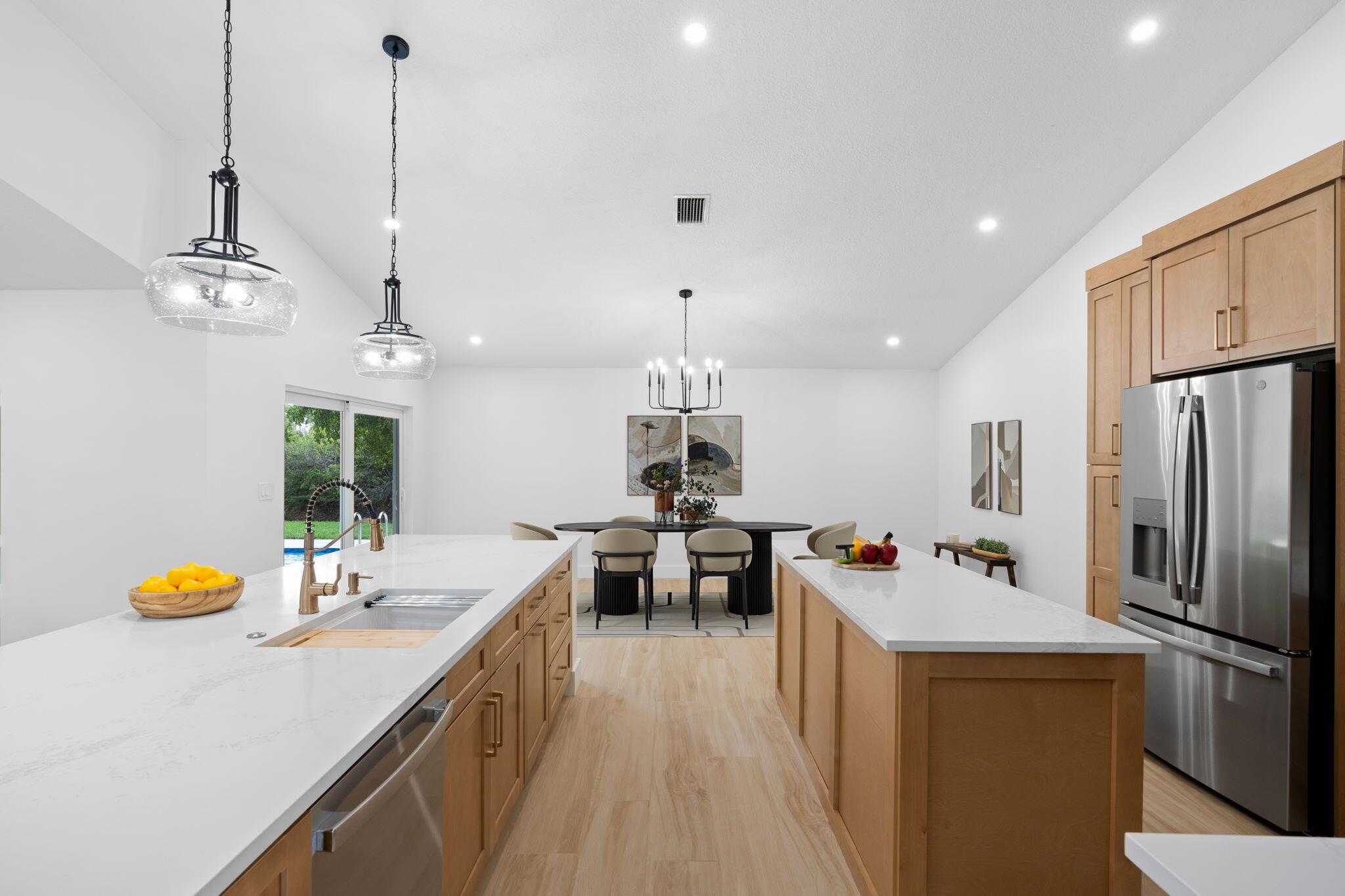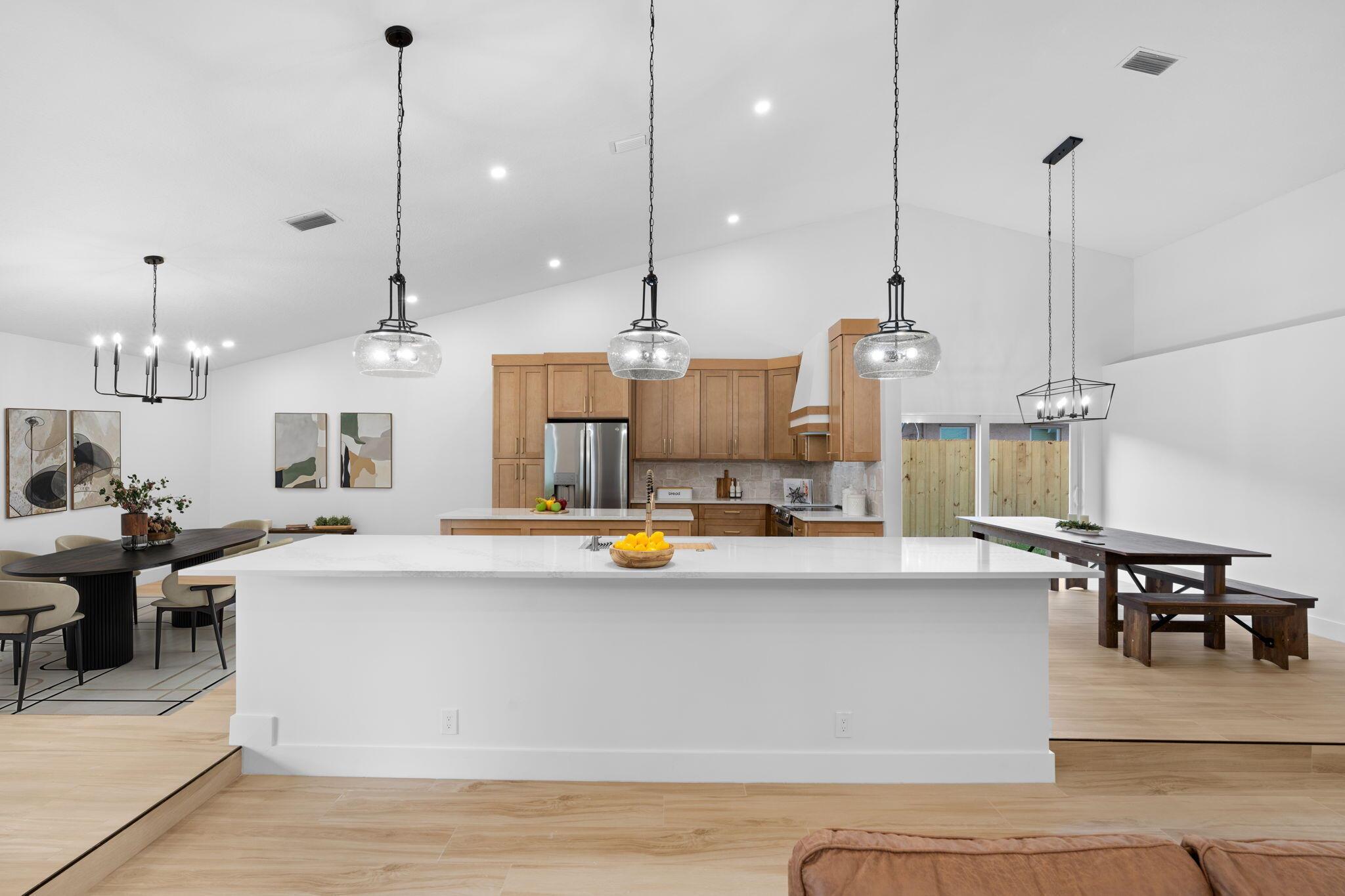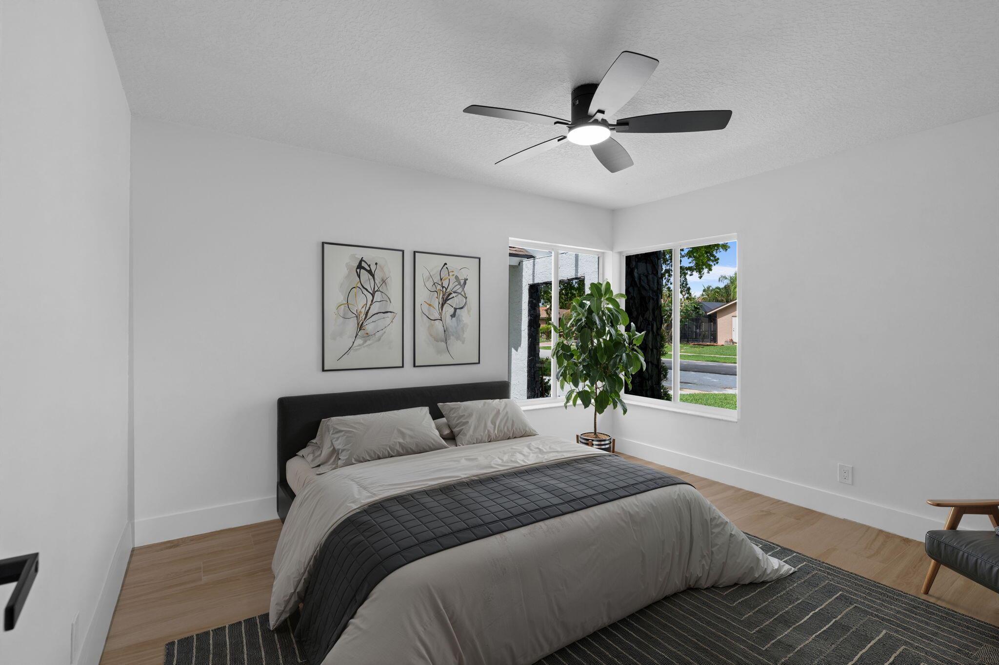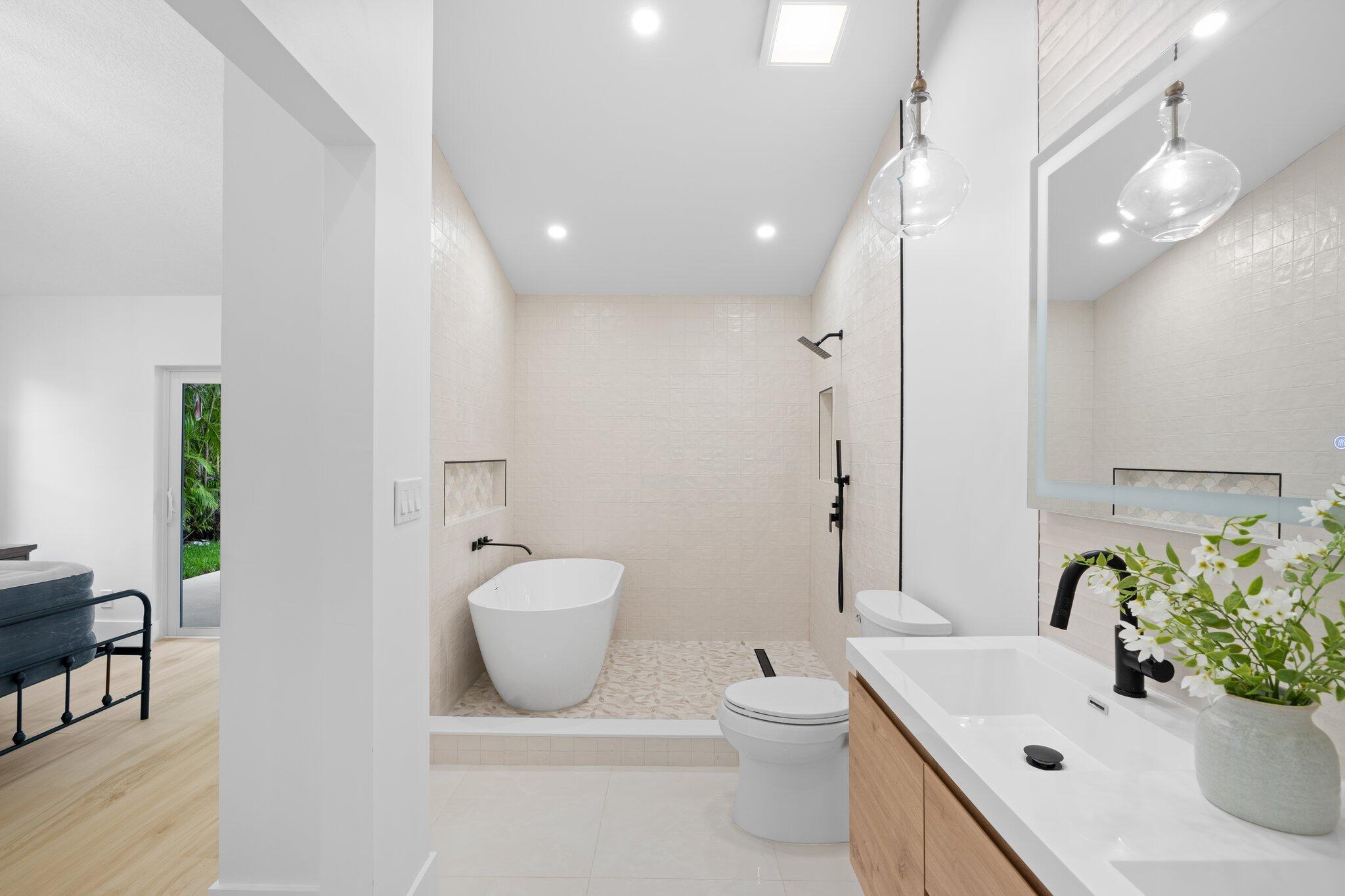 Step into elevated living with this stunning designer home in the sought-after Loggers Run community of West Boca Raton. This beautifully remodeled residence features vaulted ceilings, wide plank porcelain tile, a custom pine accent wall, and an abundance of natural light that creates a warm and inviting atmosphere.Enjoy peace of mind with FULL impact windows and sliders, a newer roof (2018), brand-new AC (2025), new water heater (2025), and a resurfaced pool (2025)--perfect for relaxing or entertaining. The show-stopping kitchen boasts custom cabinetry, quartz countertops, an Italian stone backsplash, and solid wood doors throughout the home.Both bathrooms have been fully renovated with elegant, designer finishes.