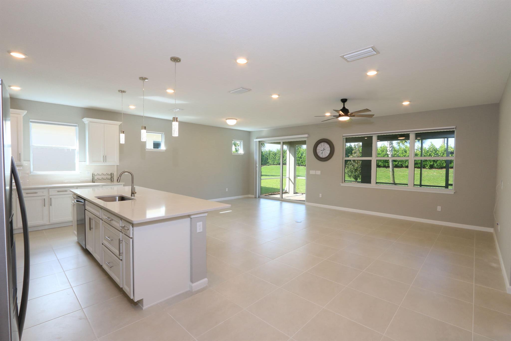 Lowest priced Palmary Model in Del Webb. Impact windows and doors. Wide Open Great Room. Huge, upgraded kitchen with Quartz countertops, White cabinets and tile backsplash. Lots of counterspace plus spacious walk-in pantry. This home is perfect for entertaining. Tile in the entire home. 8ft doorways. Master bath has large zero entry shower easy to enter. Big master walk-in closet. Flex room great for den or office. Screened patio overlooks private backyard. Active 55+ community with 2 clubhouses, 2 pools, pickleball, tennis, putting green, dog park, walking trail around the lake. Full time Lifestyle Director for lots of entertainment.