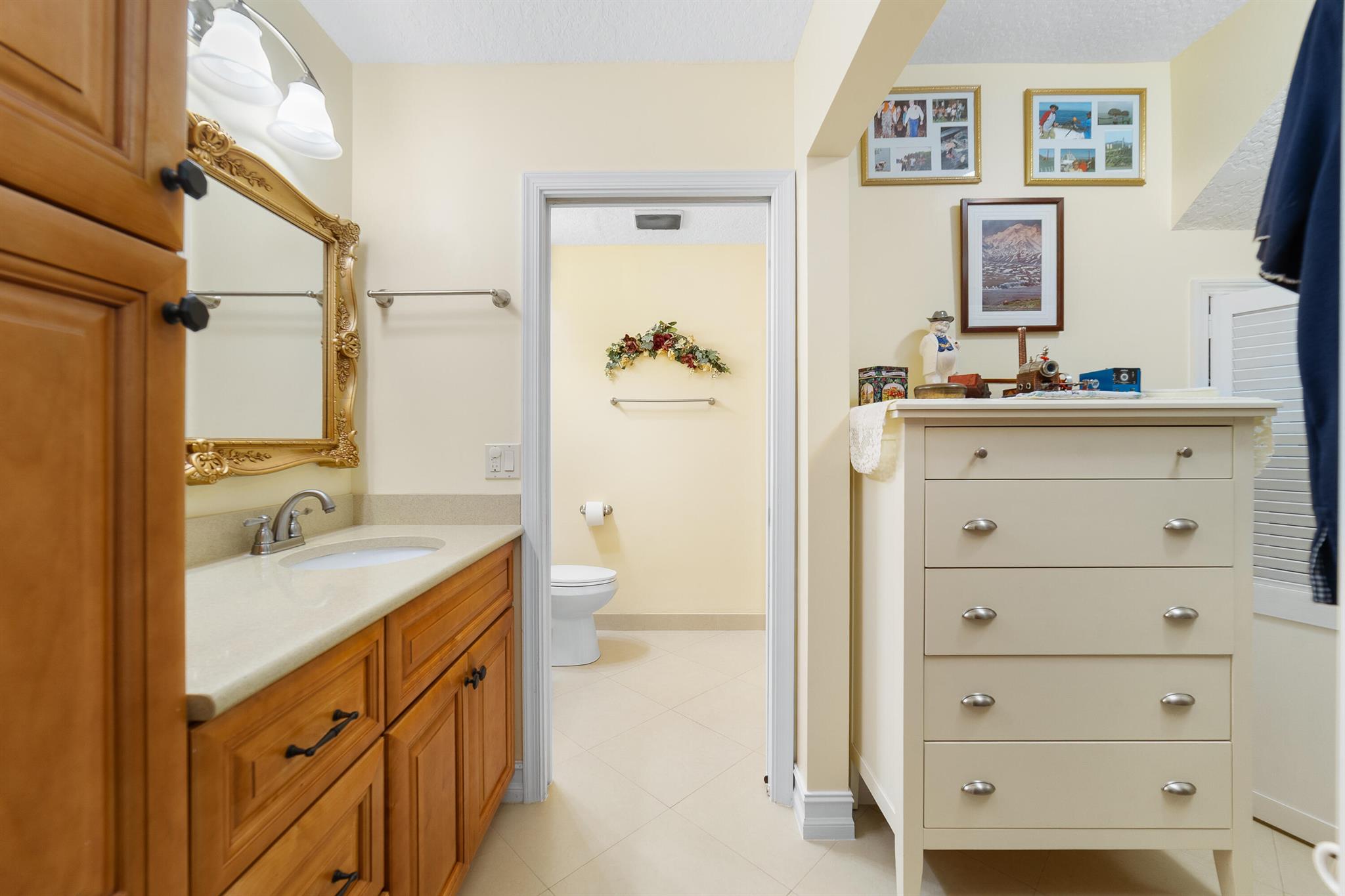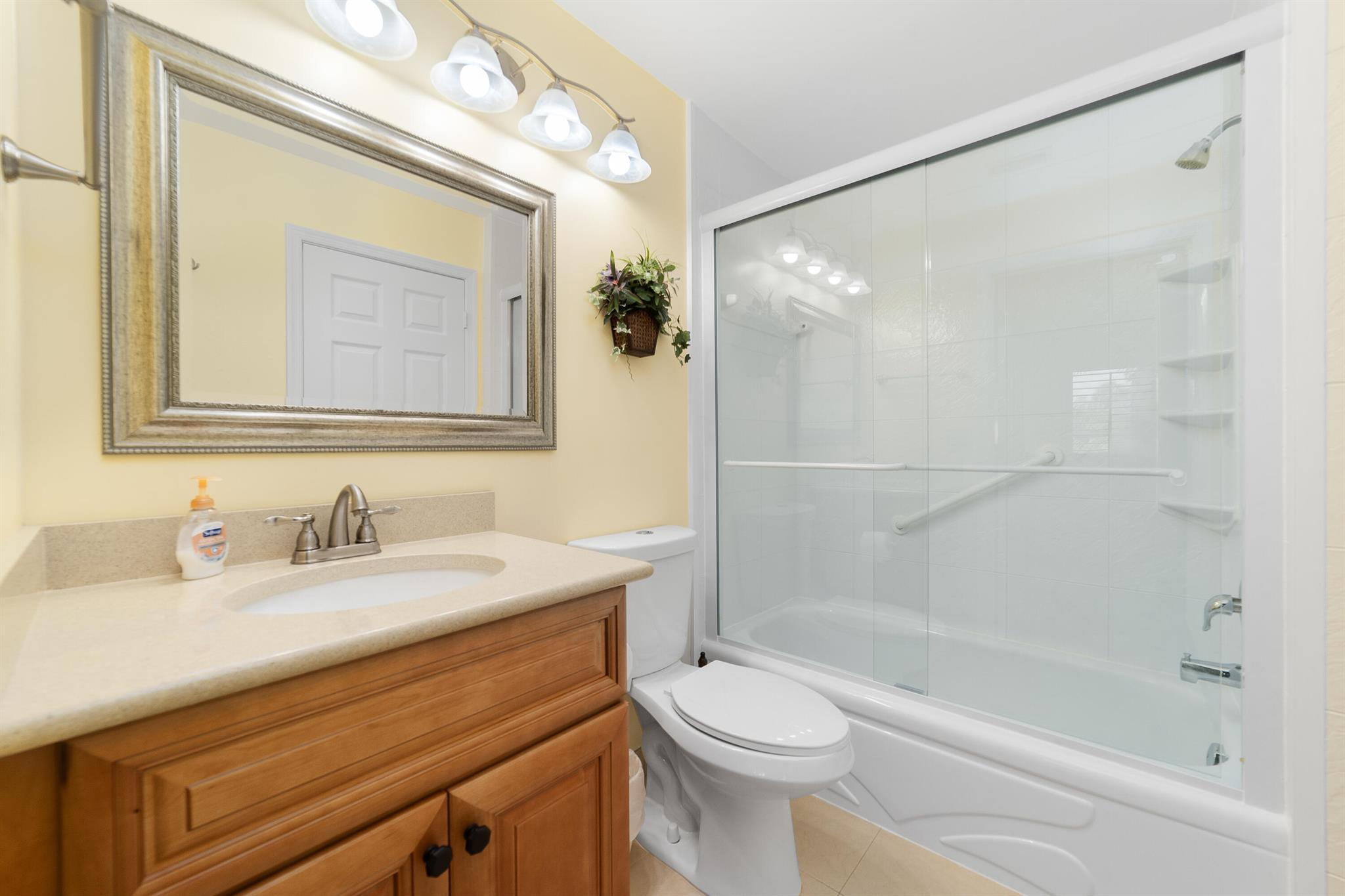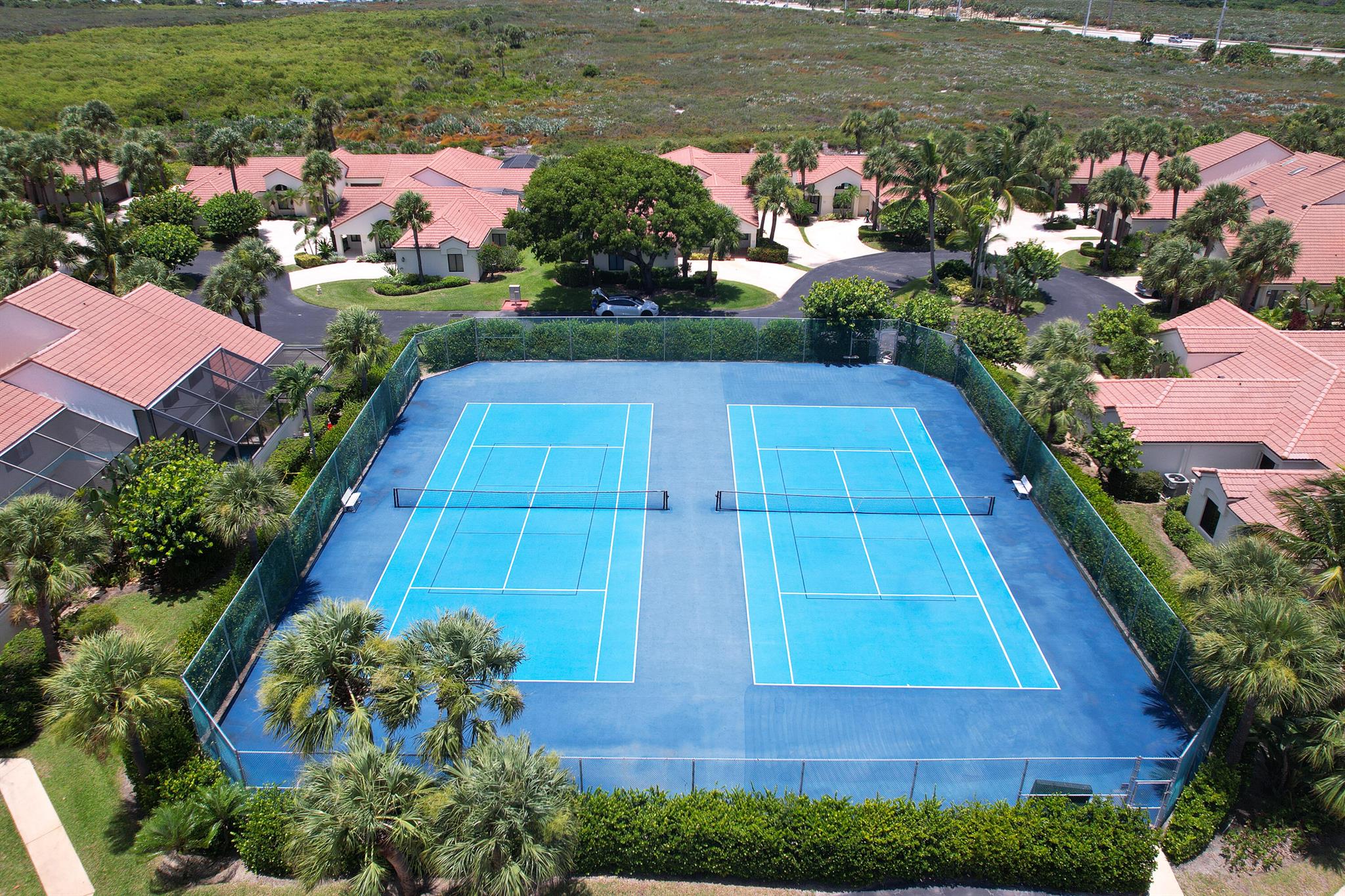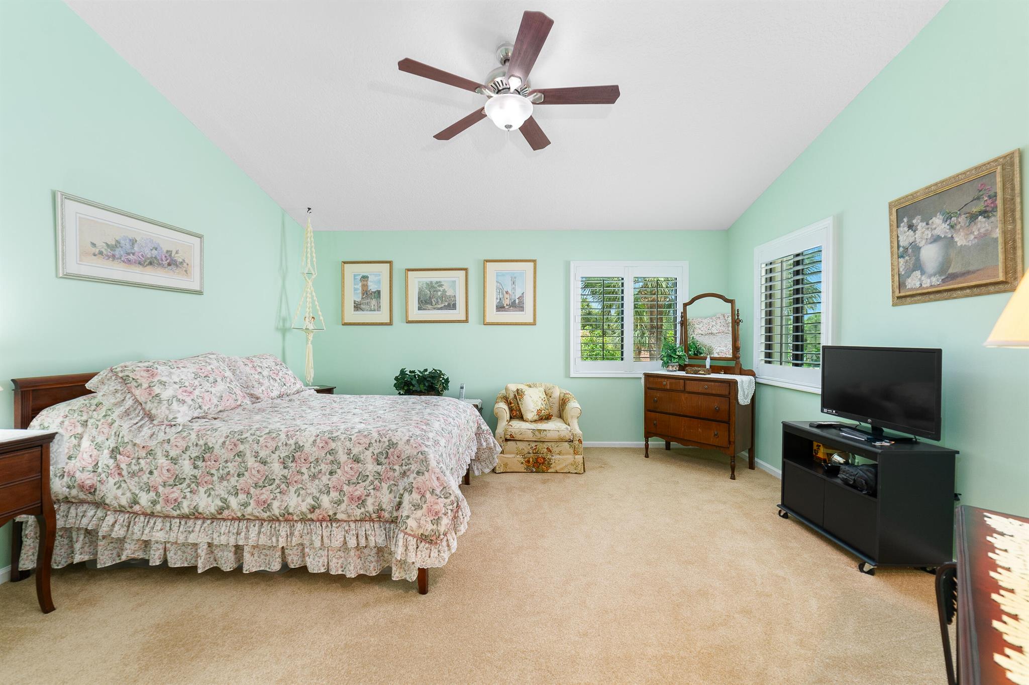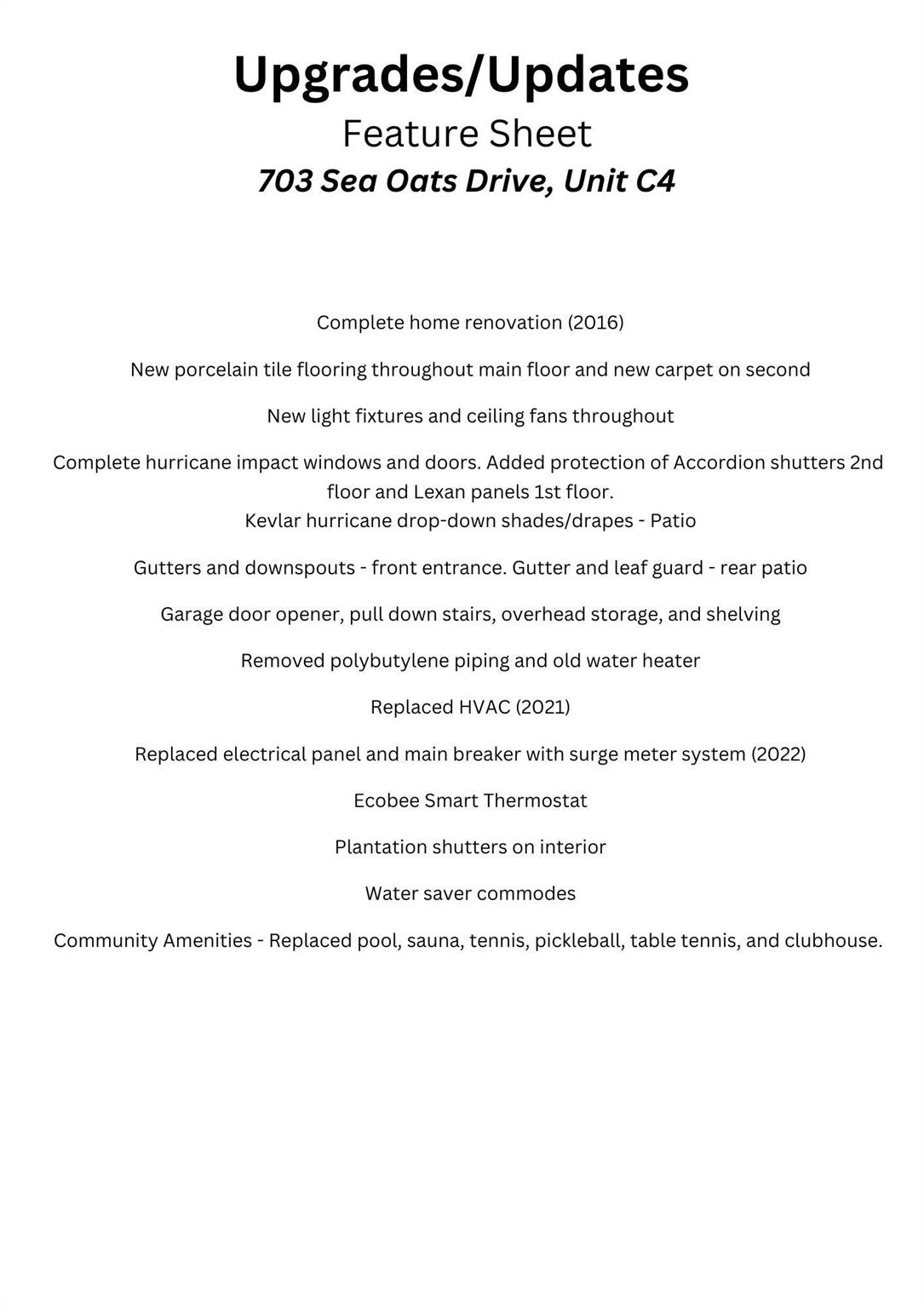 LOCATION, LOCATION, LOCATION!! MINUTES TO THE BEACH!! This beautifully maintained and thoughtfully upgraded residence offers a bright, open interior with vaulted ceilings, plantation shutters, and porcelain tile flooring throughout the main level, complemented by new carpet upstairs. A complete home renovation in 2016 included new light fixtures, ceiling fans, and the removal of polybutylene piping and the original water heater. The spacious layout features lofty two-story main-level living. Entry through the private courtyard which leads to an open floor plan that flows seamlessly to the rear screened patio and pool area with a privacy wall--ideal for both relaxing and entertaining. Additional upgrades include a new HVAC system (2021),