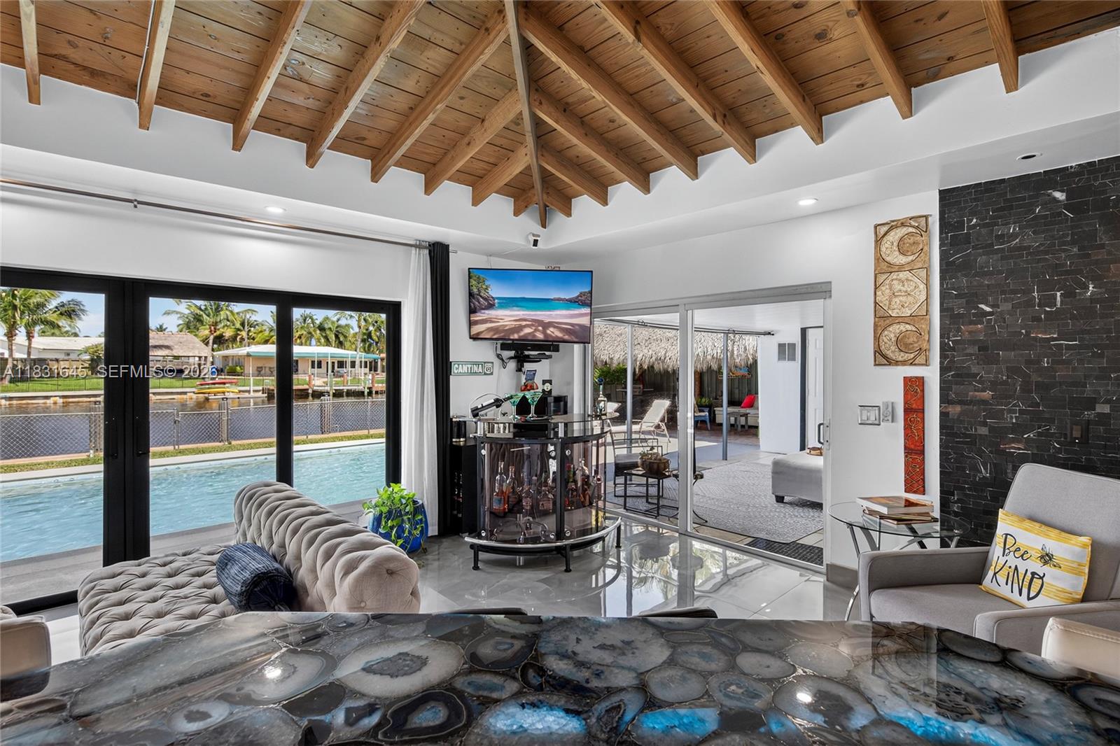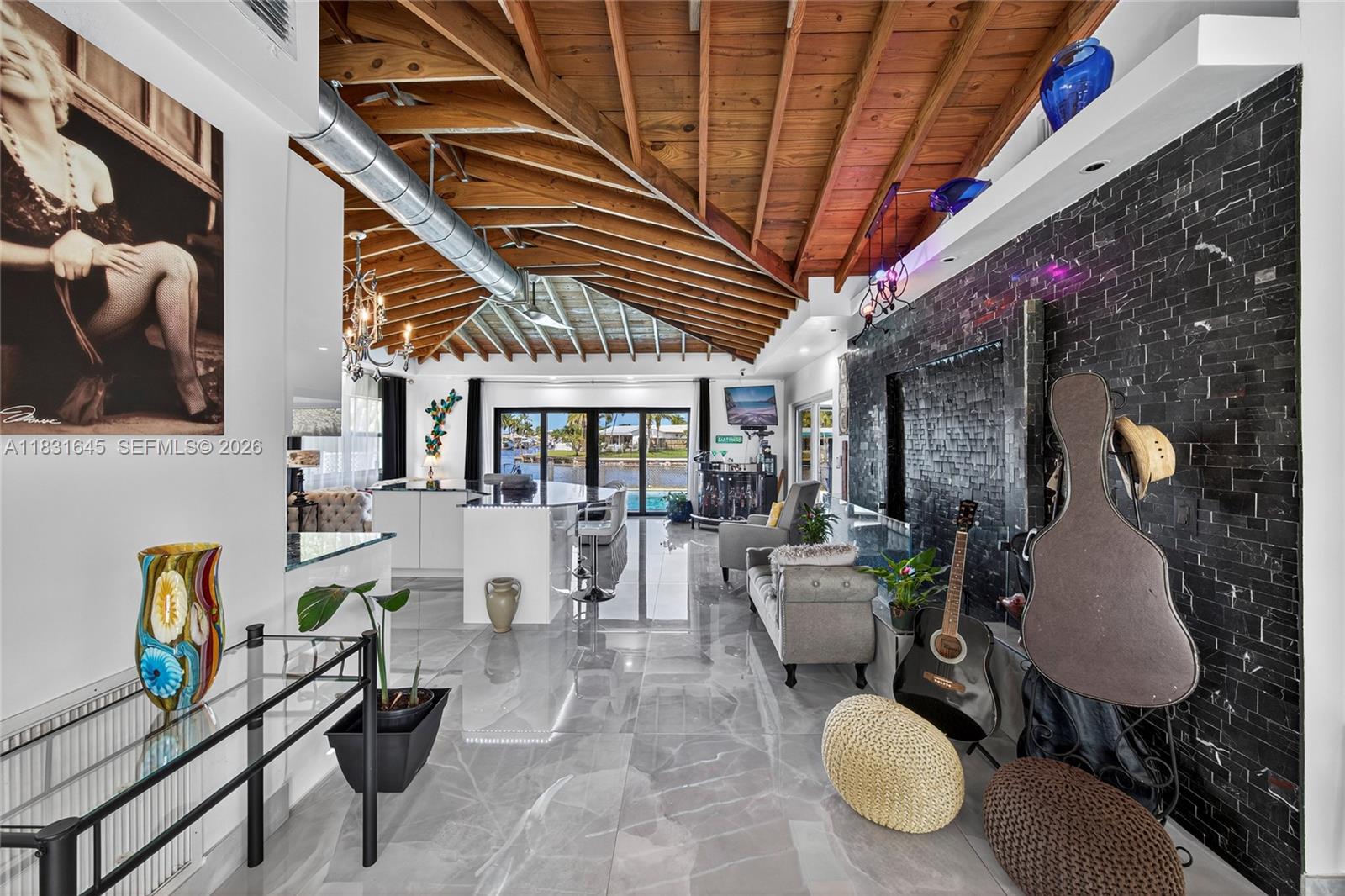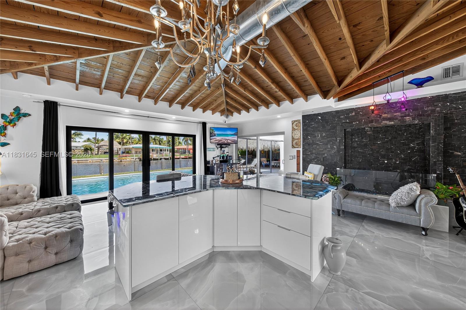 Discover a one-of-a-kind custom home in Garden Isles, where artistic design meets upscale living. This beautifully reimagined residence offers 80’ of seawall with a stunning view of a wide ocean-access canal, the perfect backdrop for entertaining or relaxing in style. Extensively remodeled, this home features open wood vaulted ceilings, large porcelain floors, an interior water wall, custom German cabinets, deep blue semi-precious agate countertops, impact windows and doors,2 outdoor living and dining areas, a heated pool, and a fully-owned, new 13.6kW solar system with a Tesla house-backup battery. The outdoors boast a large tropical tiki hut, an expansive pool deck and open backyard, and a new 80’ custom dock.Close to shopping ,dining and 8 brand-new pickleball courts at Sgt. Kip Jacoby Park. Bring your boat and family to live the ultimate Florida lifestyle.