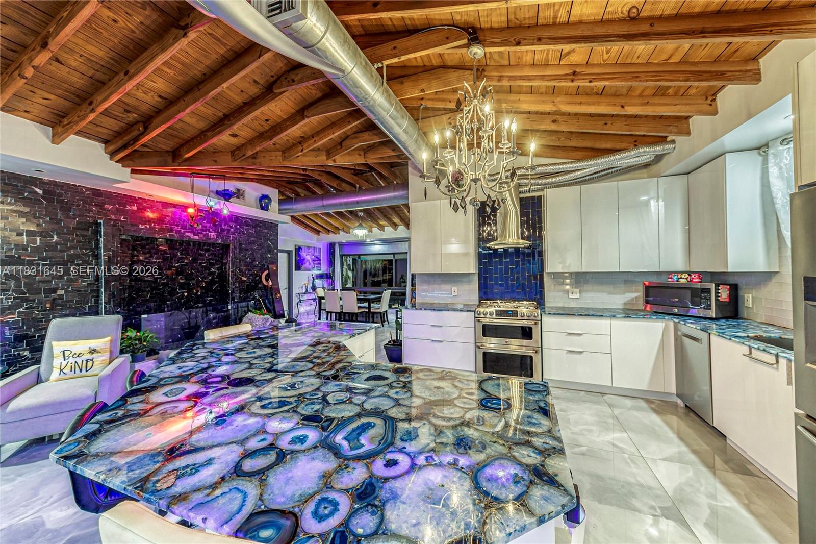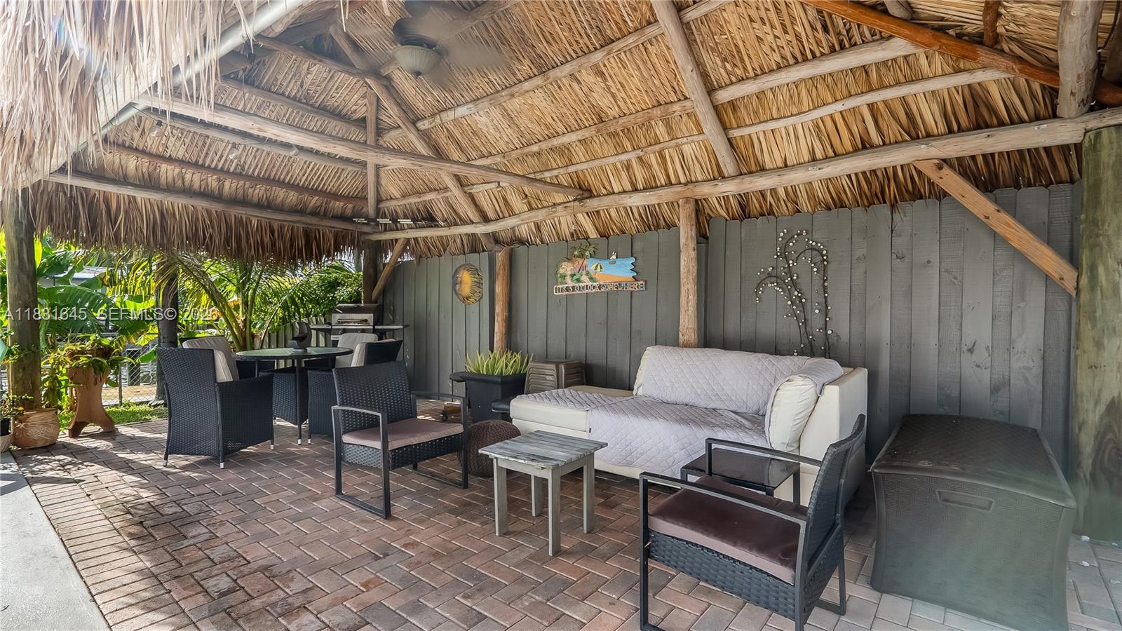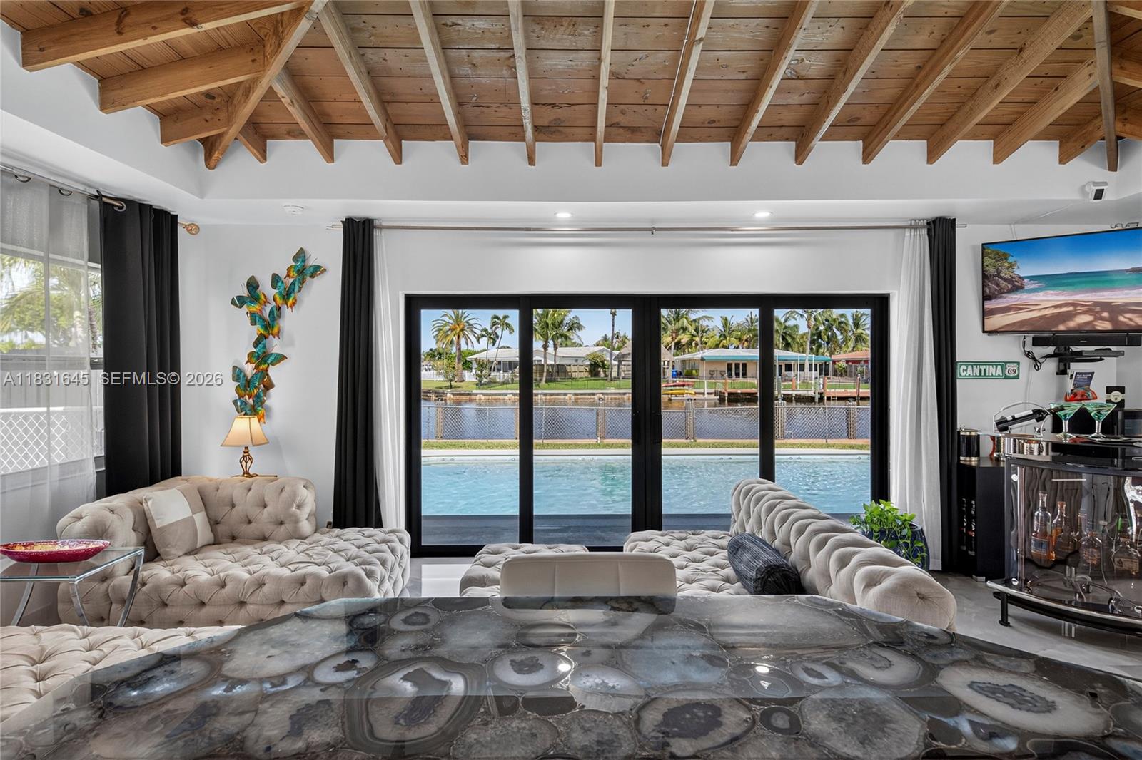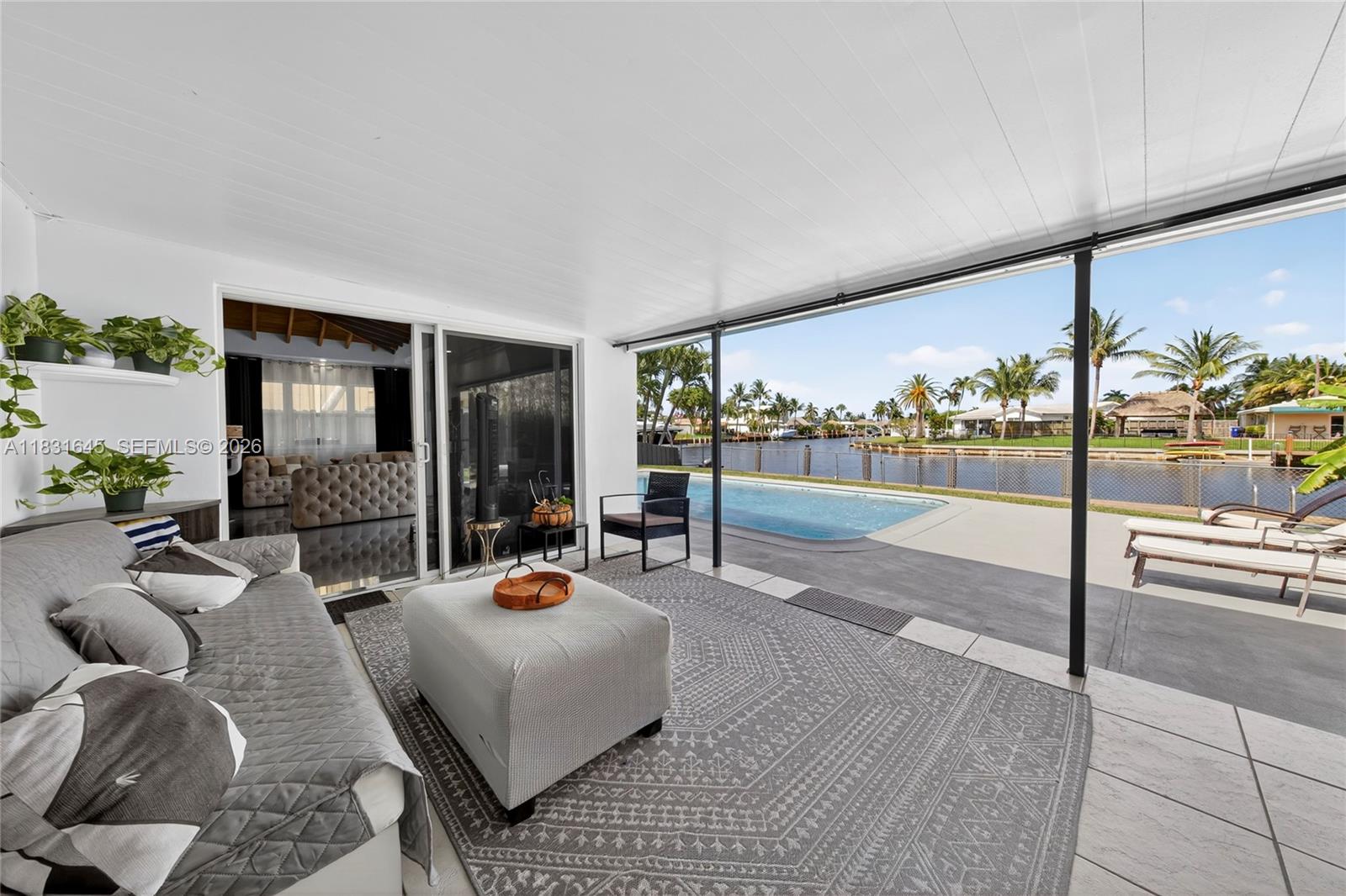 Discover a one-of-a-kind custom home in Garden Isles, where artistic design meets upscale living. This beautifully reimagined residence offers 80’ of seawall with a stunning view of a wide ocean-access canal, the perfect backdrop for entertaining or relaxing in style. Extensively remodeled, this home features open wood vaulted ceilings, large porcelain floors, an interior water wall, custom German cabinets, deep blue semi-precious agate countertops, impact windows and doors,2 outdoor living and dining areas, a heated pool, and a fully-owned, new 13.6kW solar system with a Tesla house-backup battery. The outdoors boast a large tropical tiki hut, an expansive pool deck and open backyard, and a new 80’ custom dock.Close to shopping ,dining and 8 brand-new pickleball courts at Sgt. Kip Jacoby Park. Bring your boat and family to live the ultimate Florida lifestyle.
