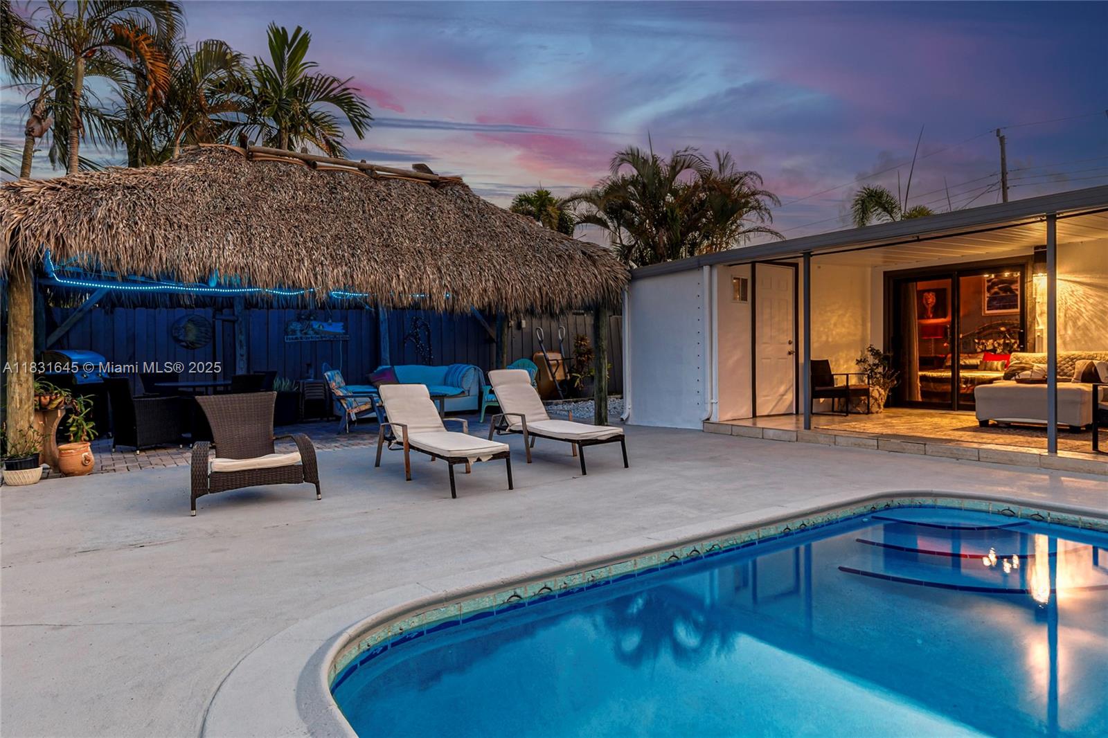 Discover a one-of-a-kind custom home in Garden Isles, where artistic design meets upscale living. This beautifully reimagined residence offers 80’ of seawall with a stunning view of a wide ocean-access canal, the perfect backdrop for entertaining or relaxing in style. Extensively remodeled, this home features open wood vaulted ceilings, large porcelain floors, an interior water wall, custom German cabinets, deep blue semi-precious agate countertops, impact windows and doors,2 outdoor living and dining areas, a heated pool, and a fully-owned, new 13.6kW solar system with a Tesla house-backup battery. The outdoors boast a large tropical tiki hut, an expansive pool deck and open backyard, and a new 80’ custom dock. Bring your boat and family to live the ultimate Florida lifestyle.