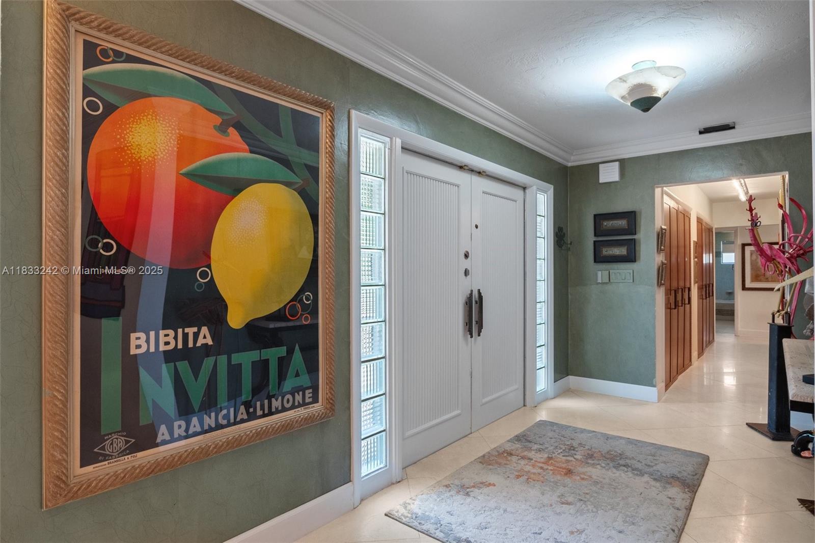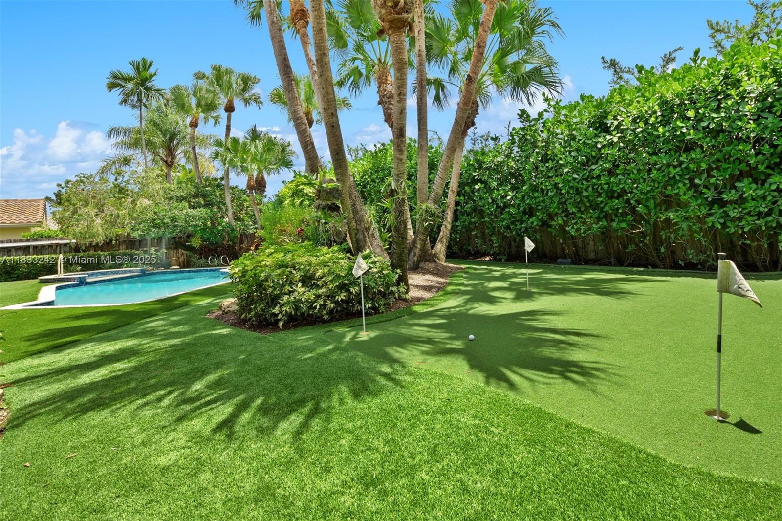 Beautifully updated 4BD/2BA home featuring marble floors in main areas and wood floors in all bedrooms. Gourmet kitchen with wood cabinetry, mosaic backsplash, granite counters, wine cooler, center island, and premium stainless appliances incl. oversized fridge, grill, and double oven. Primary suite offers walk-in closet, remote shades, and spa-like bath with steam shower, bidet, and Culligan system. Outdoor oasis boasts heated saltwater pool, spa, putting green, covered patio with TV, and 25 palm trees. A mix of hurricane doors, impact windows & shutters, tankless water heater, 5-ton A/C (2022), Nest system, and more. Motivated sellers & a must-see!