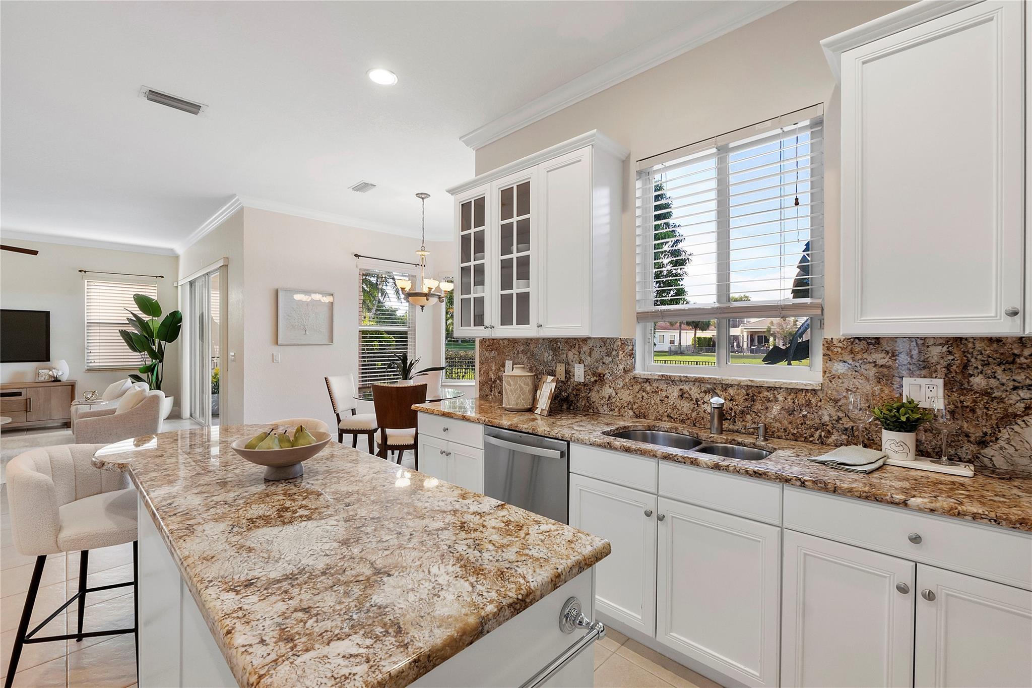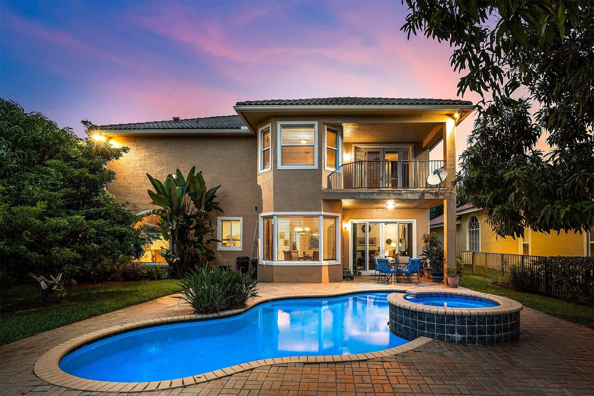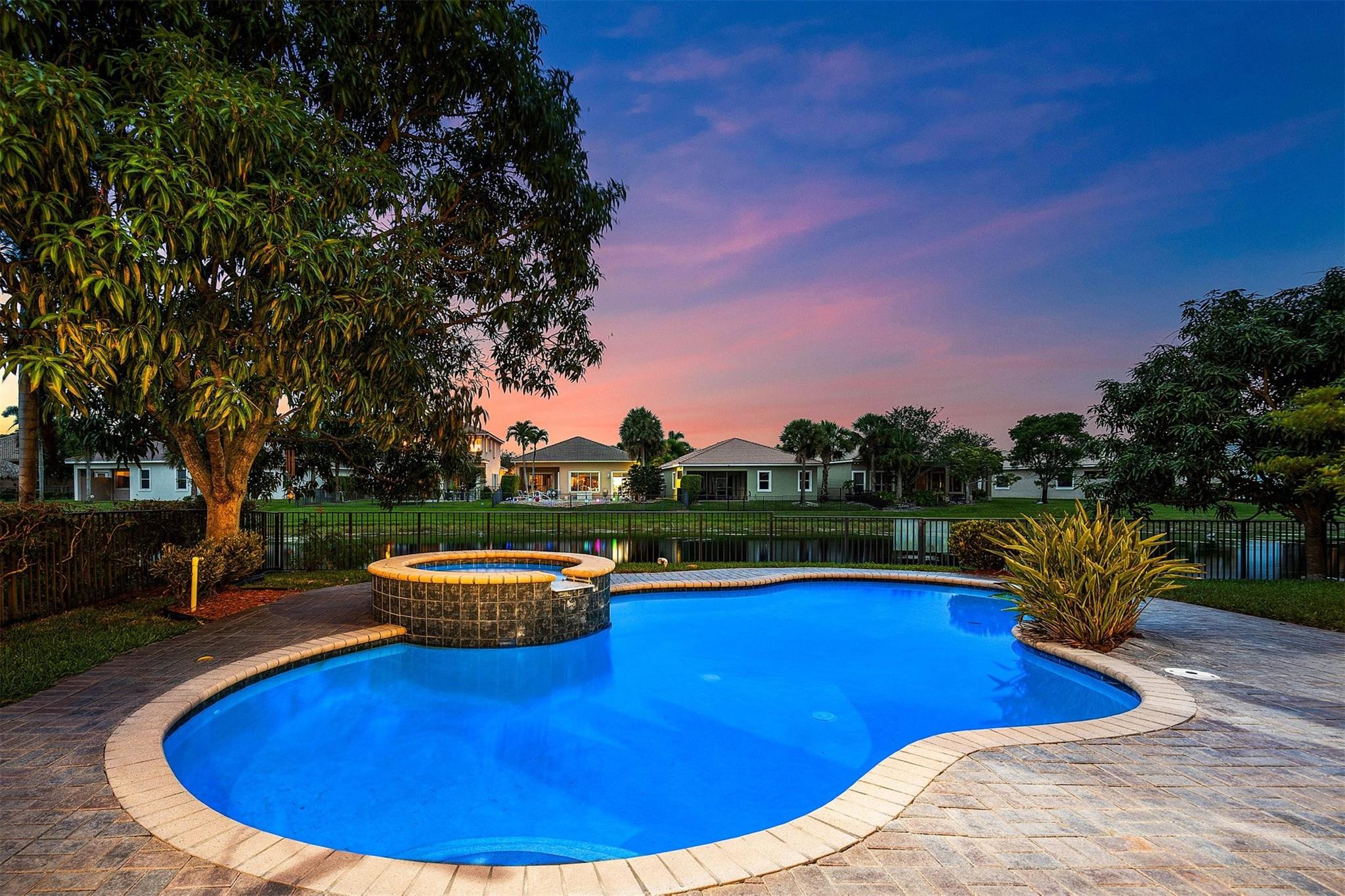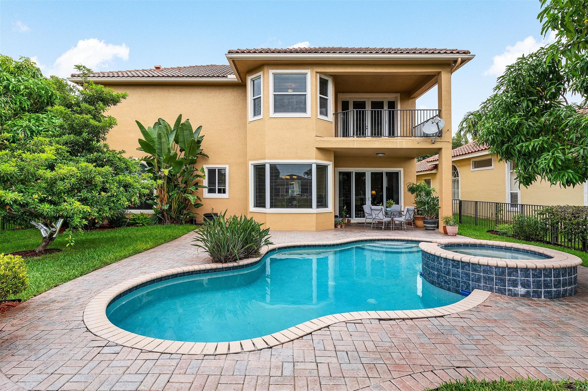 Magnificent opportunity to own this gem in prestigious Heron Bay! This meticulously maintained 5 BR/flex/office, 4BA home features soaring ceilings, elegant living & dining rooms, family room and a spacious kitchen with walk-in pantry—perfect for gatherings. Enjoy tranquil water views from your private tropical oasis with pool, hot tub, and mature mango & sapodilla trees. The luxurious primary suite boasts a sitting area, balcony, 2 custom walk-in closets, and spa bath with Jacuzzi tub & walk-through shower. Impact windows/doors, crown molding, tray ceilings & 3-car tiled garage. Sprinkler system pulls from the lake for lower water bill. Resort-style living with 2 clubhouses, pools, gyms, tennis, pickleball, basketball, walking trails, 3 gated entrances & more. Your dream home awaits!