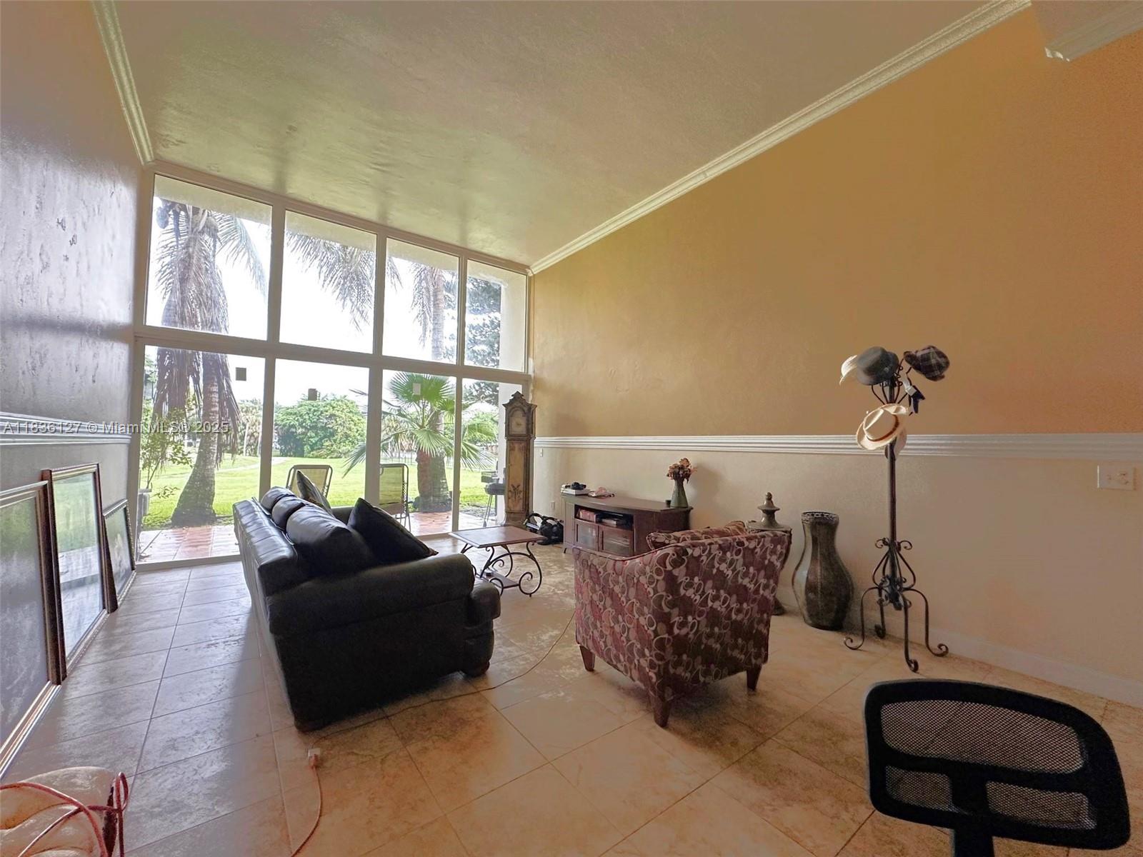 Welcome to the prestigious Country Club of Miami. Rarely available, 1,752 sf townhouse overlooking the golf course. This property features an fantastic architectural design with13.5 foot ceilings in the living area with floor to ceiling windows. This design language continues in the very spacious primary bedroom with floor to ceiling windows and golf course views. Impact windows throughout, wood kitchen cabinets, stainless steel appliances and granite kitchen counters as well as new roof (2025). The property has the desirable North facing orientation which assures you will not experience direct sunlight through your expansive windows during fall and winter months. Close to many shopping and dining options, excellent location minutes to 826 and I-75.