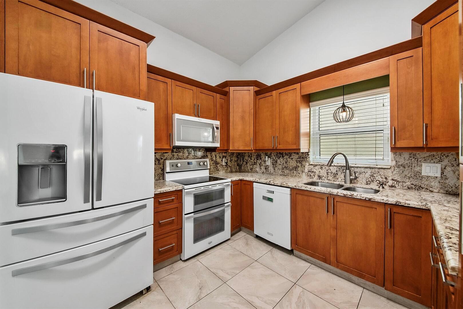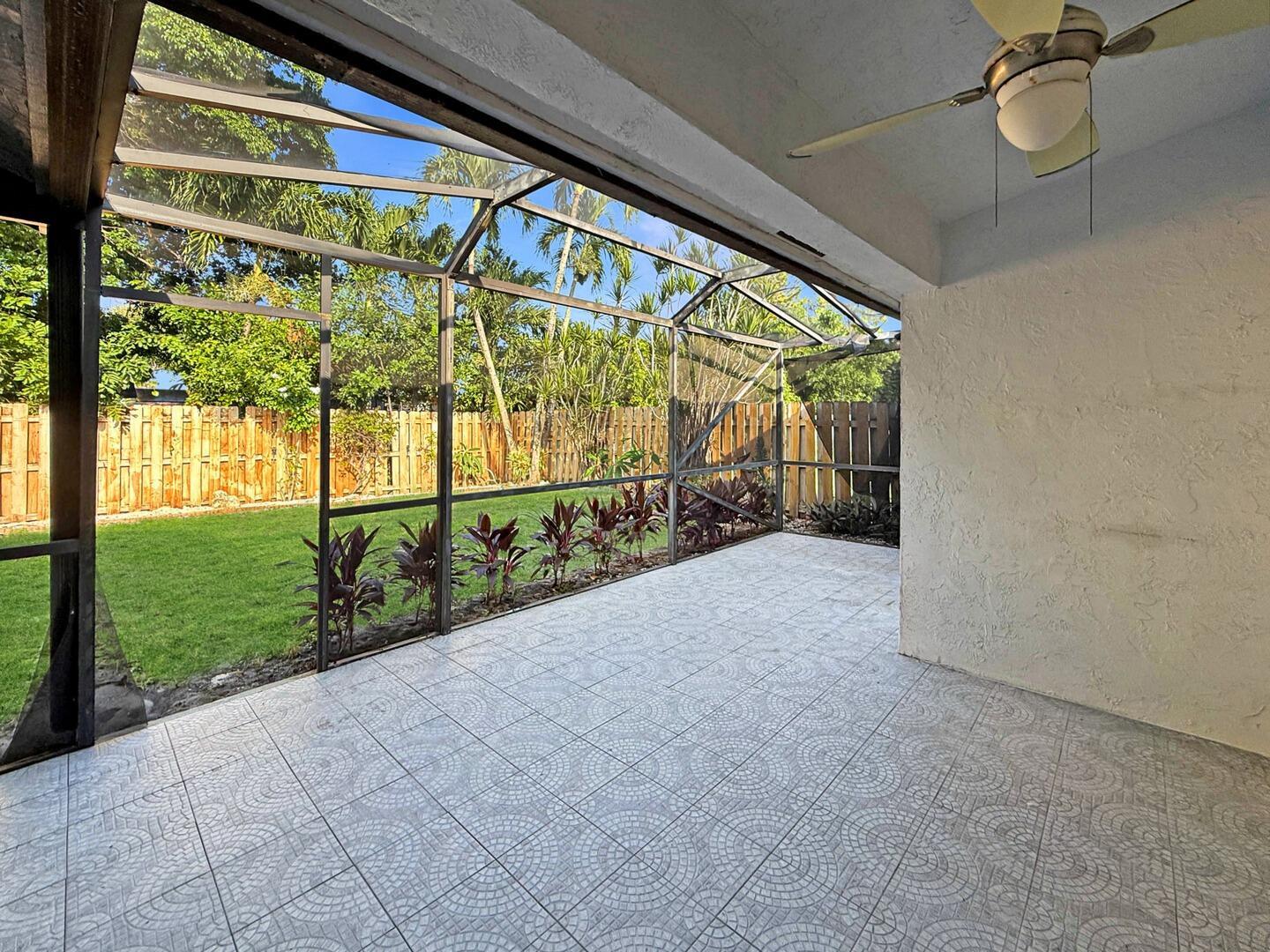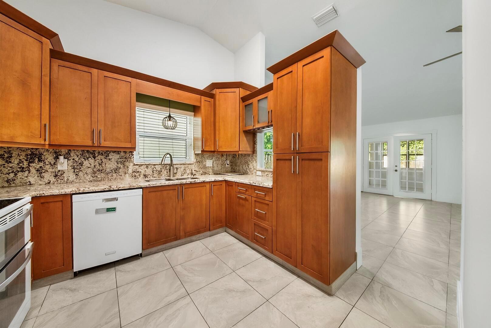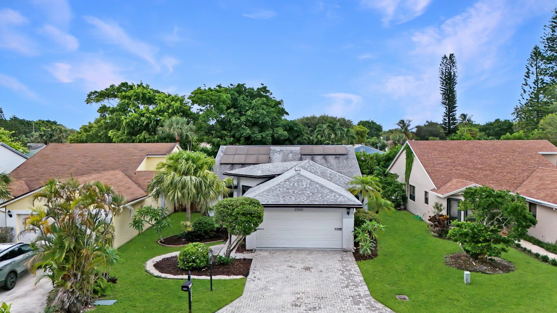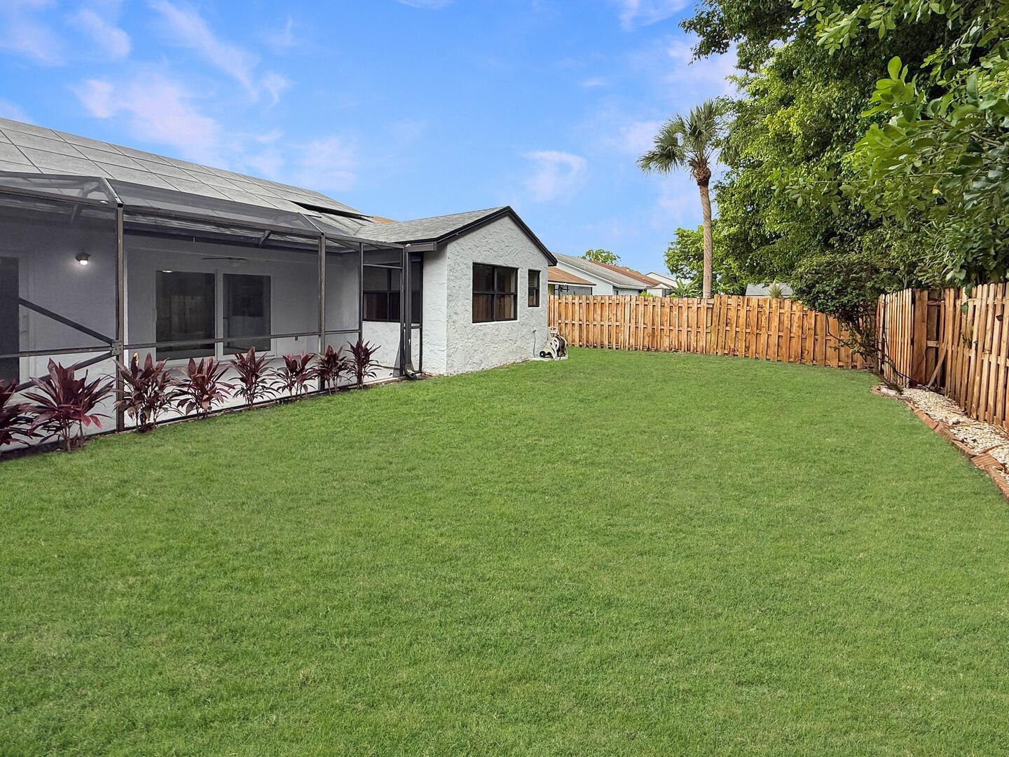 Welcome to this beautifully maintained 4 bedroom, 2 bath home in the desirable Boca Trace community. Step into the inviting foyer and enjoy the spacious feel created by vaulted ceilings and abundant natural light. The home features neutral flooring throughout, has been freshly painted, and includes impact windows for added peace of mind. The updated kitchen is a chef's delight, showcasing granite countertops, a full granite backsplash, and ample cabinetry. The primary suite offers a relaxing retreat with a coffered ceiling, sliding glass doors to the patio, a soaking tub, walk-in shower, and generous closet space. Additional highlights include solar panels for energy efficiency, a newer roof, and a newer washer and dryer