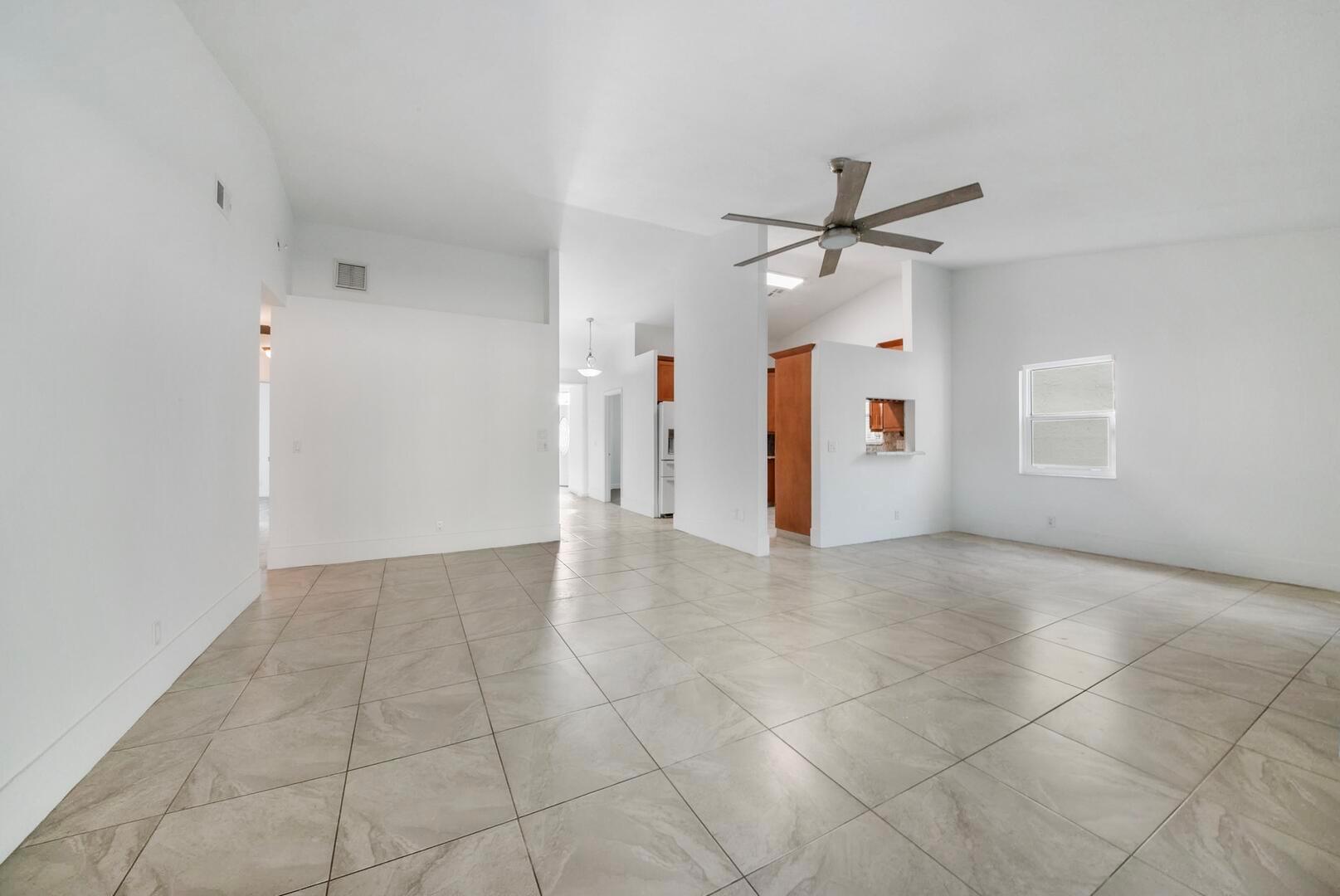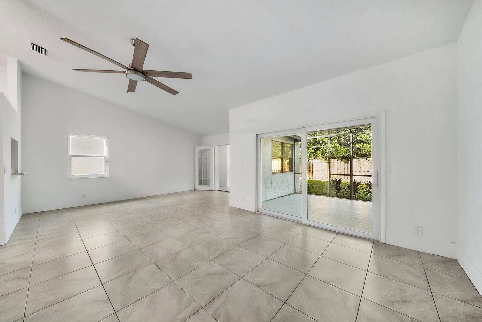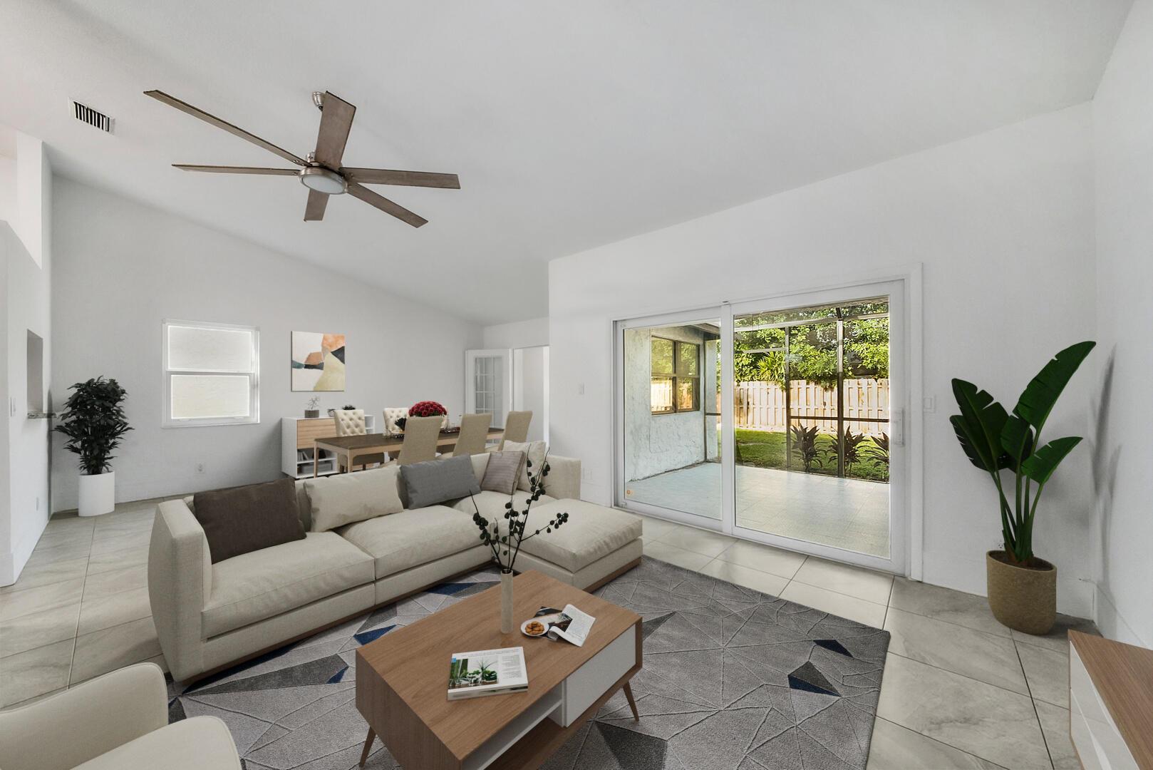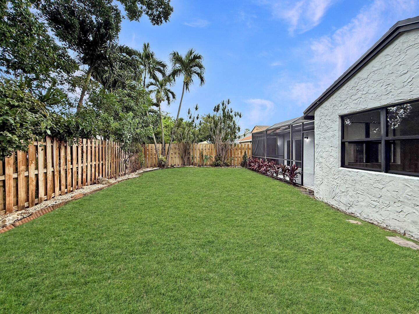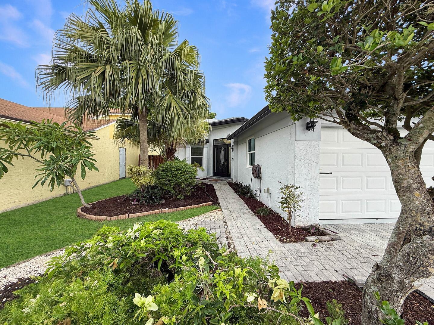 Welcome to this beautifully maintained 4 bedroom, 2 bath home in the desirable Boca Trace community. Step into the inviting foyer and enjoy the spacious feel created by vaulted ceilings and abundant natural light. The home features neutral flooring throughout, has been freshly painted, and includes impact windows for added peace of mind. The updated kitchen is a chef's delight, showcasing granite countertops, a full granite backsplash, and ample cabinetry. The primary suite offers a relaxing retreat with a coffered ceiling, sliding glass doors to the patio, a soaking tub, walk-in shower, and generous closet space. Additional highlights include solar panels for energy efficiency, a newer roof, and a newer washer and dryer