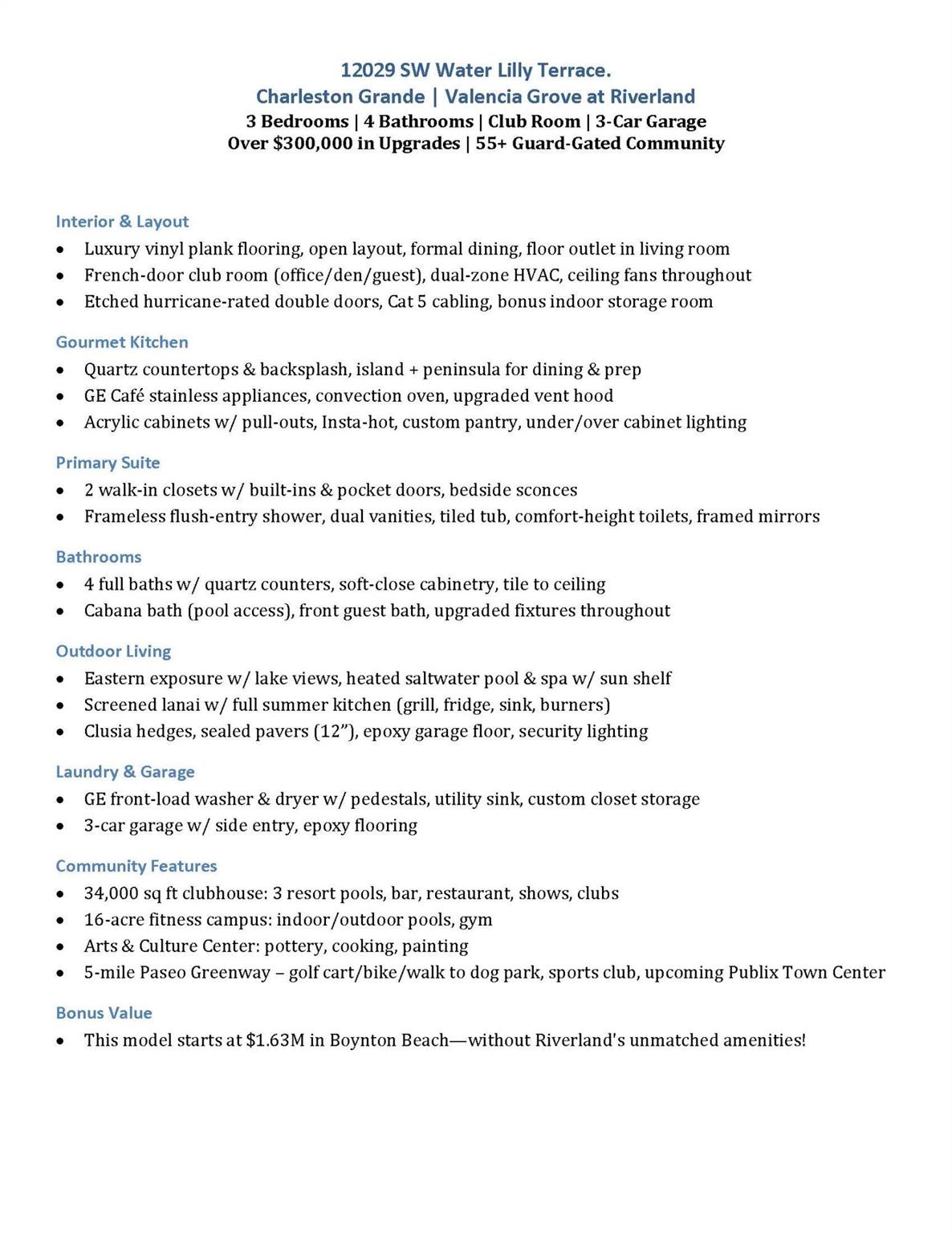 Experience luxury living in this exceptional GL Homes Charleston Grande, the largest model in Valencia Grove at Riverland, part of the Crown Collection. A premier 55+ resort-style community with low HOA fees. Over $300,000 in upgrades, this exquisite 3-bedroom, 4-bathroom home with a versatile flex room and spacious 3-car garage with a side door entry, is both an entertainer's dream and a tranquil private retreat. Enter through etched glass hurricane-rated double front doors into a thoughtfully designed interior featuring high-end WPC luxury vinyl plank flooring throughout (excluding bathrooms). The expansive open layout includes a formal dining room, a large living area with a convenient floor outlet, and a flex room with French doors--ideal as an office, library, or additional