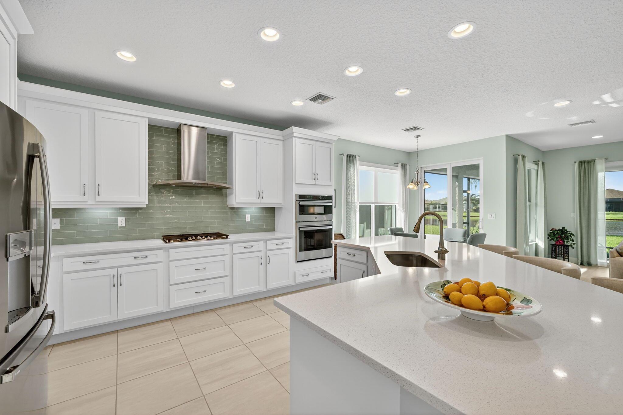 Welcome to your dream home in the sought-after 55+ community of Valencia Cay at Riverland! This beautifully designed Bimini Model sits on an oversized premium lakefront lot, offering breathtaking water views and the perfect blend of luxury, comfort, and lifestyle. Featuring 3 spacious bedrooms, 3 full bathrooms, a den/flex room, and over 2,358 sq. ft. of living space, this open-concept layout is ideal for entertaining and everyday living. The gourmet kitchen boasts quartz countertops, stainless steel appliances, a large island, and upgraded cabinetry, seamlessly flowing into the expansive great room and dining area, all overlooking the large, covered patio and sparkling lake with a south exposure.