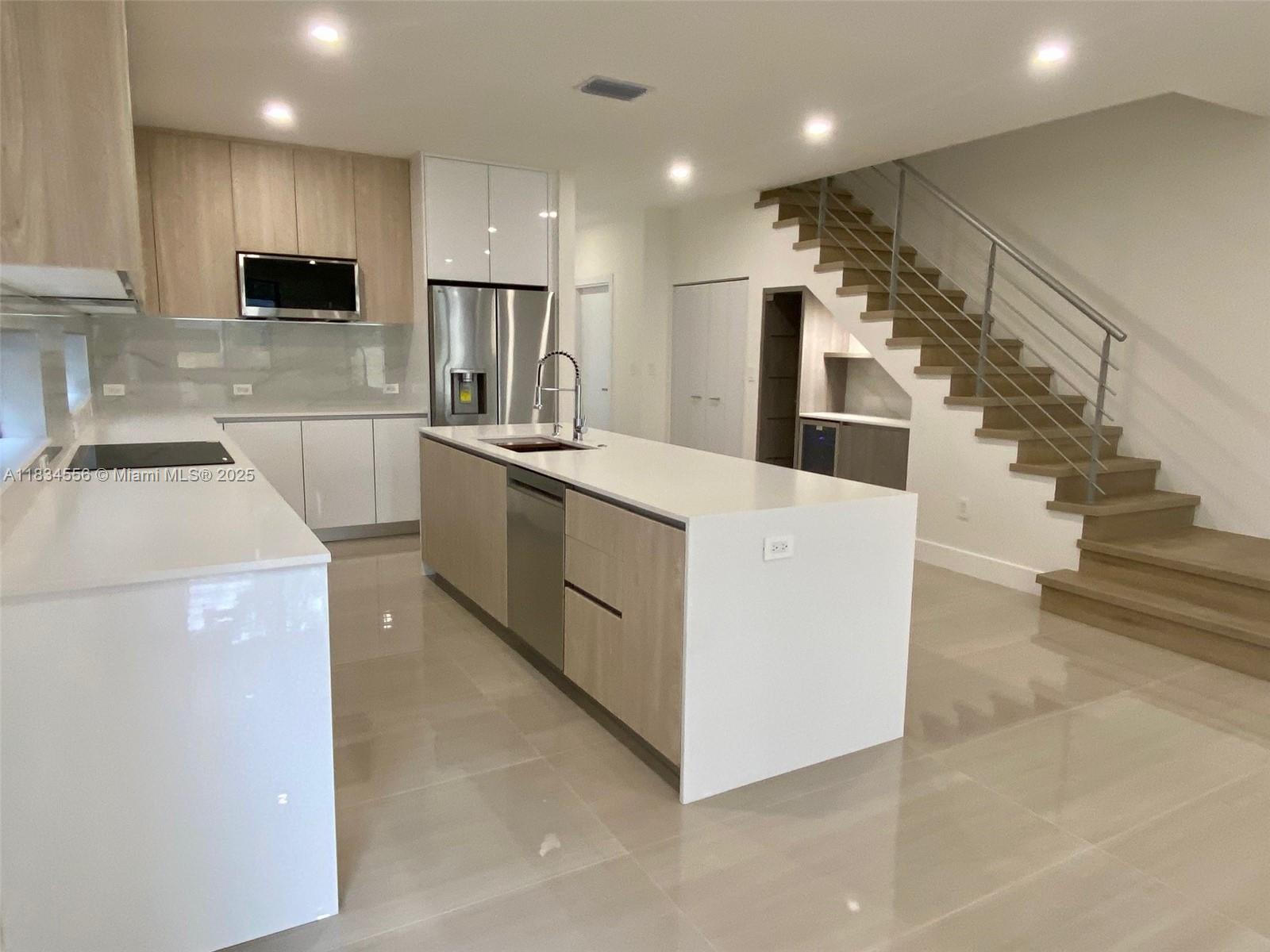 Located on one of the most beautiful blocks in Tarpon River, this 2025 townhouse is surrounded by new homes designed by the same architect, creating a cohesive and modern streetscape. Fee Simple ownership with no HOA fees. This home features 3 bedrooms, each with its own en-suite bathroom, and 2,667 total sq. ft. It offers an open-concept layout, 9ft ceilings, gourmet kitchen with SS appliances, quartz countertops, and a wine bar. A standout feature is the 56-ft-deep driveway, allowing for parking up to 4 vehicles, plus a private 1-car garage—a rare find in a duplex. EV charging connection installed. Enjoy balconies at both the front and rear of the home. Additional features include impact windows and doors, Nest thermostat, Ring doorbell, and a security camera system. Move-in ready!