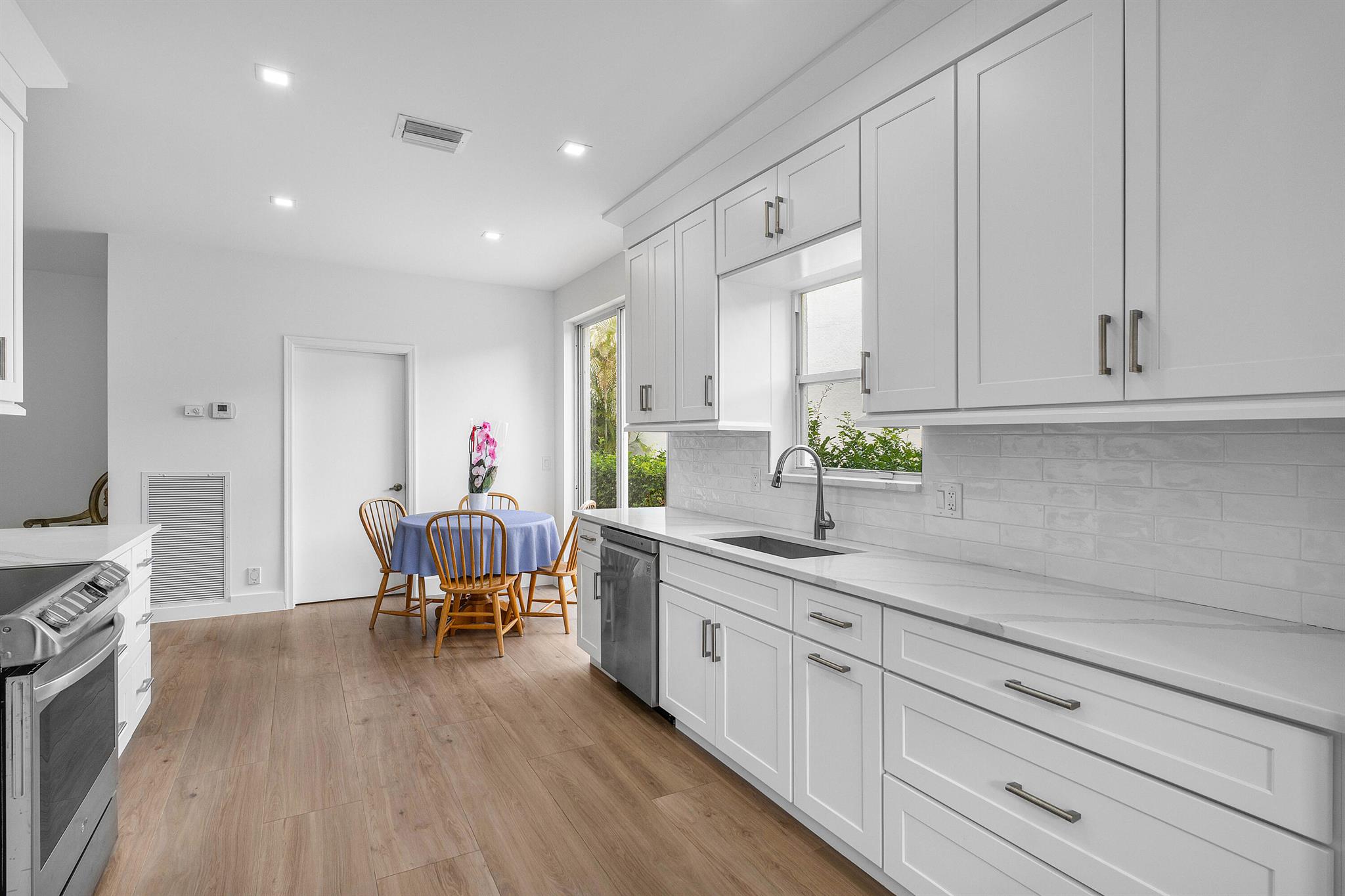 Welcome to your dream home! This stunning 4-bedroom, 2.5-bathroom pool home has it all. It is bright and inviting, with an open floor plan, perfect for entertaining or relaxing at home. This home features a serene backyard with a gorgeous view of the enchanting Morikami Gardens. Look no further for your peaceful retreat. The newly renovated kitchen is a chef's delight, featuring modern finishes and ample storage. The brand new porcelain tile floors flow through the first floor creating a warm, inviting, and easy to maintain space. The primary suite is spacious with an expansive primary bathroom featuring a beautifully upgraded shower and two oversized walk-in closets. Newport Bay Club is extraordinary with its prime location and country club amenities *without* the country club