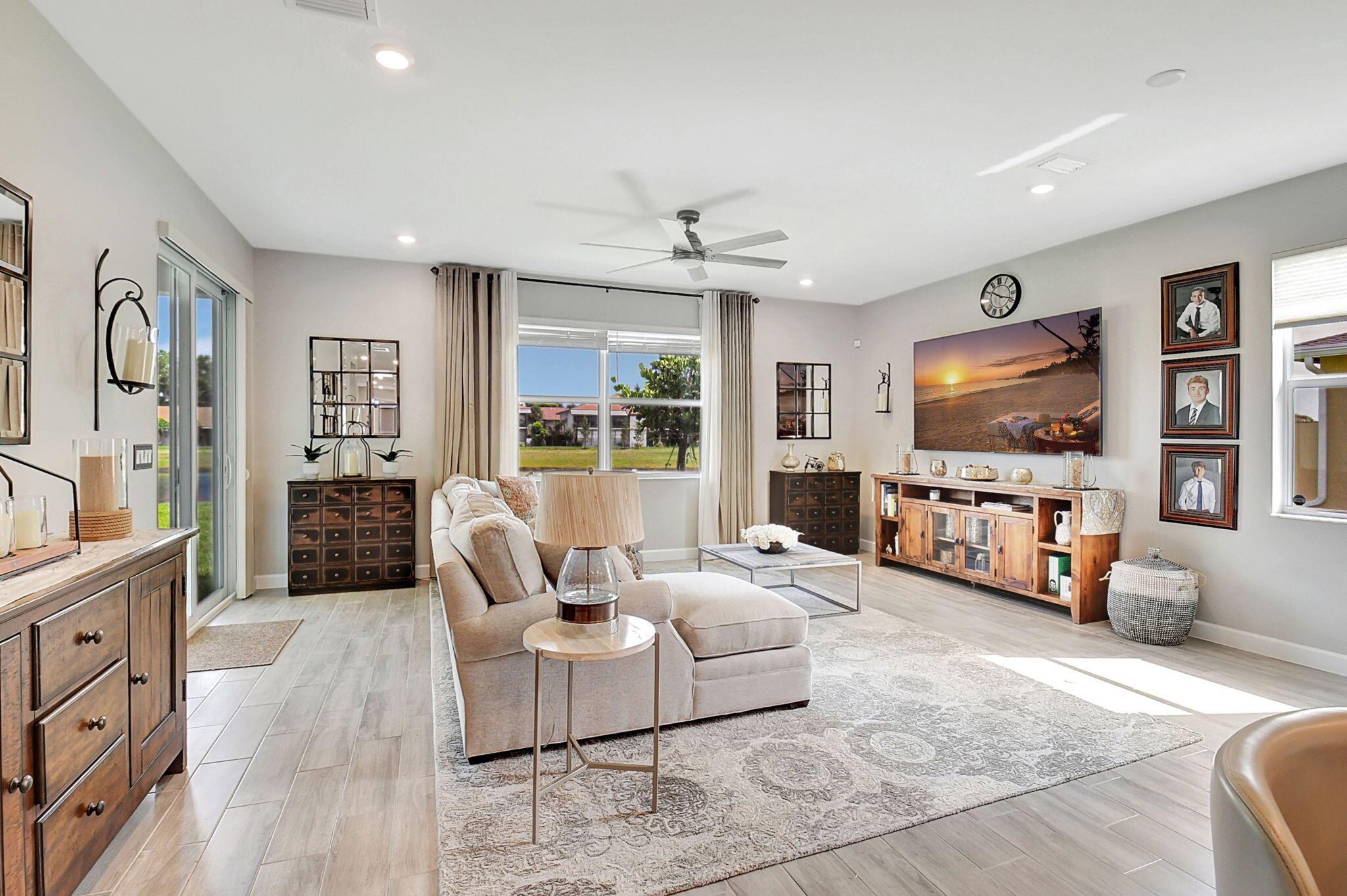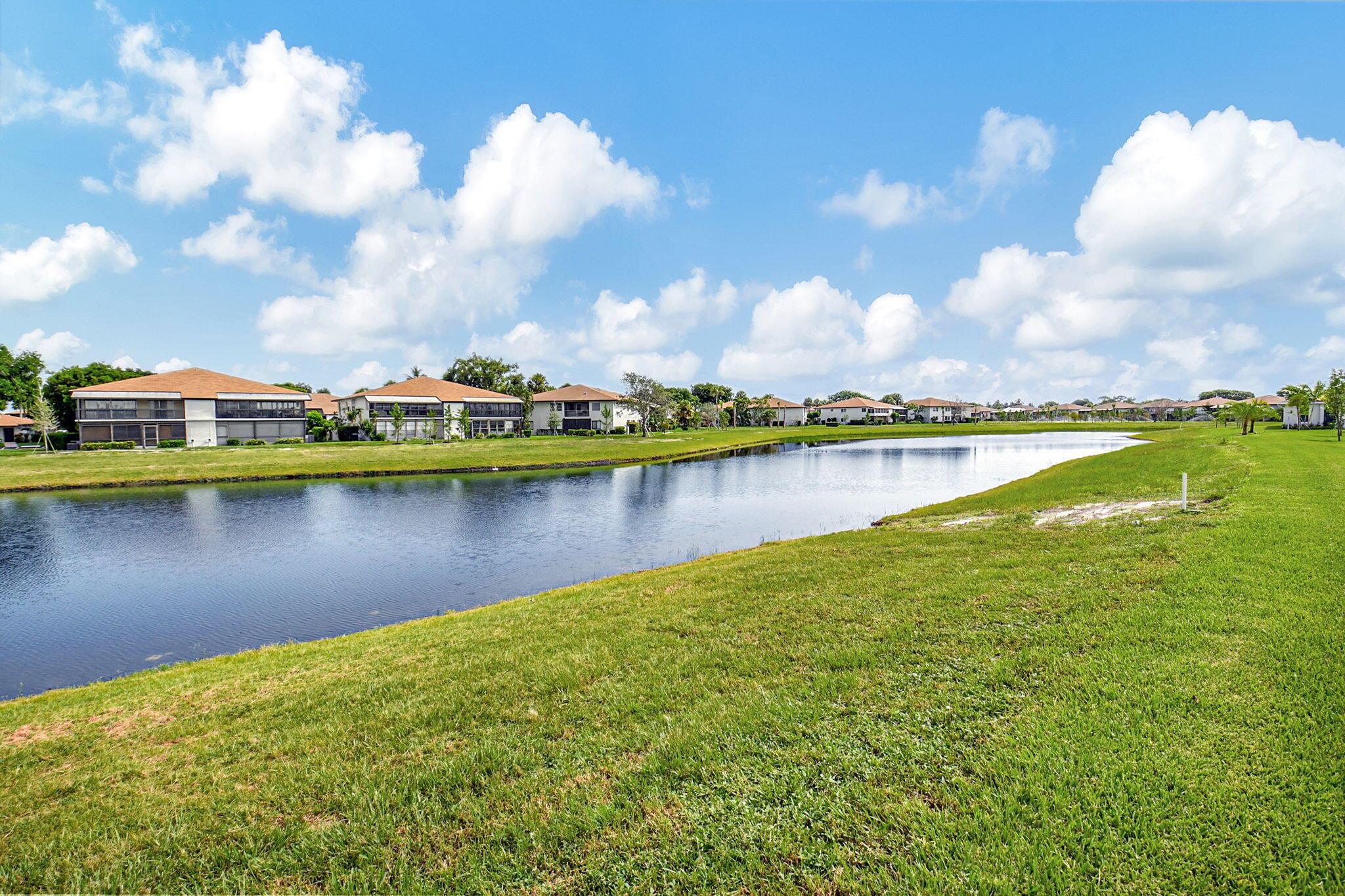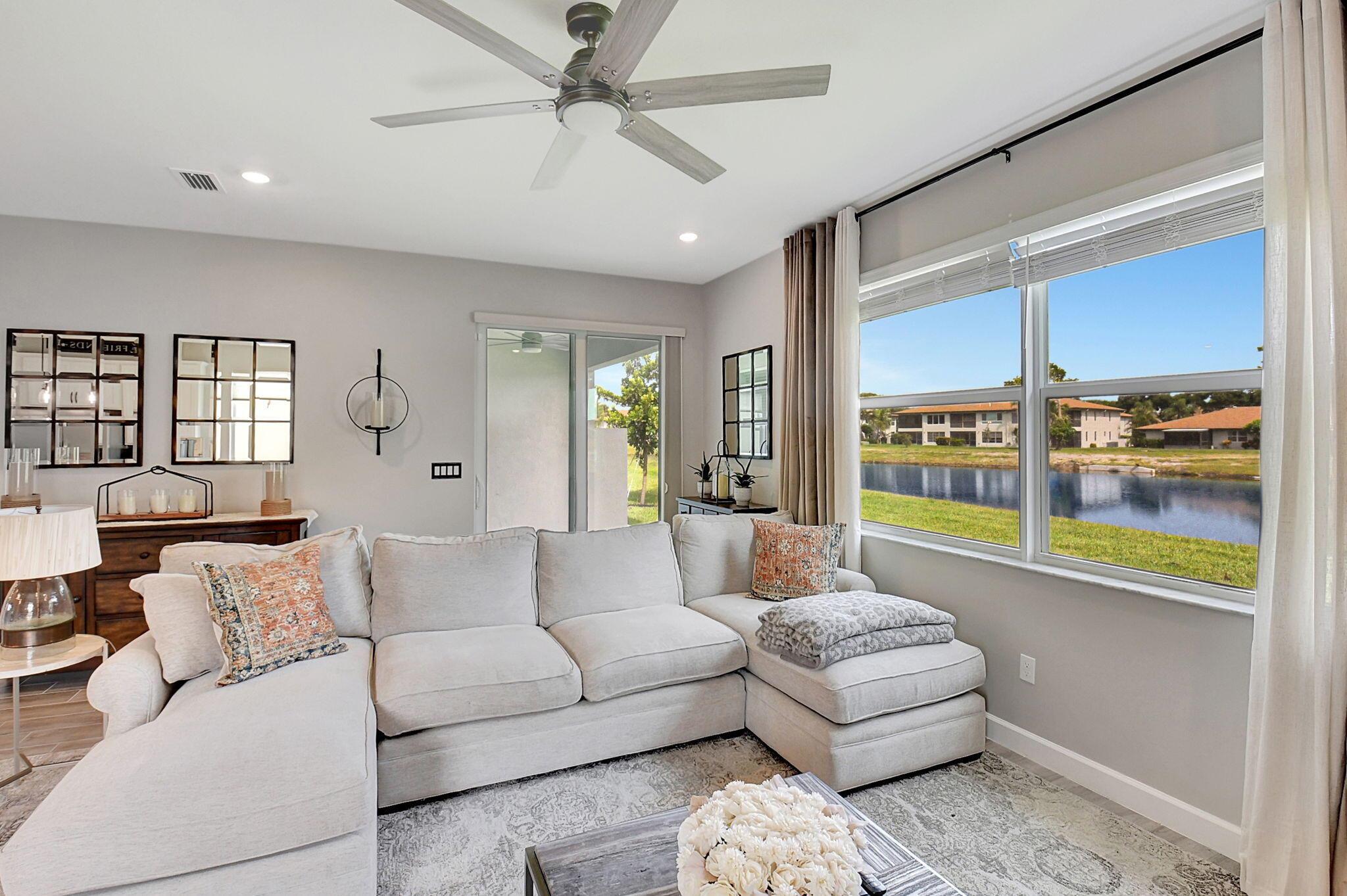 Fantastic opportunity to own this elegant home with a lakefront view in active 55+ community with luxury amenities, just minutes to the beach, boutiques, and dining on the Ave, or charming Pineapple Grove. Lightly lived in seasonal home impeccably cared for is beautifully appointed with designer upgrades including porcelain tile, custom mirror backsplash, glass entry, a current palate; and practical ones like full impact windows that fill the home with light without excess solar gain. Enjoy the best of Florida living with 3 resort style pools, clubhouse, fitness facility, restaurant, tennis, and pickleball. Sidewalks and street lights offer a walkable community and this home's ideal location places you a short stroll to the amenities. See docs for more upgrades and features.