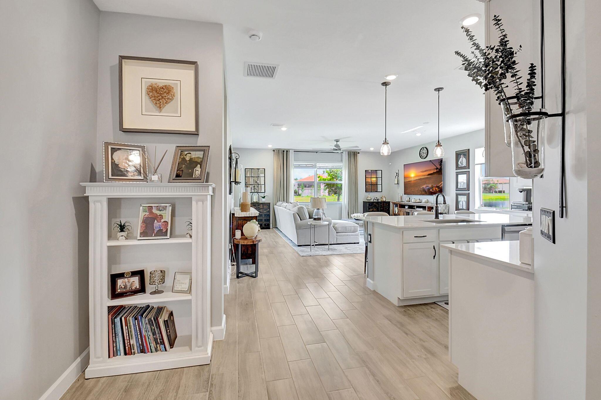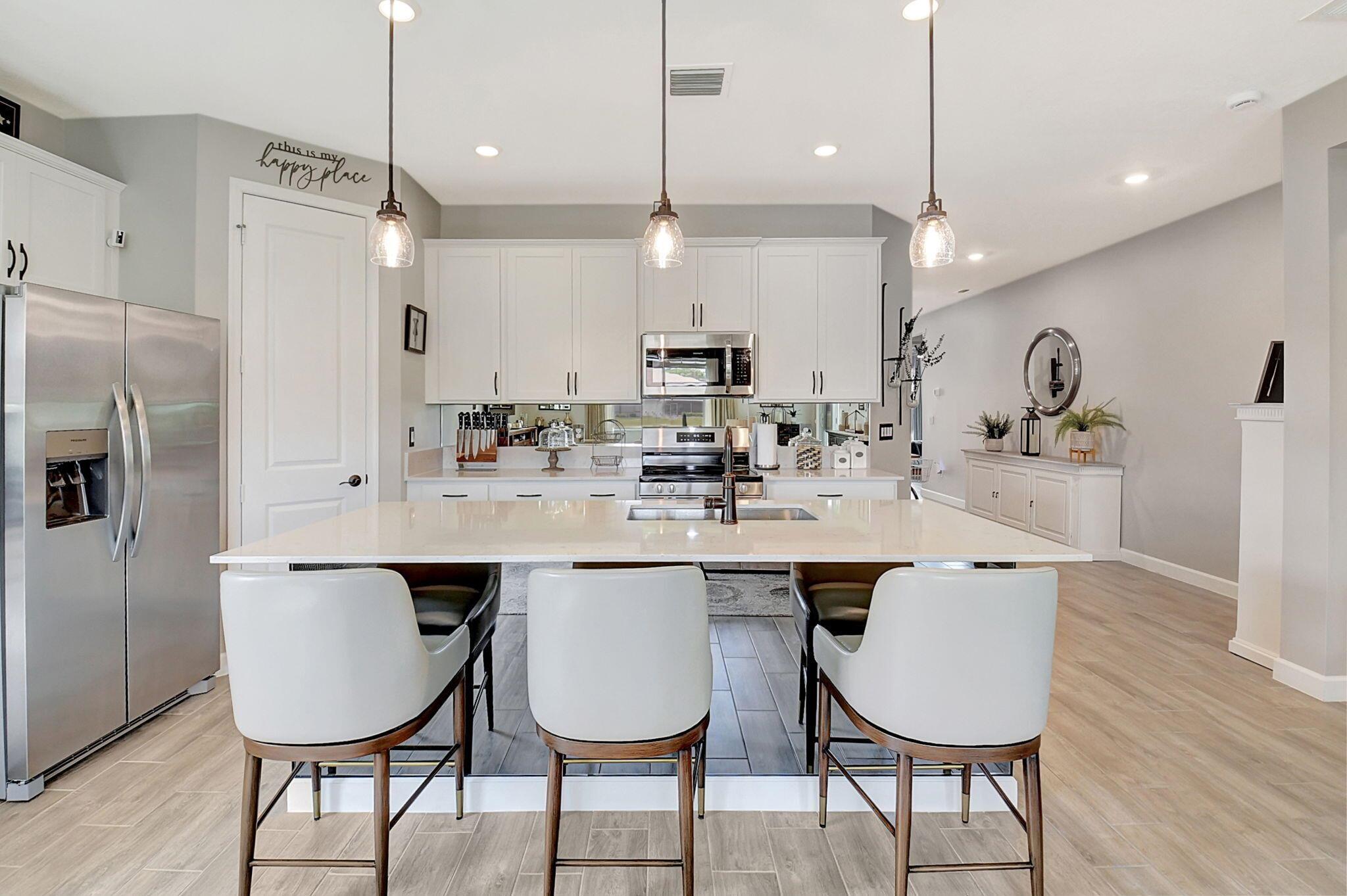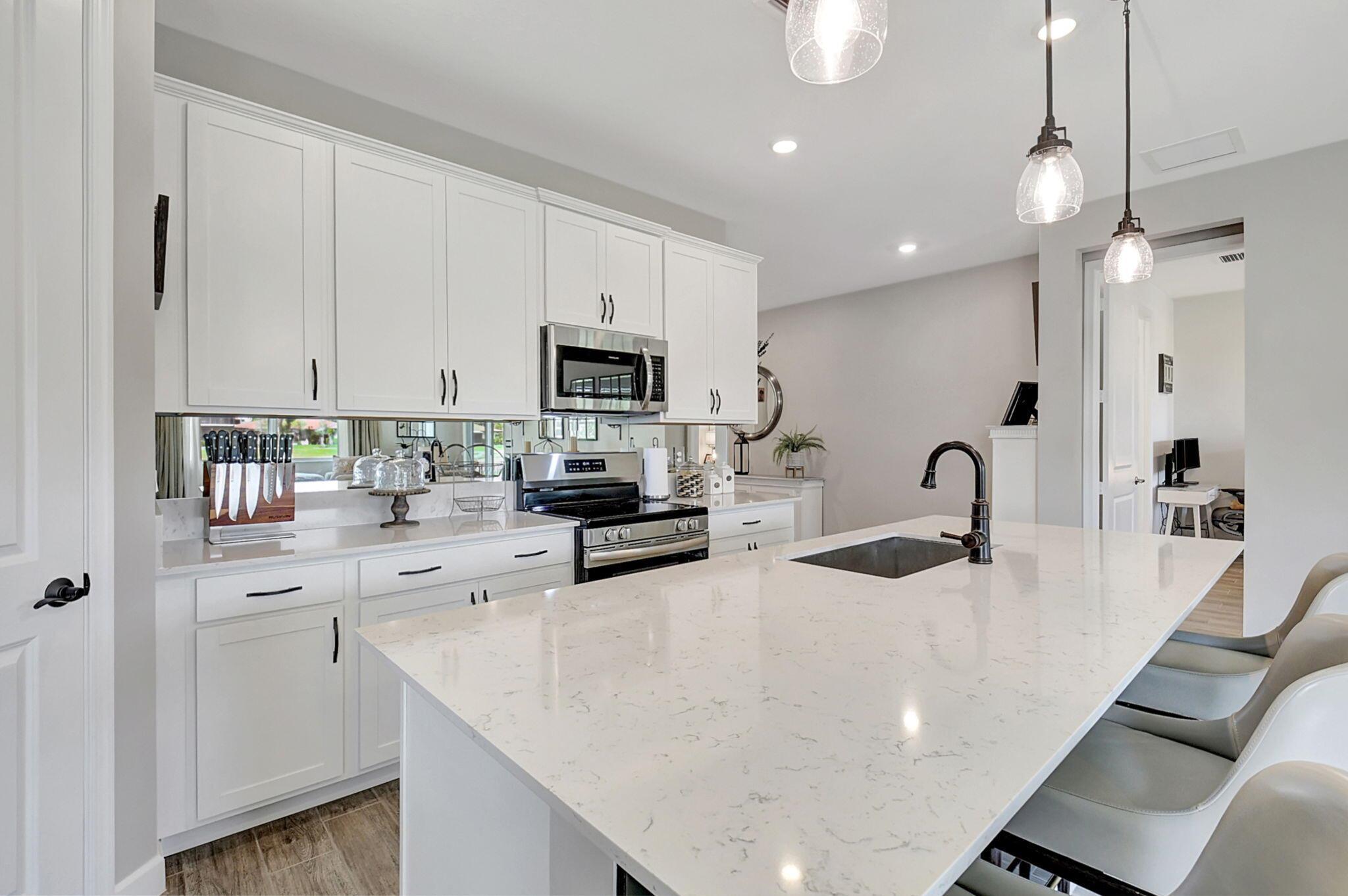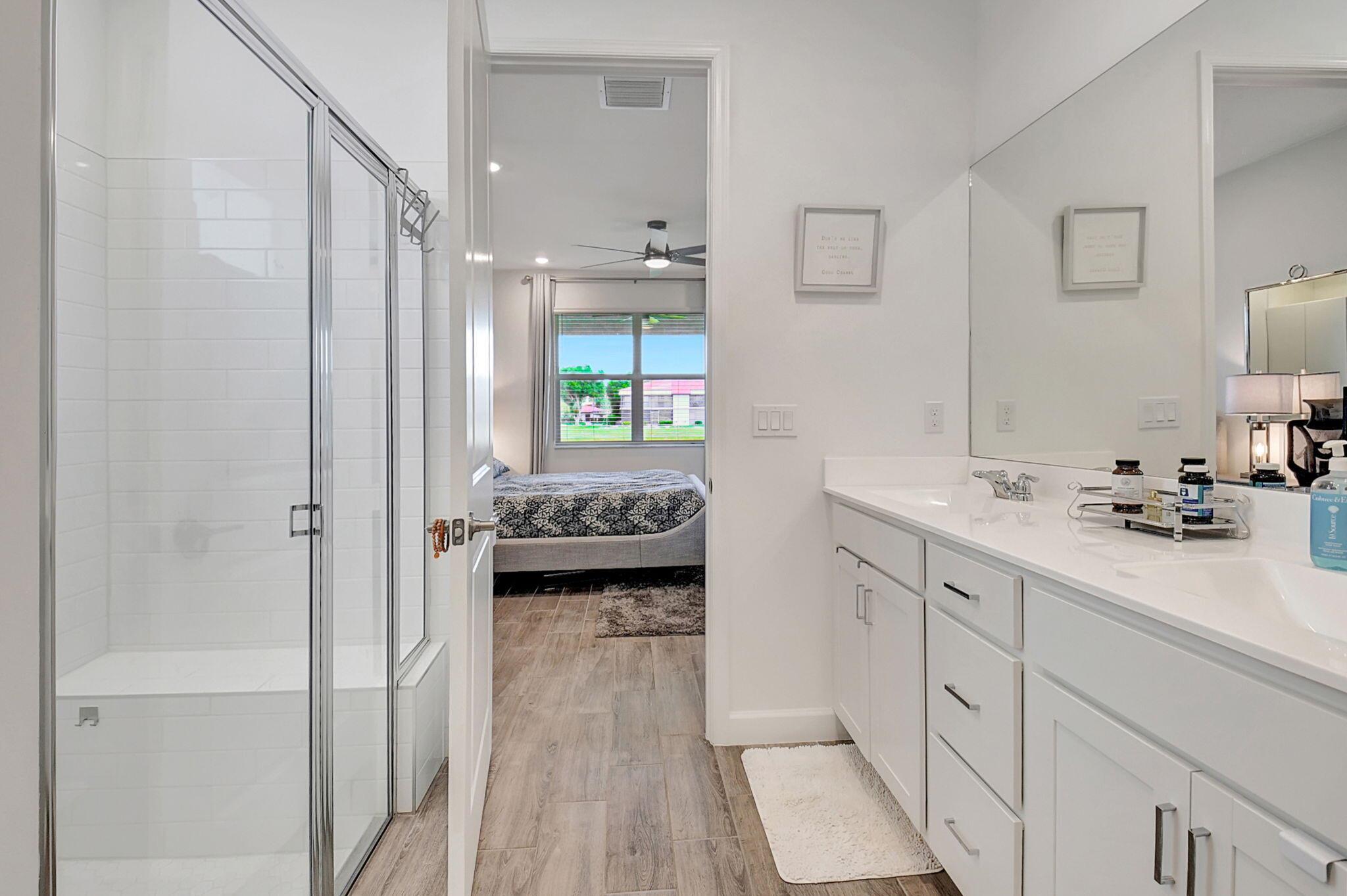 Fantastic opportunity to own this elegant home with a lakefront view in active 55+ community with luxury amenities, just minutes to the beach, boutiques, and dining on the Ave, or charming Pineapple Grove. Lightly lived in seasonal home impeccably cared for is beautifully appointed with designer upgrades including porcelain tile, custom mirror backsplash, glass entry, a current palate; and practical ones like full impact windows that fill the home with light without excess solar gain. Enjoy the best of Florida living with 3 resort style pools, clubhouse, fitness facility, restaurant, tennis, and pickleball. Sidewalks and street lights offer a walkable community and this home's ideal location places you a short stroll to the amenities. See docs for more upgrades and features.