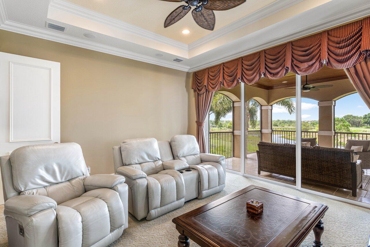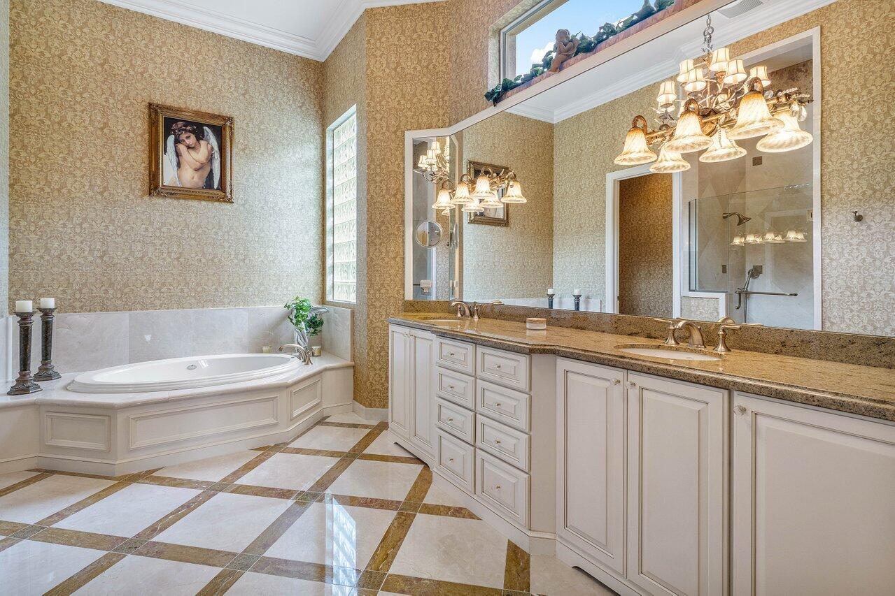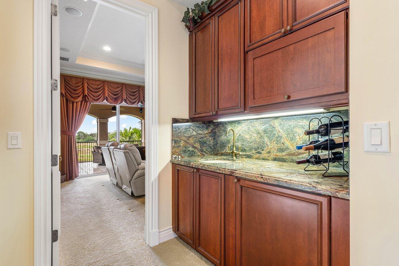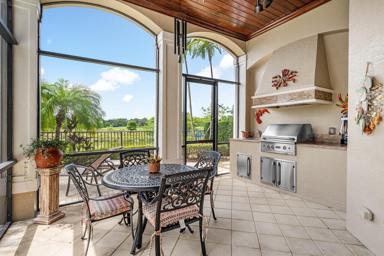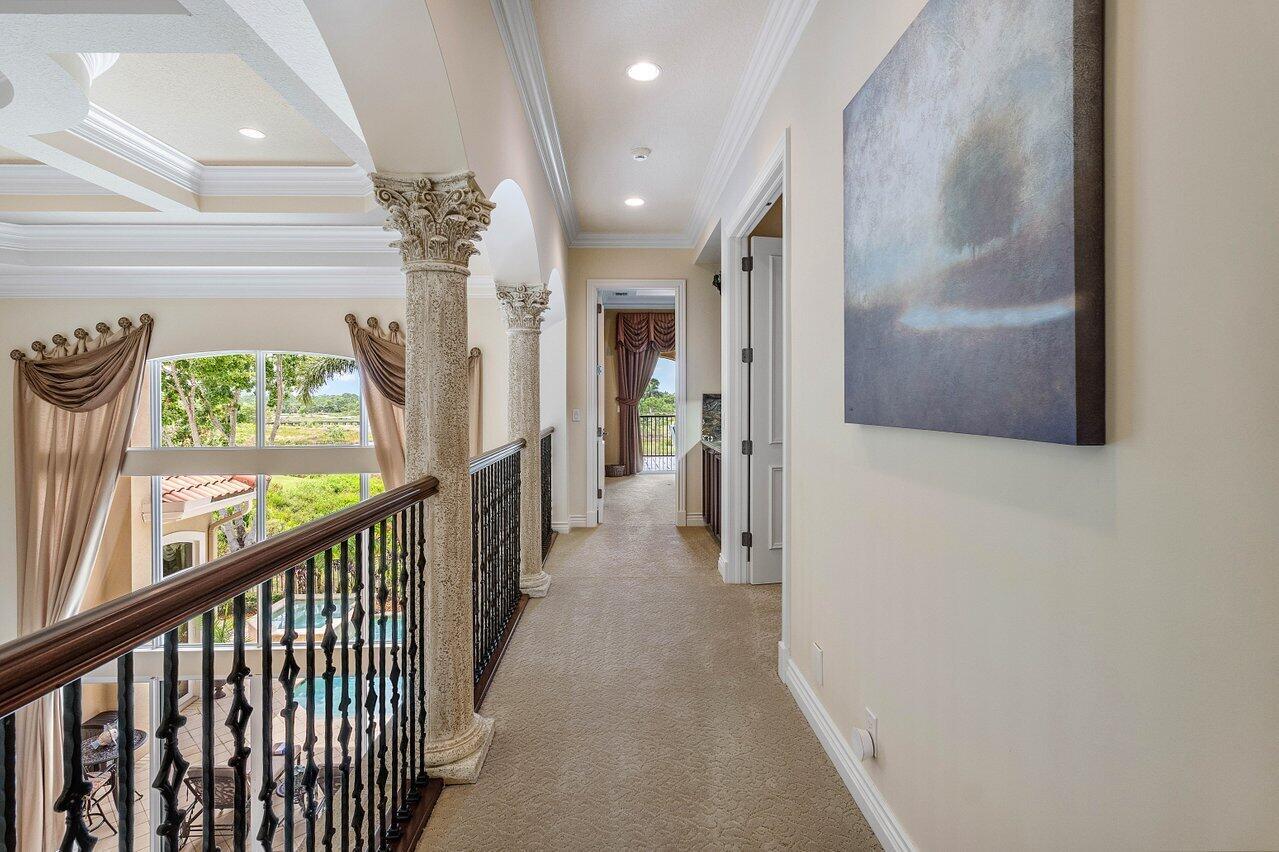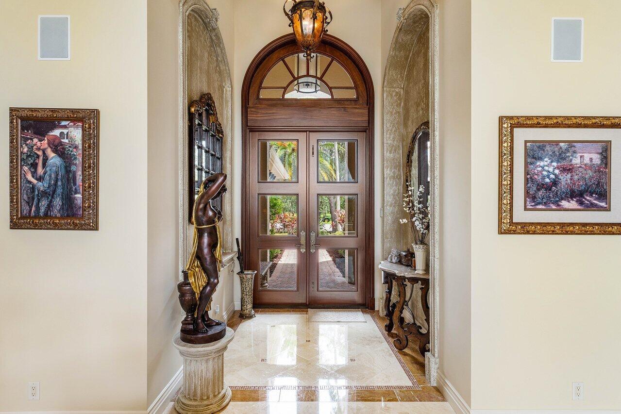 Overlooking the Tesoro River Preserve, this 2-story Custom Creation with 4 bedrooms, 4 en-suite baths, and 2 half-baths features distinctive scenic views of Water, Wildlife, Golf, and a park with moss-draped oak trees. This Spanish Revival home is a breathtaking sight, featuring soaring arched windows and entry foyer, carved wood and stone accents, 24-inch marble floors, natural stone, and abundant molding. Other distinctive details include all luxury brand appliances, a decorative Gas Fireplace, a 2nd-floor media room/Den, upstairs and downstairs laundry, a 3-zone AC system, a Whole-Home Audio System, Instant-on Hot Water, an AC Garage, a 1st-floor wet bar, and a 2nd-level breakfast bar. Enjoy the Beauty of the mature landscaping from the 2 screened-in loggias & a Heated Pool with Spa.